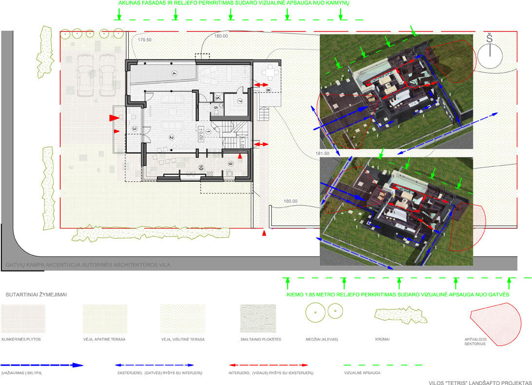 Вилла находится на угловом участке на перекрестке улиц и несет акцентную нагрузку. Участок представляет собой часть небольшого холма с перепадом высот 2,15 м. Программа виллы балансирует на грани роскоши и необходимости. Особое внимание отводится взаимосвязи внутренних пространств и рельефа участка, удобству вертикальных и горизонтальных коммуникаций, визуальным ощущениям.