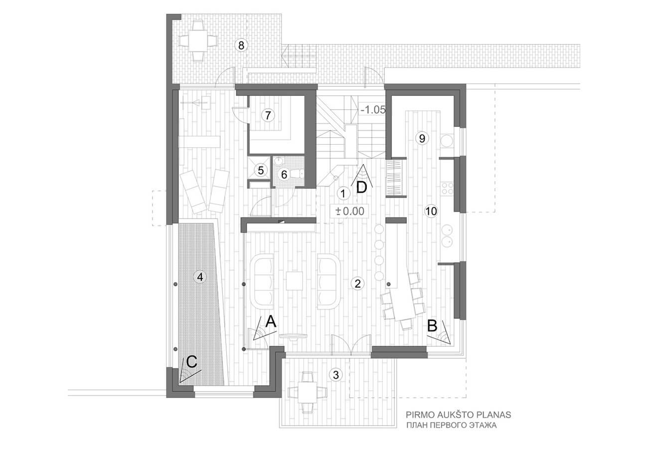 Первый этаж репрезентативный, с функцией релаксации. Перетекающее пространство кухни-столовой-гостиной-холла дополнено плавательным бассейном, что придает пространству современной роскоши и элитарности. Дополнительный бонус — баня и террасы. Дворовая терраса служит продолжением бани и соединяет пространство дома и участка. Гостиную продолжает терраса в виде подвешенной платформы, с которой открывается вид на окрестность.