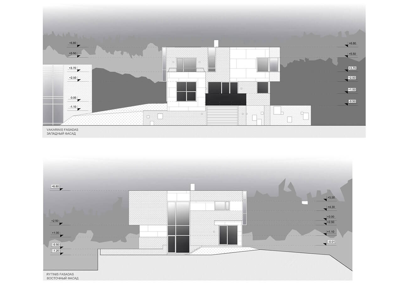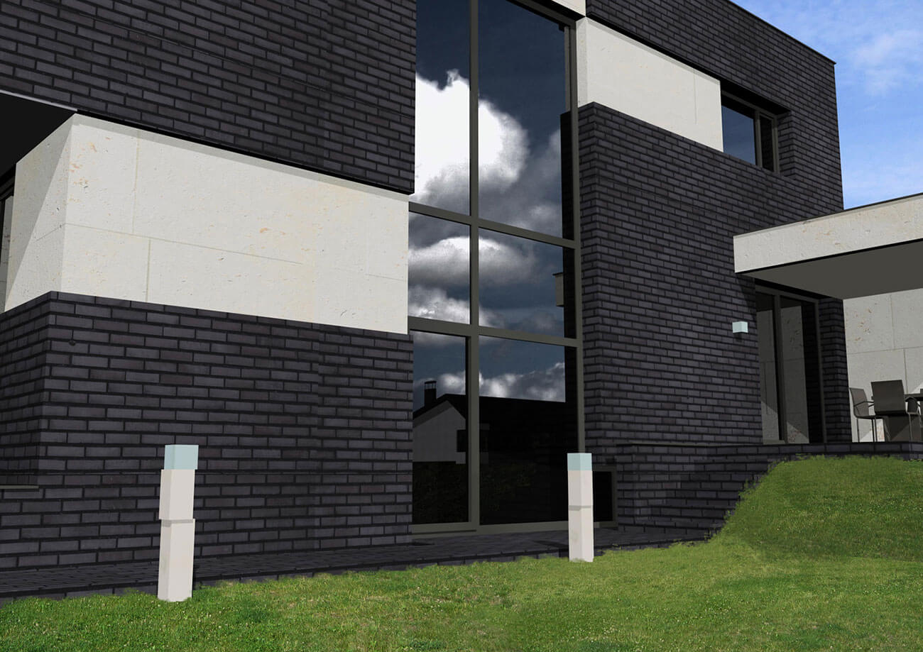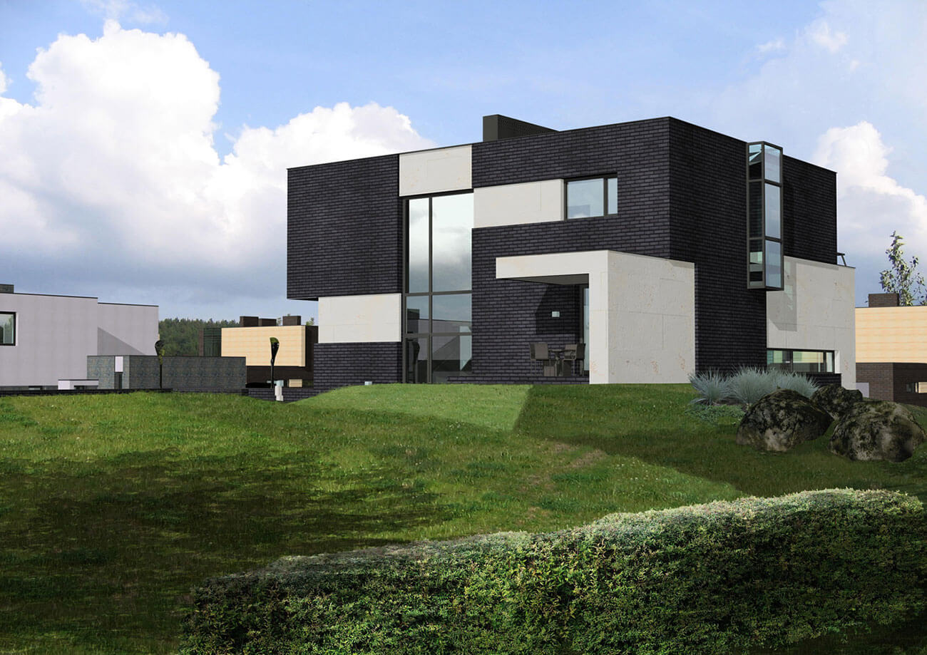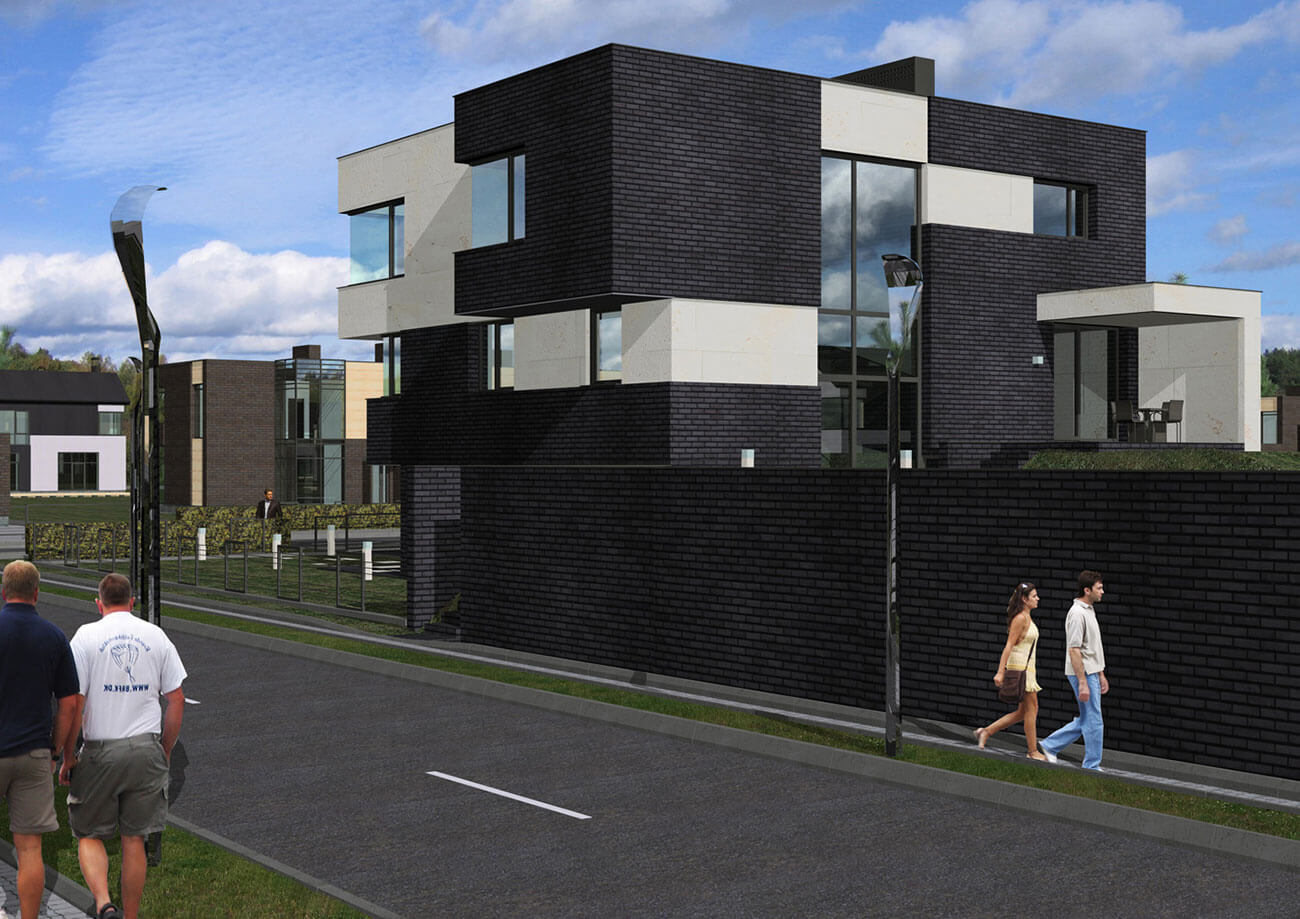 На сложную игру кубических объемов накладывается напластование контрастной взаимопроникающей отделки фасадов из темного фасадного кирпича и плит светлого песчаника. Третьим пластом в структуре дома оказываются оконные проемы в виде нерегулярной сетки разномасштабных прямоугольников. Так идейные наслоения дополняются материальными, создавая сложный, но строгий и лаконичный образ современной виллы.