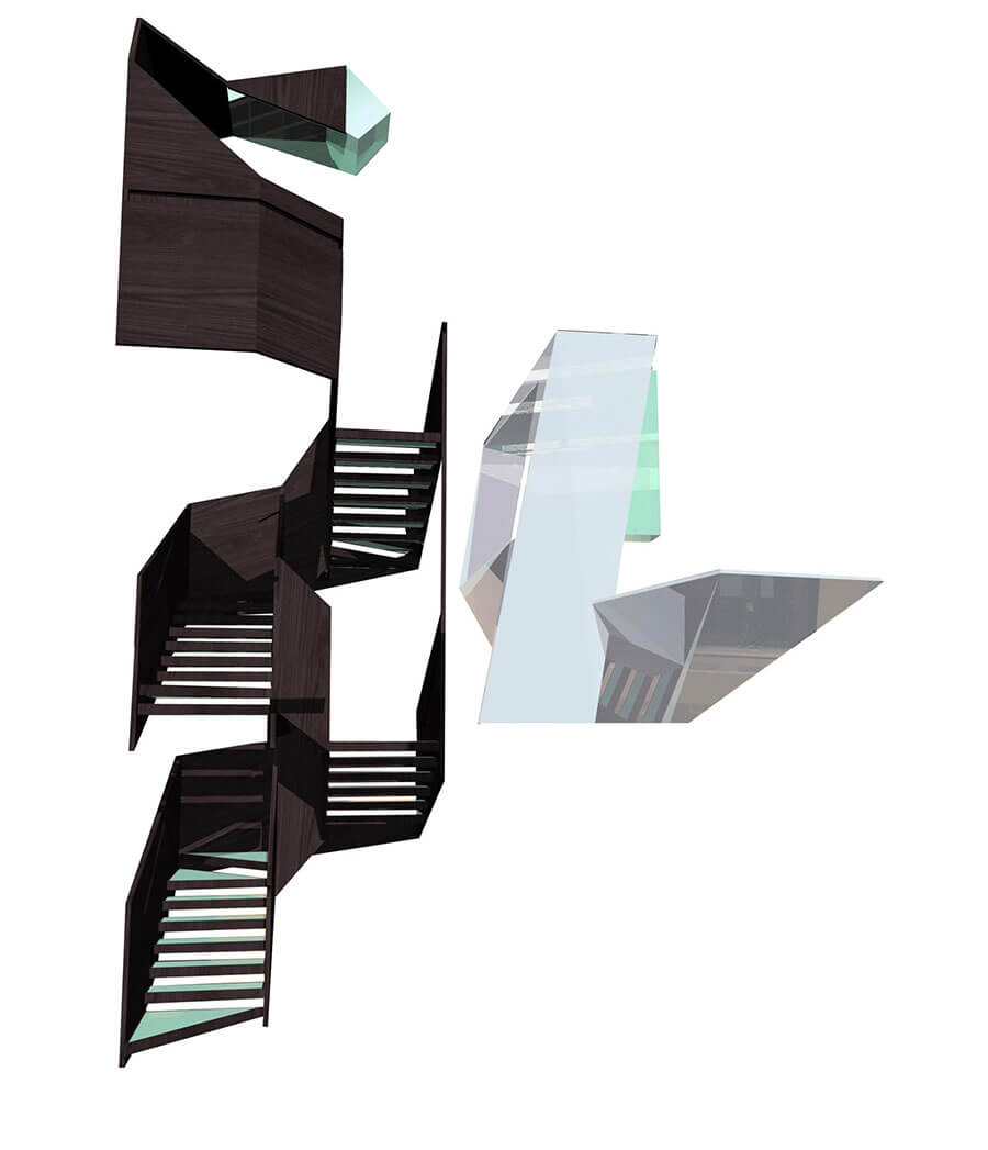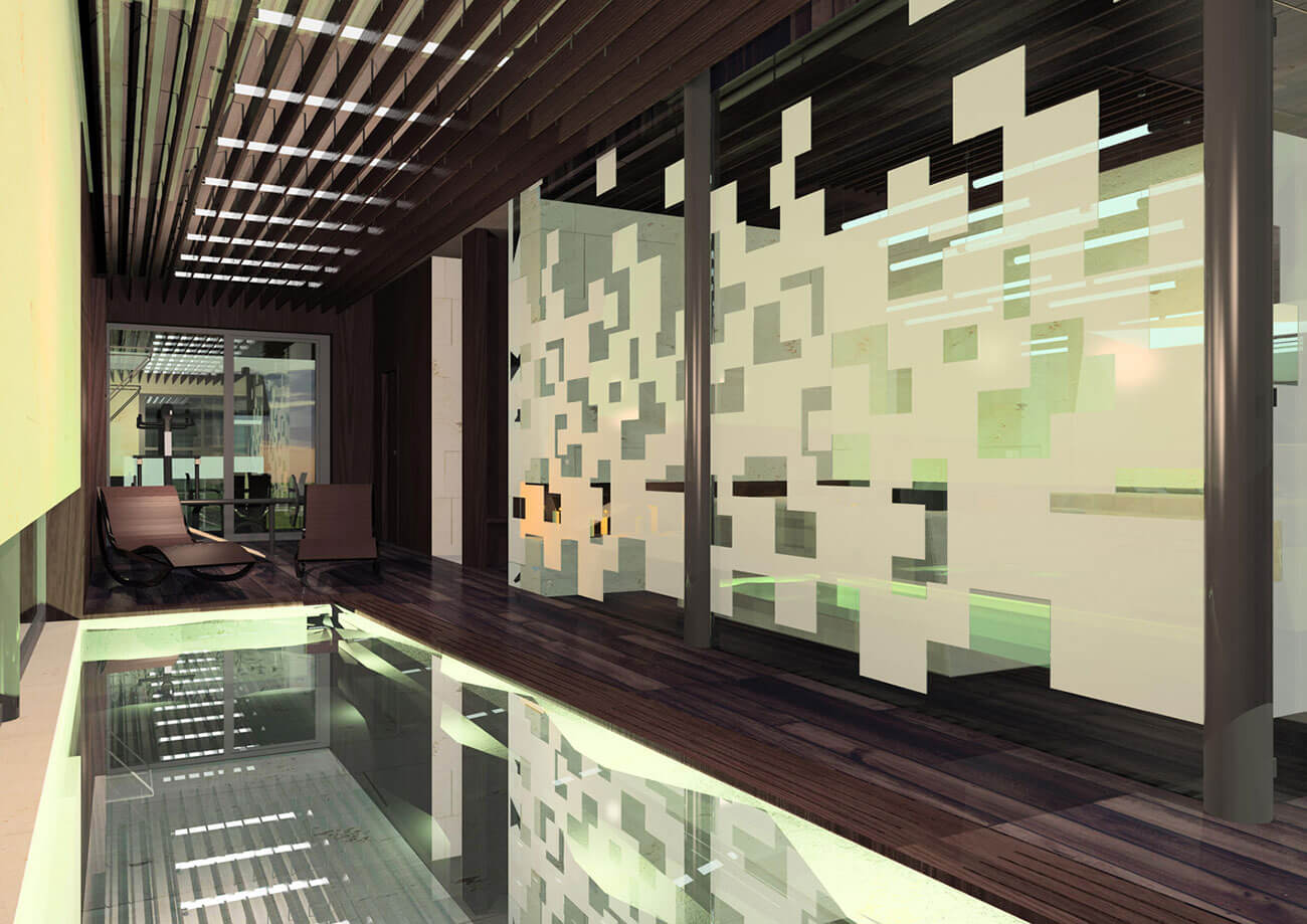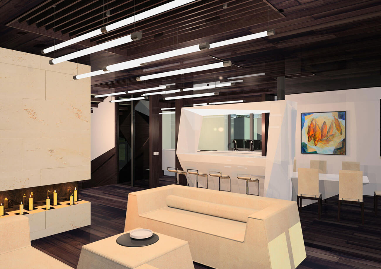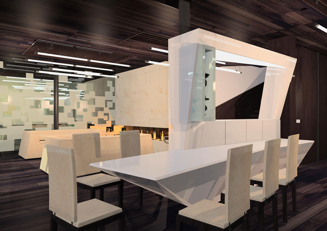 Эстетическое и логическое построение интерьера строится на симбиозе двух аспектов. Один — продолжение экстерьера в интерьере, то есть взаимопроникновение форм плоскостей материалов снаружи внутрь. Второй — акцентом интерьера является пространственная динамическая композиция «Мангуст и анаконда». «Мангуст» — барная стойка из белого кориана взаимодействует с «анакондой» — межэтажной спиральной лестницей из темной древесины.