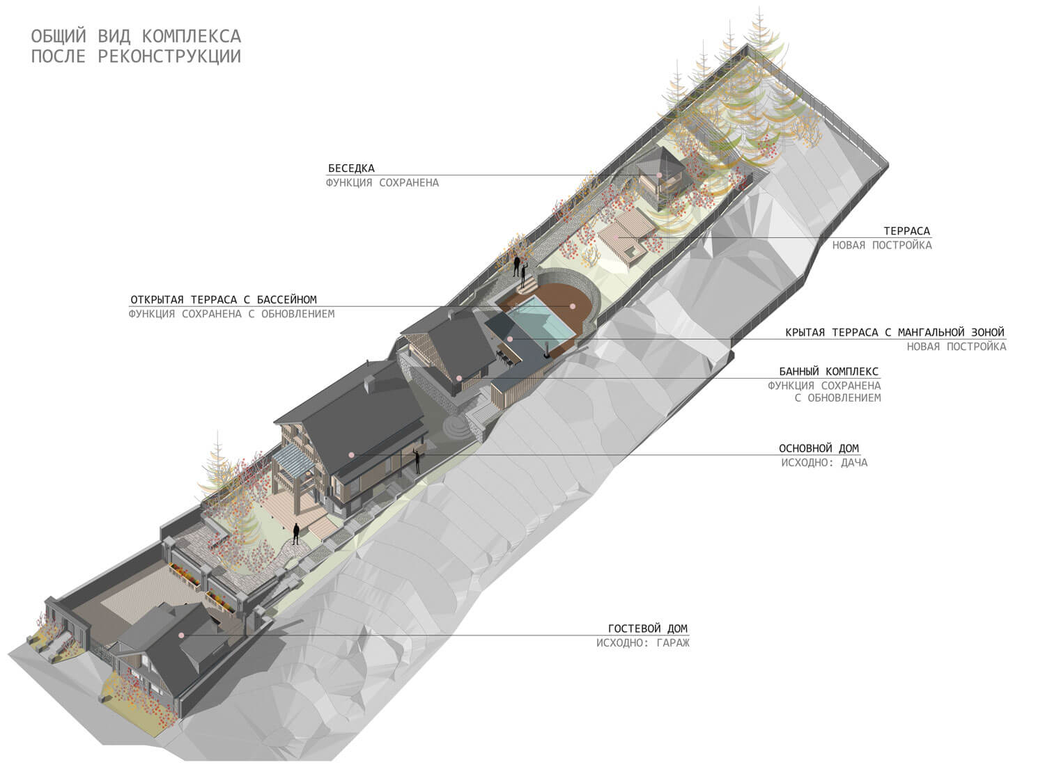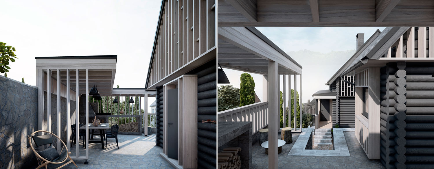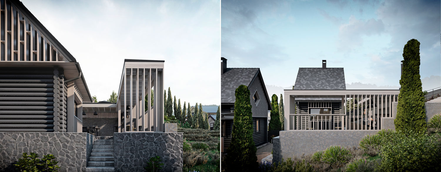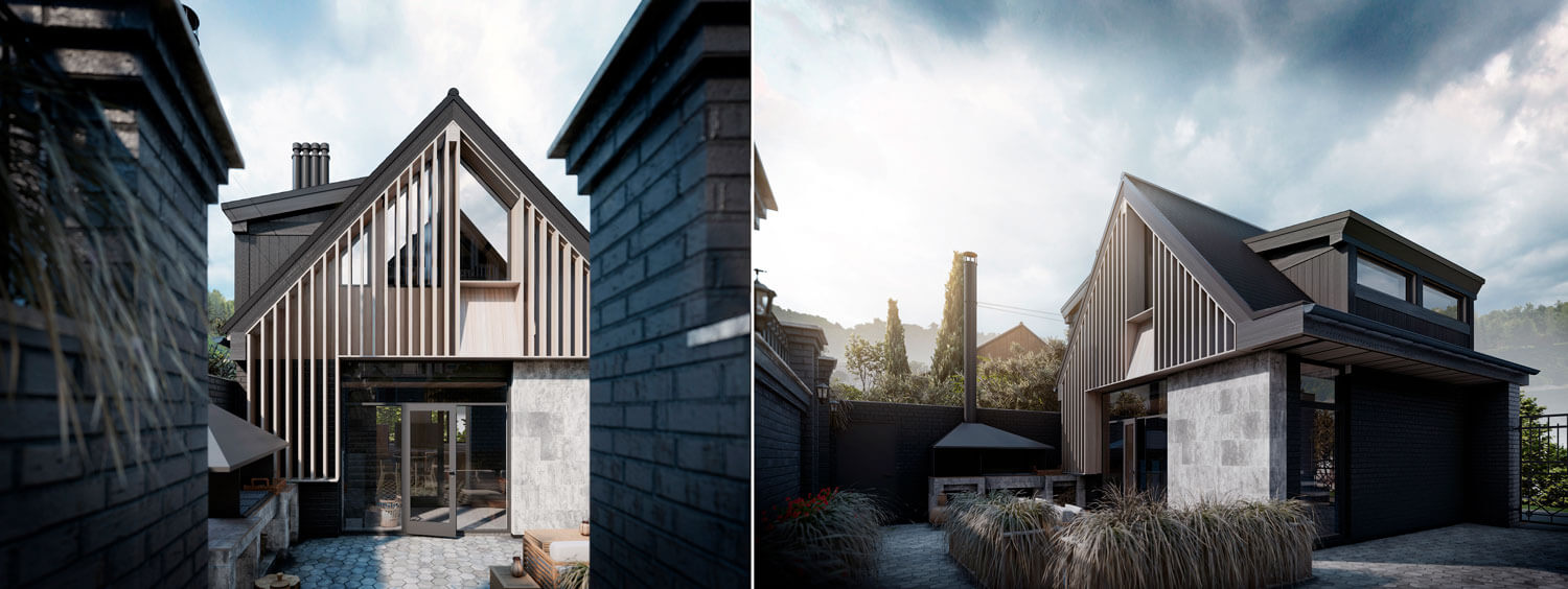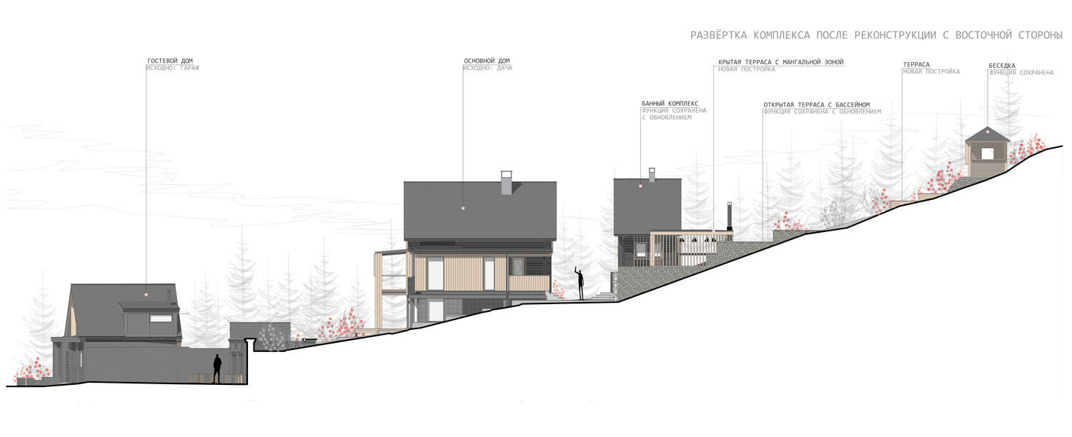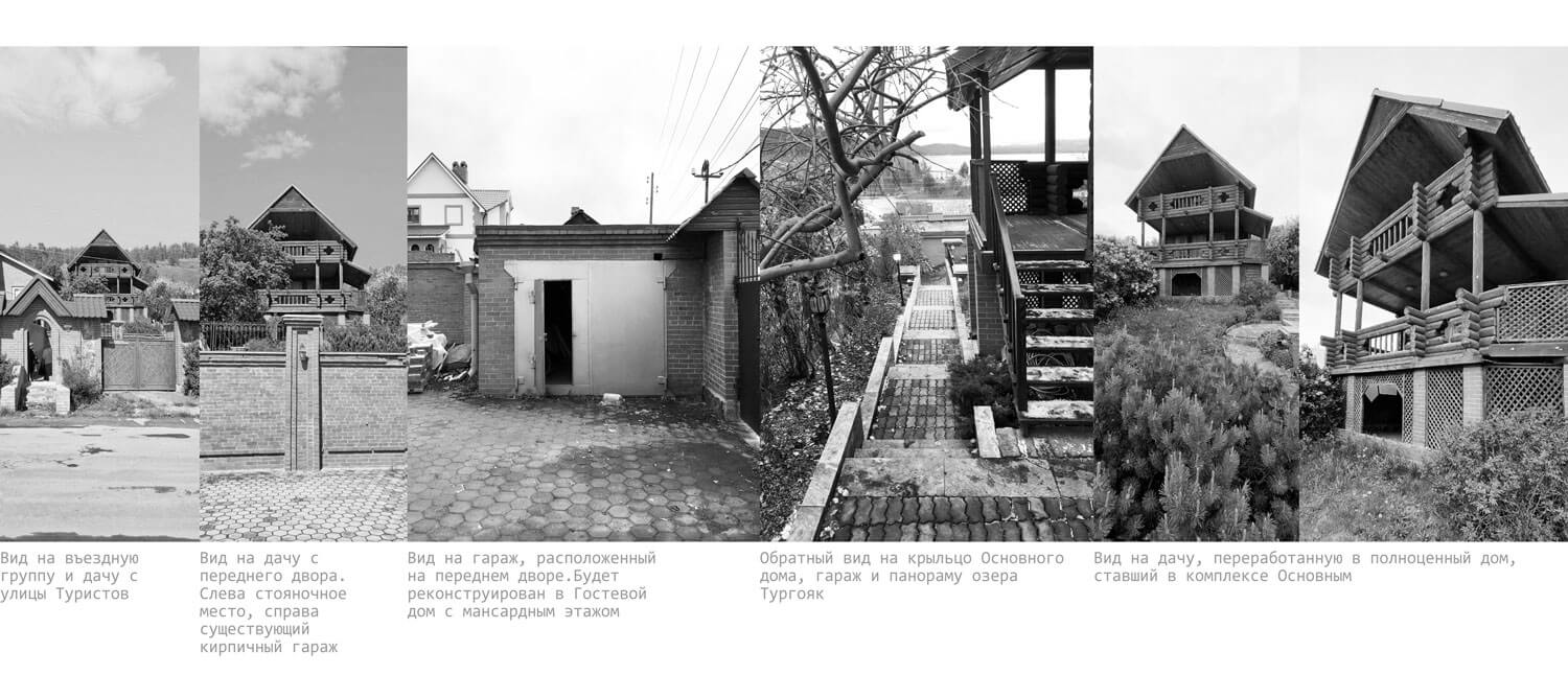 Участок располагается на склоне горы при озере Тургояк в городе Миасс. На участке имеется комплекс из существующих построек, возведённых двадцать один год назад. Комплекс состоит из трёх крупных объектов: кирпичного гаража при въезде, дачного дома с баней из бревна. Все объекты расположены на горизонтальных площадках в несколько уровней, следуя рельефу. Задача состояла в сохранении основных конструкций всех объектов, но с помощью небольших и осторожных изменений переработать их в объекты для постоянного комфортного использования и новой эстетической нагрузкой. Так, гараж был переработан в Гостевой дом, расширен и дополнен мансардным вторым этажом: на первом этаже расположилась студия, на втором этаже студия со спальней. Дачный дом был перепланирован и превращён Основной дом, в котором были предусмотрены отсутствующие помещения для удобного постоянного проживания, а также расширен за счёт имеющейся террасы на каждом из двух этажей. Здание Банного комплекса претерпело минимальное количество планировочных изменений и было дополнено крытой террасой с обеденной зоной при существующей печи с мангалом. Верхняя часть отдана под рекреационную зону с открытой террасой, бассейном и беседкой. Имеющиеся на участке элементы из красного кирпича, что с течением времени приобрёл хаотичные оттенки, окрашены в чёрный цвет, через который удалось увязать всё многообразие использованных отделочных материалов ландшафте. Кроме того, весь комплекс обрёл единую эстетику благодаря использованию навесного деревянного декора, а также развил игру существующих объектов и многоплановость всей композиции.