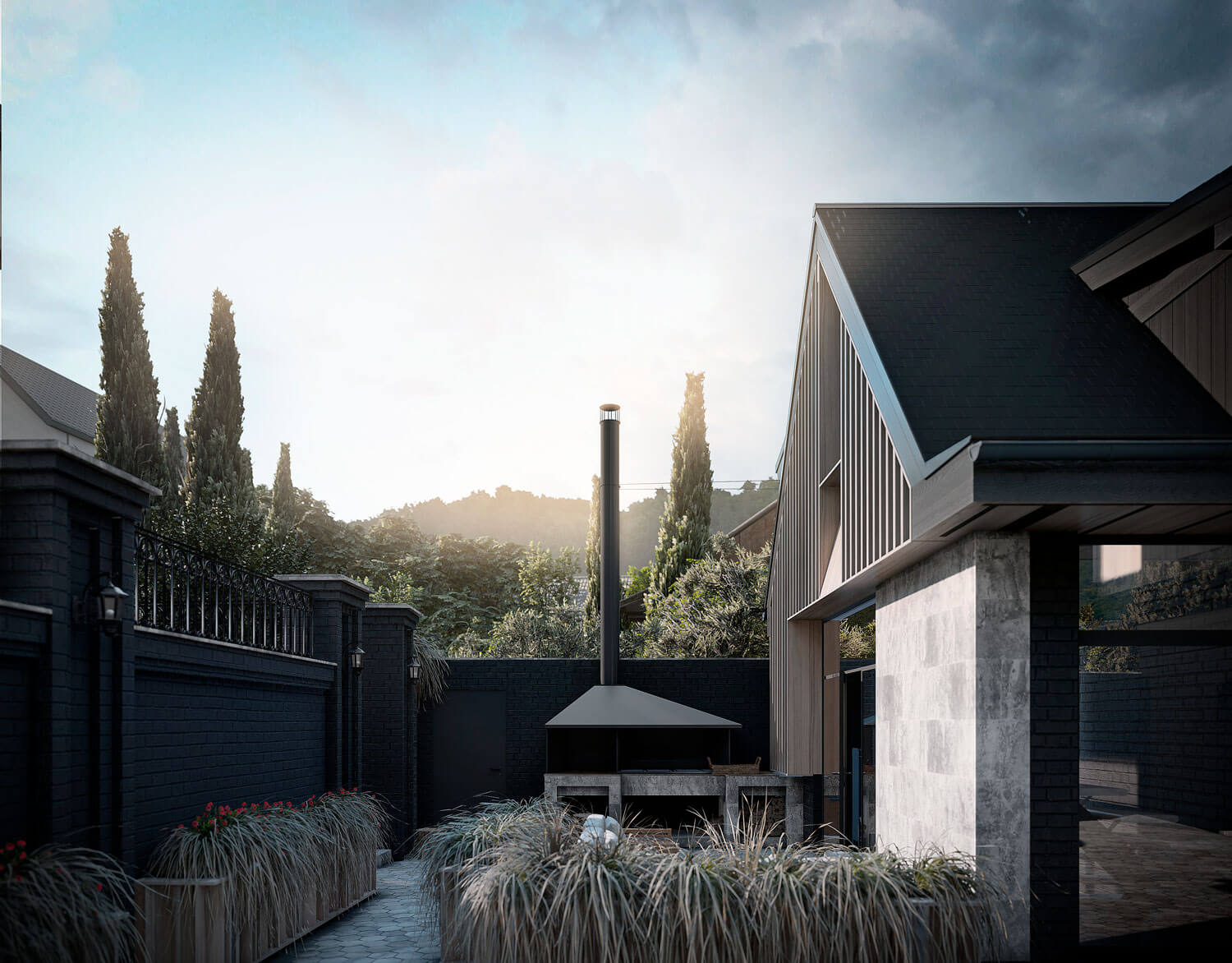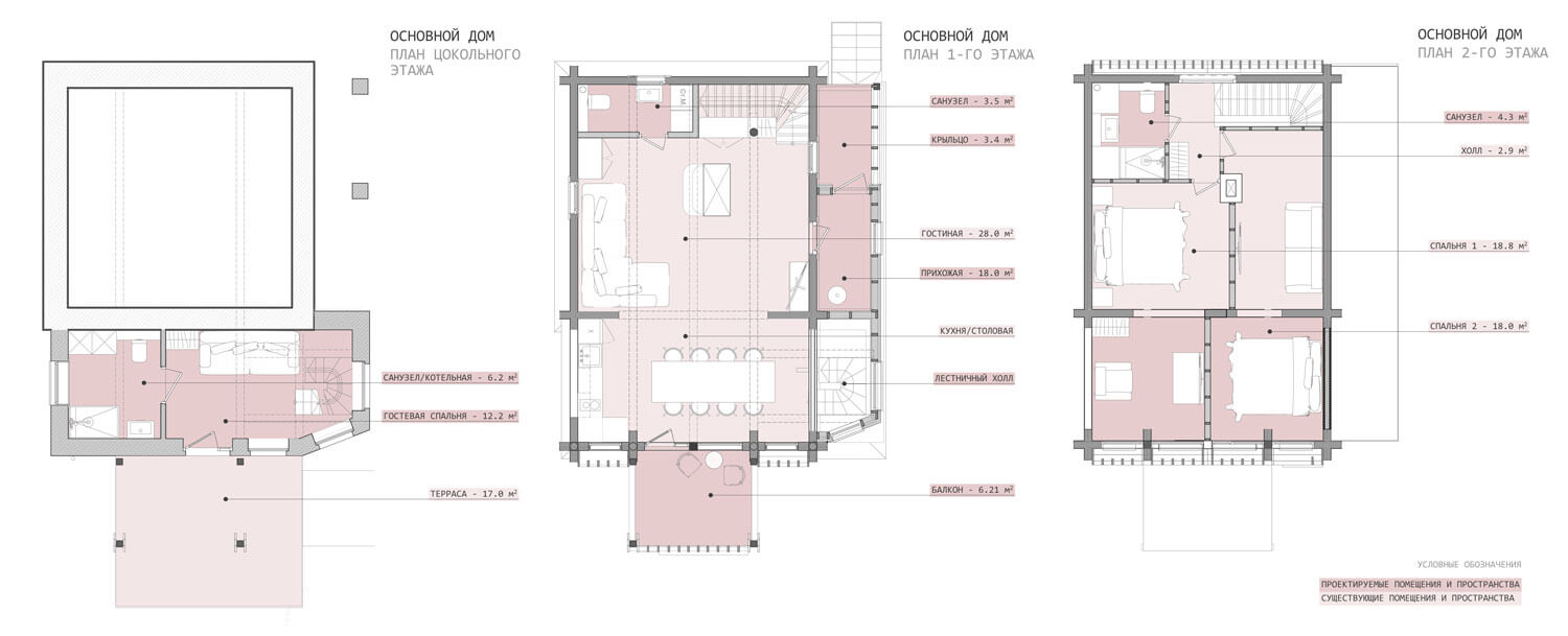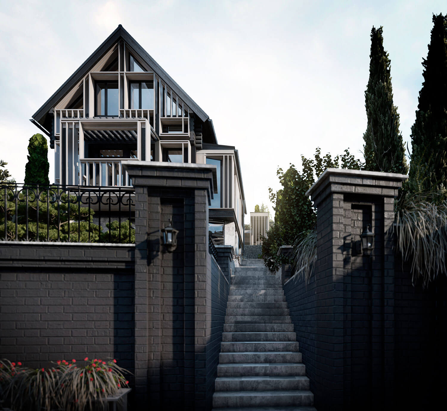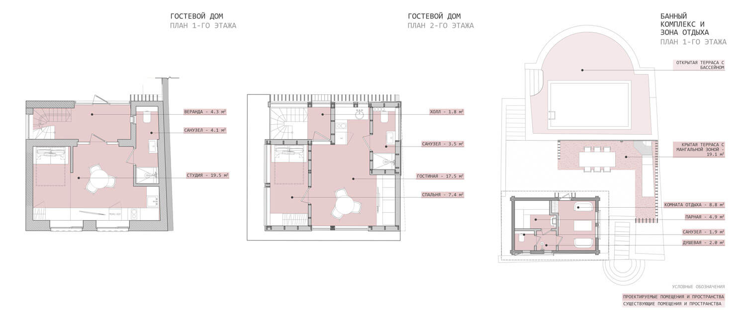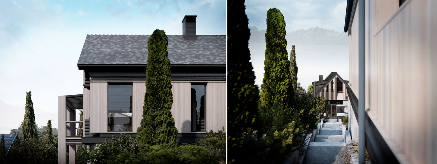 Участок располагается на склоне горы при озере Тургояк в городе Миасс. На участке имеется комплекс из существующих построек, возведённых двадцать один год назад. Комплекс состоит из трёх крупных объектов: кирпичного гаража при въезде, дачного дома с баней из бревна. Все объекты расположены на горизонтальных площадках в несколько уровней, следуя рельефу. Задача состояла в сохранении основных конструкций всех объектов, но с помощью небольших и осторожных изменений переработать их в объекты для постоянного комфортного использования и новой эстетической нагрузкой. Так, гараж был переработан в Гостевой дом, расширен и дополнен мансардным вторым этажом: на первом этаже расположилась студия, на втором этаже студия со спальней. Дачный дом был перепланирован и превращён Основной дом, в котором были предусмотрены отсутствующие помещения для удобного постоянного проживания, а также расширен за счёт имеющейся террасы на каждом из двух этажей. Здание Банного комплекса претерпело минимальное количество планировочных изменений и было дополнено крытой террасой с обеденной зоной при существующей печи с мангалом. Верхняя часть отдана под рекреационную зону с открытой террасой, бассейном и беседкой. Имеющиеся на участке элементы из красного кирпича, что с течением времени приобрёл хаотичные оттенки, окрашены в чёрный цвет, через который удалось увязать всё многообразие использованных отделочных материалов ландшафте. Кроме того, весь комплекс обрёл единую эстетику благодаря использованию навесного деревянного декора, а также развил игру существующих объектов и многоплановость всей композиции.