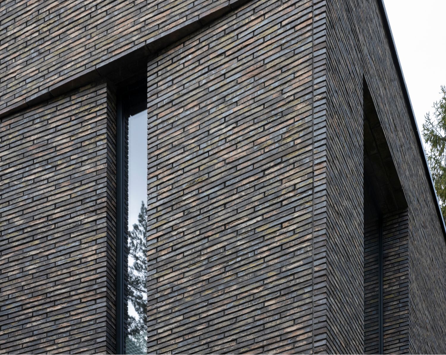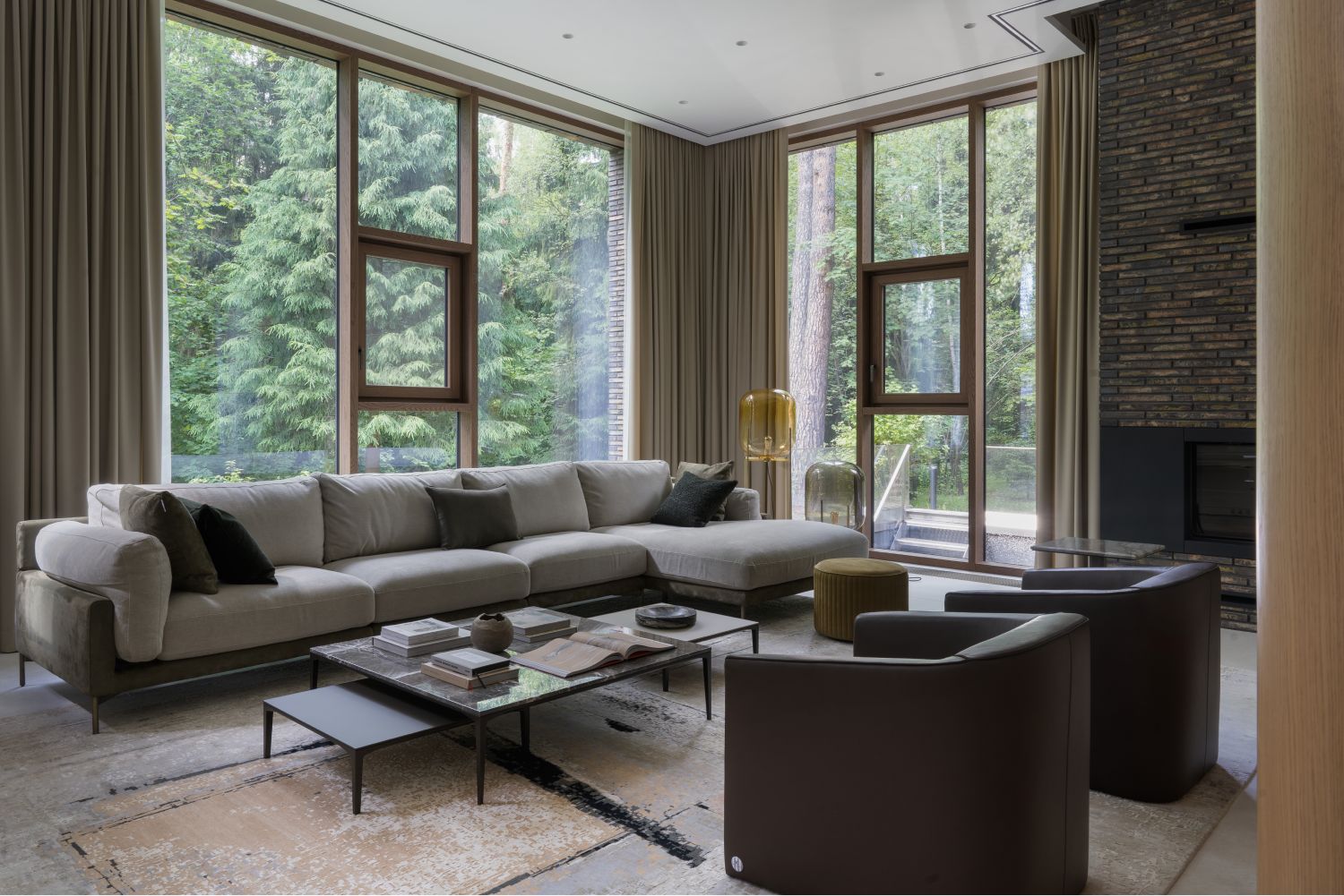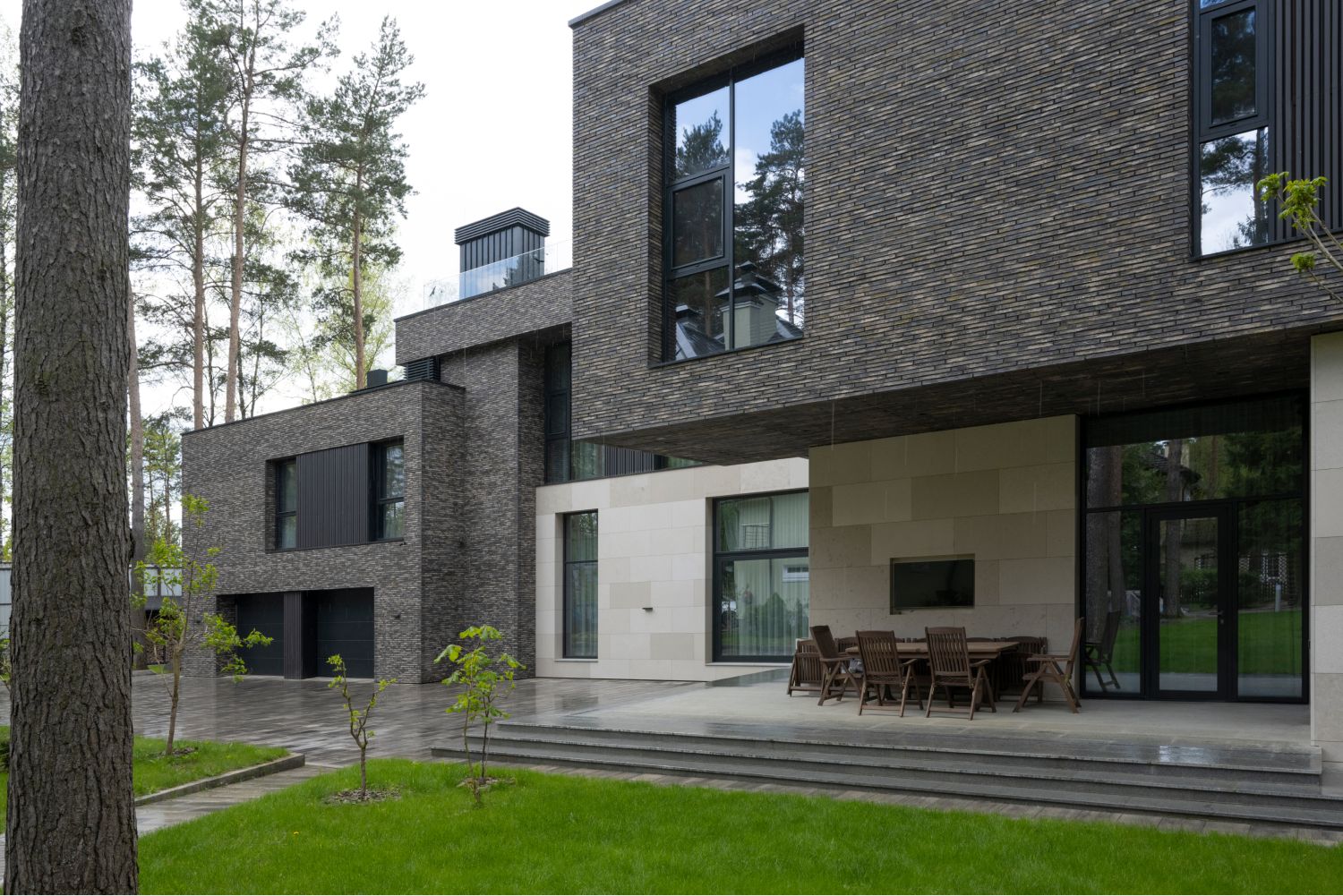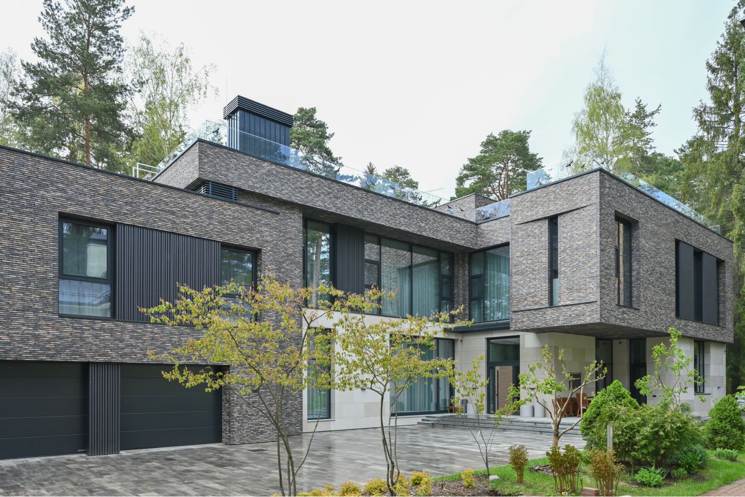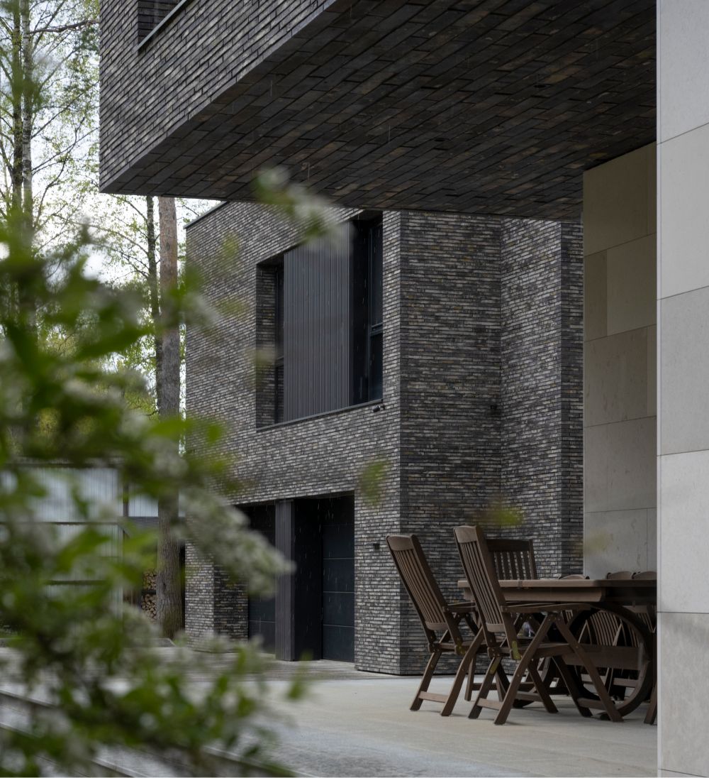 В отделке фасадов использует датский ригельный кирпич, чей тёплый бежевый тон с глазурованной поверхностью также созвучен лесному окружению, керамические панели, обеспечивающие долговечность и простоту ухода, а также португальский известняк, акцентирующий входные зоны первого этажа. Подчёркивая разные уровни дома, эти материалы создают гармонию текстур и природной палитры.