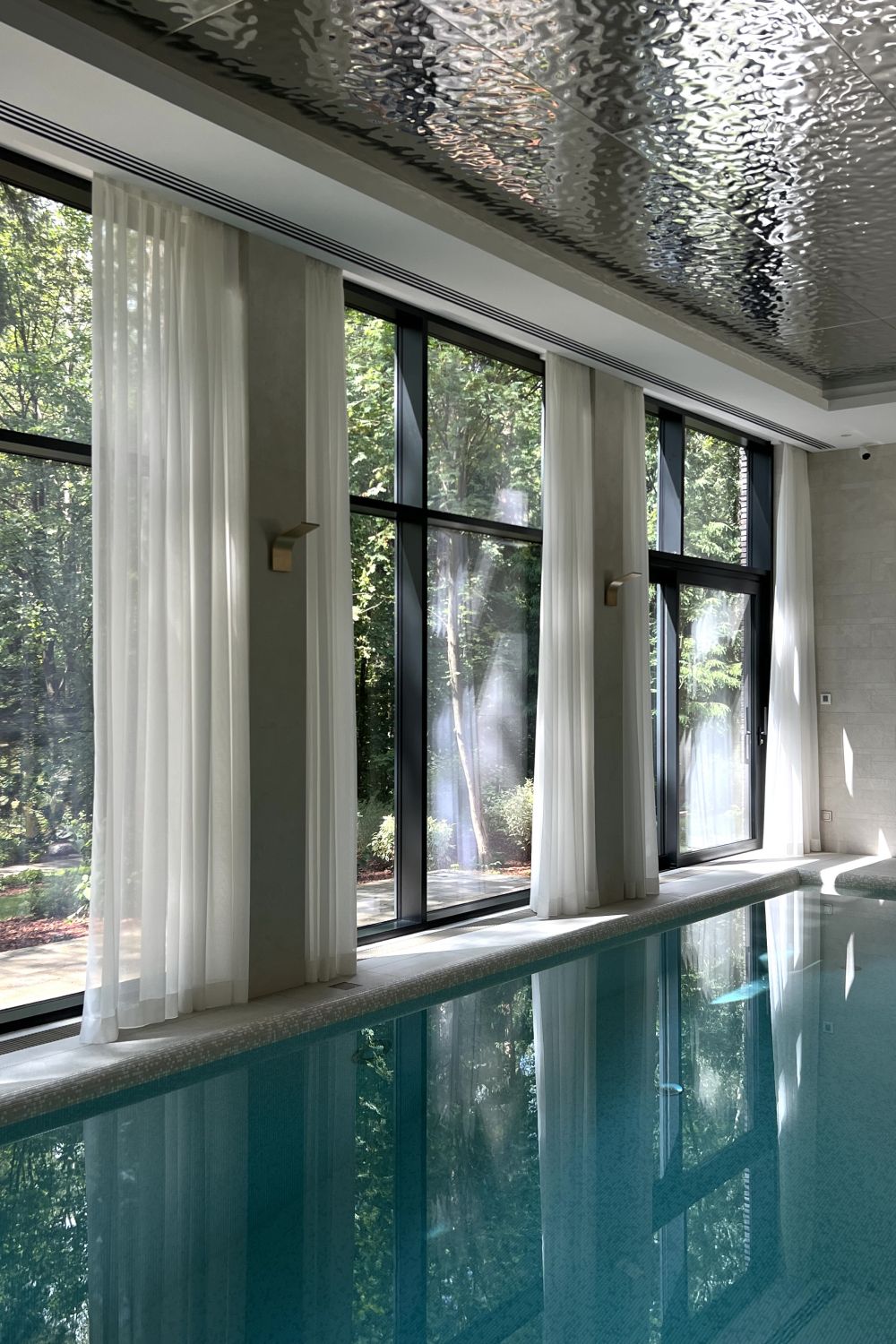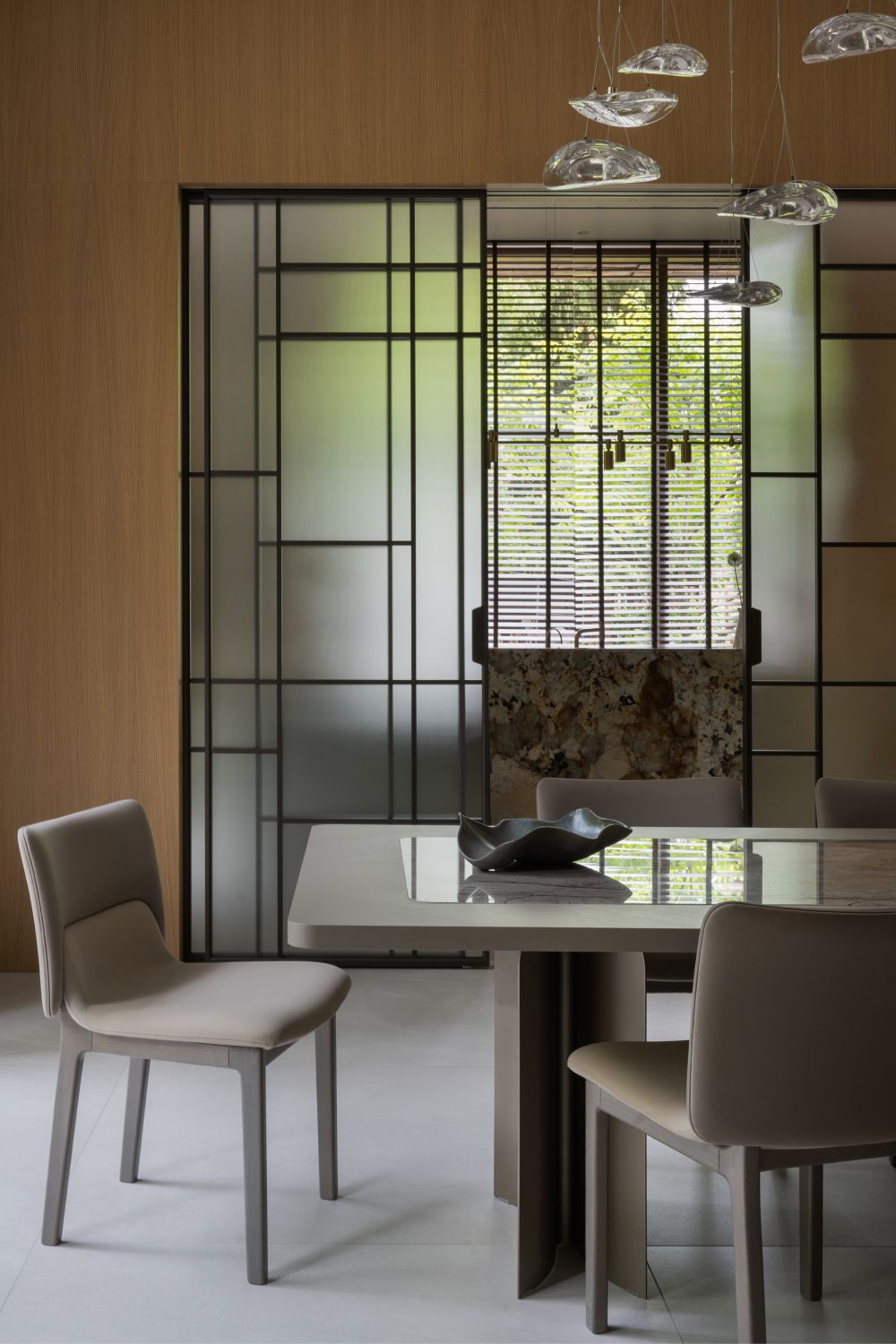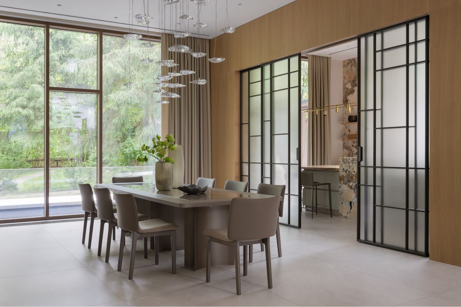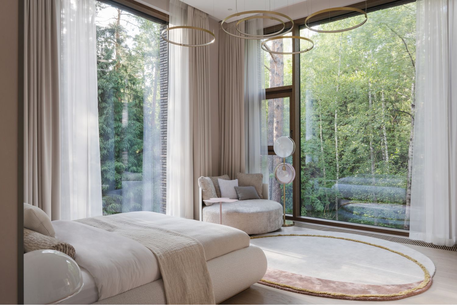 В отделке фасадов использует датский ригельный кирпич, чей тёплый бежевый тон с глазурованной поверхностью также созвучен лесному окружению, керамические панели, обеспечивающие долговечность и простоту ухода, а также португальский известняк, акцентирующий входные зоны первого этажа. Подчёркивая разные уровни дома, эти материалы создают гармонию текстур и природной палитры.