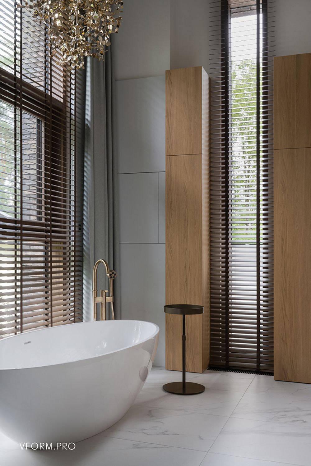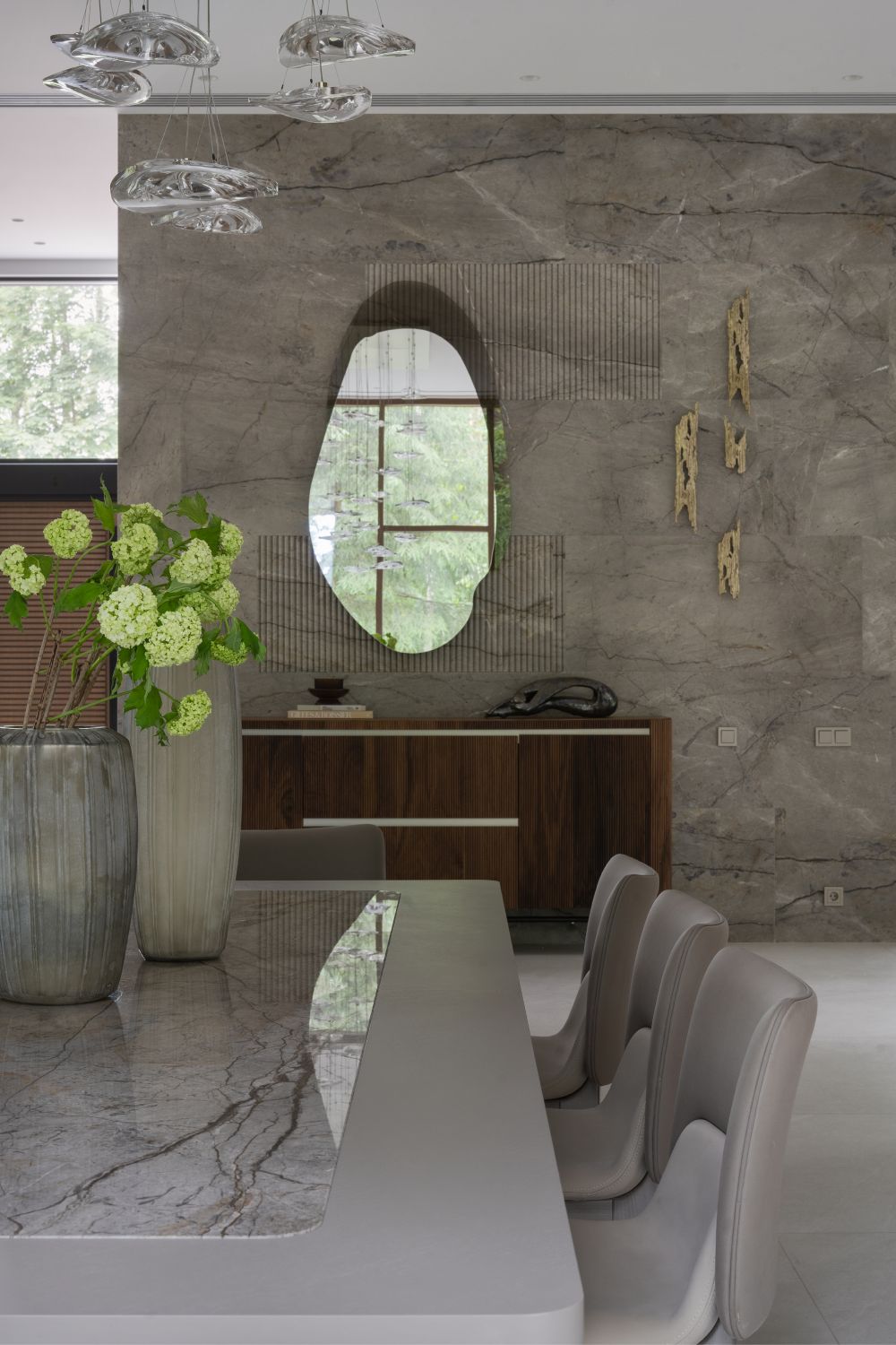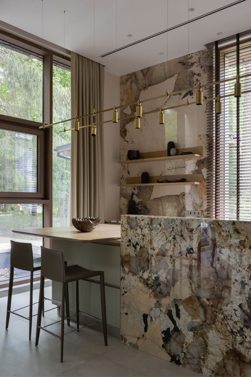Теплая палитра продолжает звучание и в отделке интерьеров. Натуральный камень, дерево, латунные вставки и отдельные цветовые акценты поддерживают основную тему природного окружения, буквально наполняя пространство для жизни гармонией, теплом и светом. Лаконичность оформления соседствует с аксессуарами сложной формы, дополняя индивидуальностью оформление общих зон первого этажа и спален, расположенных на втором.