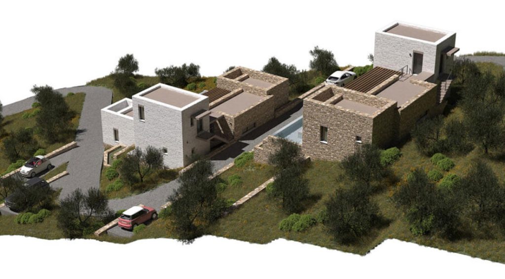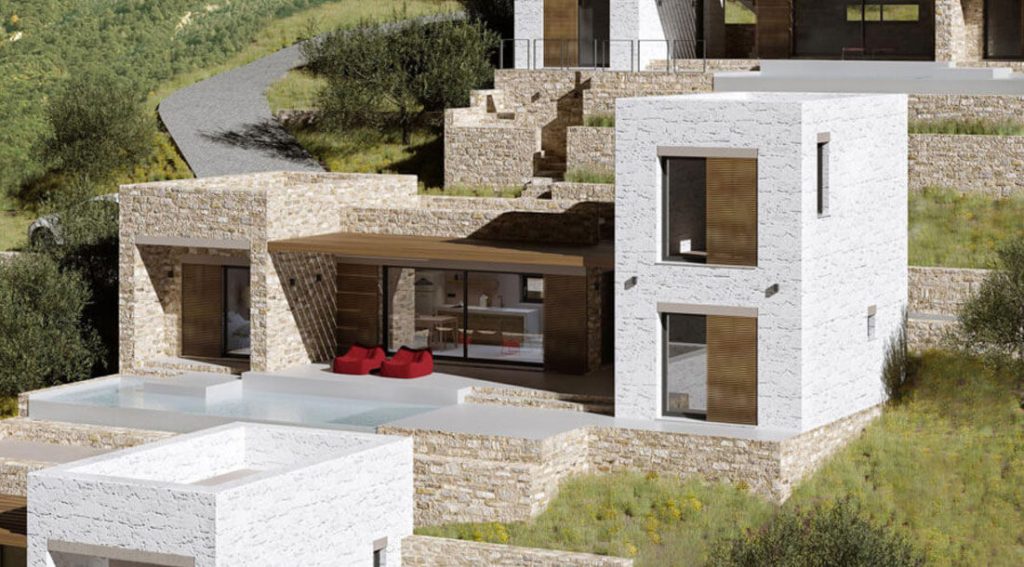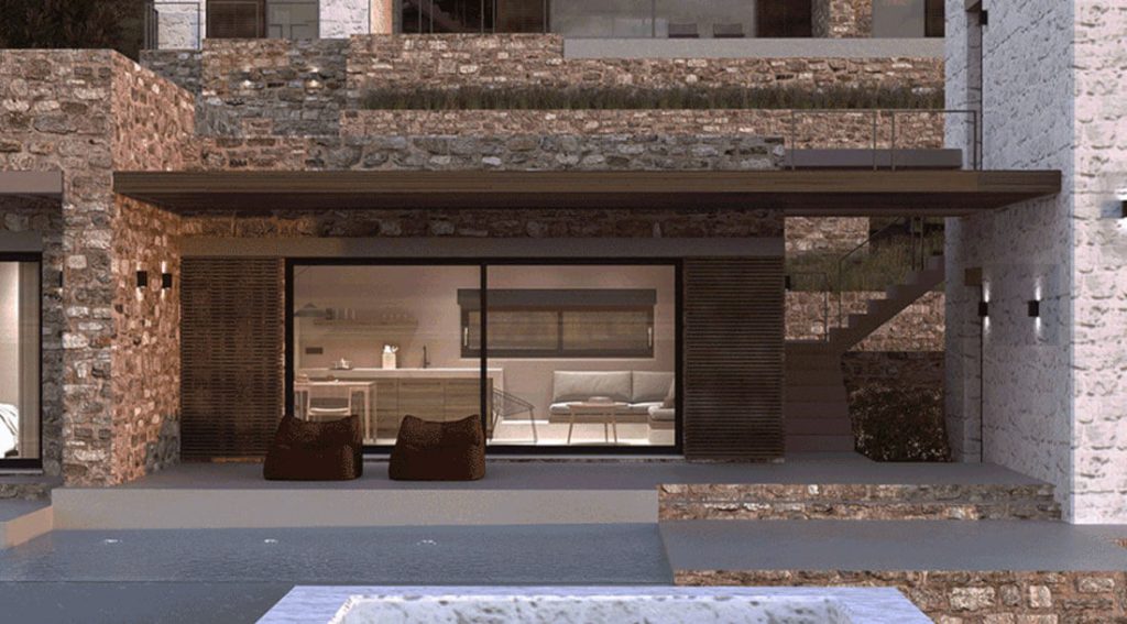 Натуральный камень — главный материал проекта и его тектоника. Наружные стены облицованы местным известняком/песчаником рваной фактуры с тонкой известковой расшивкой. Непрерывность каменной оболочки поддержана тем, что тот же камень формирует подпорные стены террас, лестницы, борта бассейнов и цоколи: архитектура плавно переходит в ландшафт, а здания читаются как часть скального массива. Белые объёмы выполнены из камня с тонкой дробеструйной обработкой и известковым покрытием — графический контраст к тёплым охрам основной кладки.