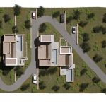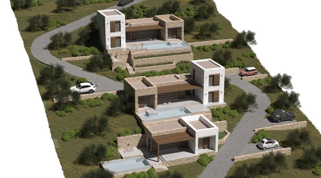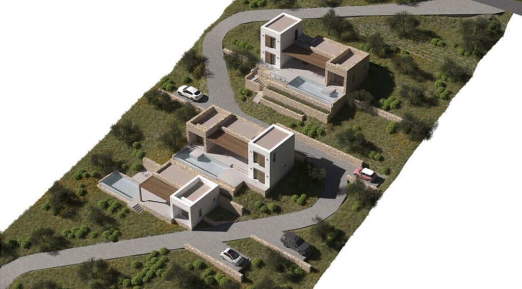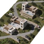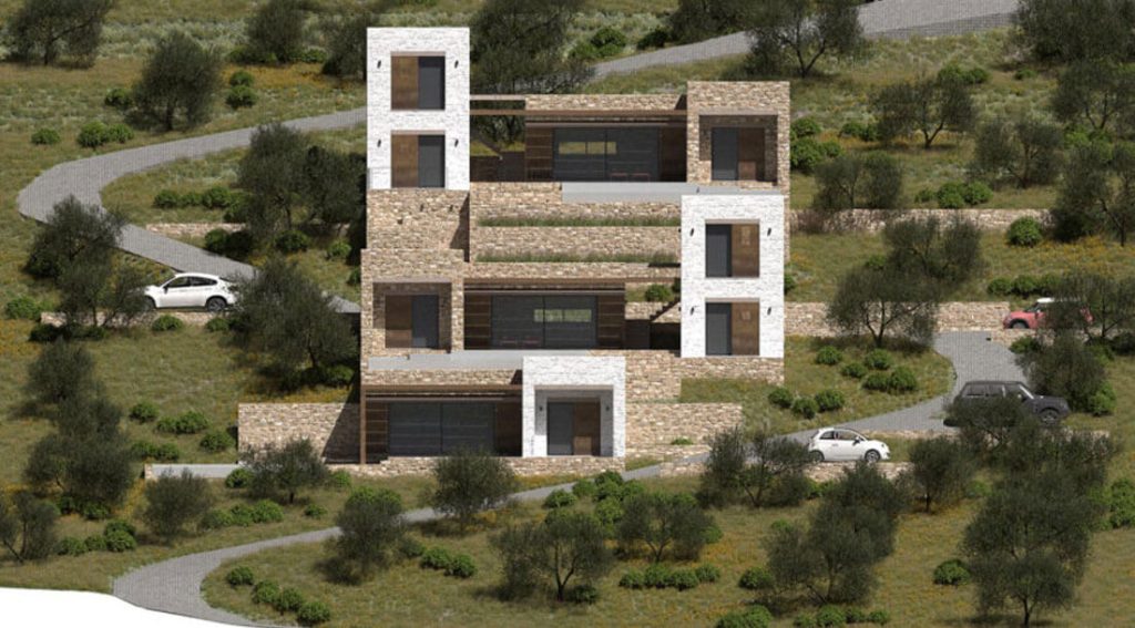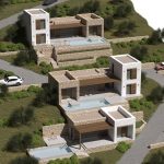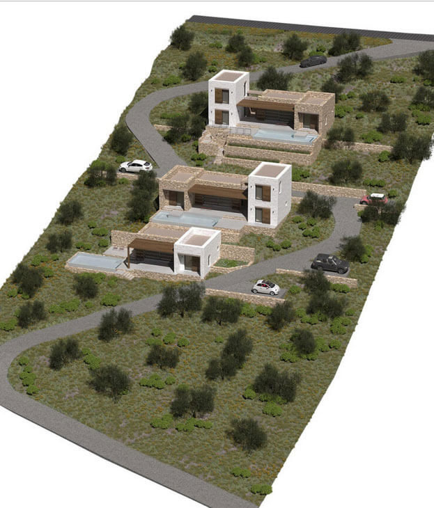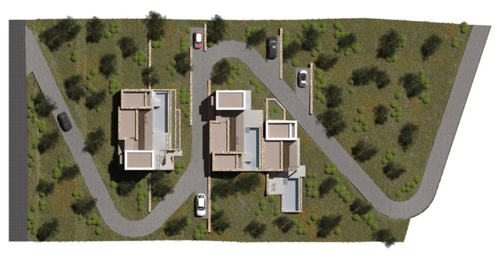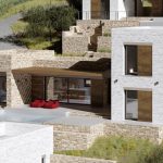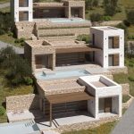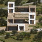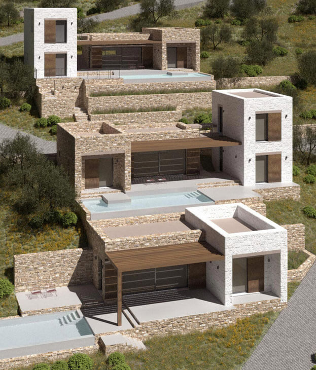 Проект террасной виллы формирует образ архитектуры, «выросшей» из склона. Объёмы разнесены по уступам рельефа и собраны из двух типов призм: монолитные каменные блоки и белые «башни»-акценты. Между ними — глубокие порталы остекления, горизонтальные навесы и деревянные перголы, создающие плотную игру света и тени.