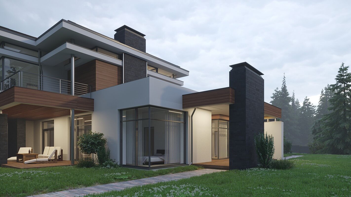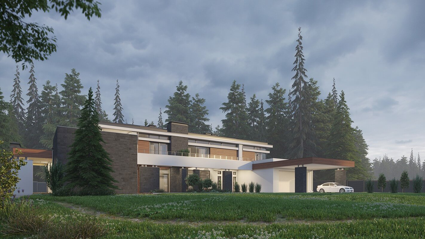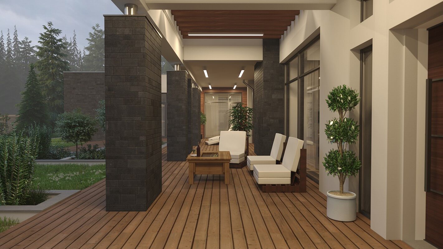 Рядом с парадным входом планируется расположить «зону воды», организованную вокруг композиции с уличным водоемом. Из основных помещений дома есть выход на главную террасу и балконы, где предложено расставить кашпо с цветочными композициями.