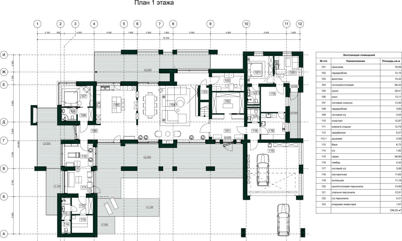Загородный дом расположен в уже готовом поселке в окружении соседских участков, разнообразных по форме и стилю. Дом спрятан в глубине участка, в широкой его части — очень компактно, несмотря на внушительный объем внутренних пространств. Такое расположение позволило позднее пристроить к основному объему спа-комплекс с бассейном и организовать множество функциональных зон вокруг дома. Здесь расположены плодовый сад, огород, детская площадка, декоративный сад, несколько зон отдыха на главной террасе и во внутреннем дворе, скульптурные композиции и декоративные группы растений разных видов.