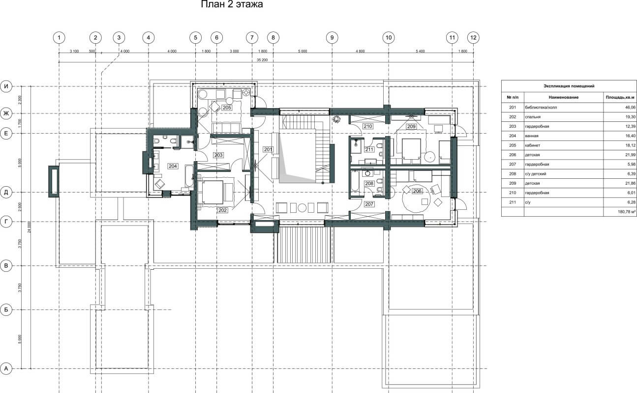 Внутреннее пространство 1-го этажа функционально разделено на две части: общественную, состоящую из гостиной-столовой и кухни, и приватную жилую зону гостевого блока с вспомогательными помещениями. На втором этаже — большой атриум с библиотекой, жилая зона хозяев дома и детские. В оформлении интерьера использованы современные материалы с необычными фактурами: сланец, натуральные породы дерева, металл, декоративные панели и штукатурка. В качестве основы стилистической концепции жилой среды выбрали современную классику в продолжение интерпретации современной виллы.