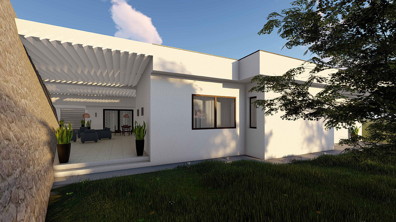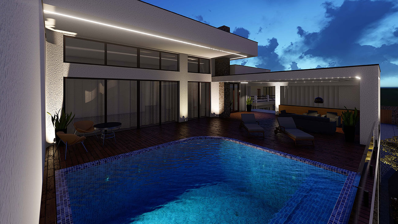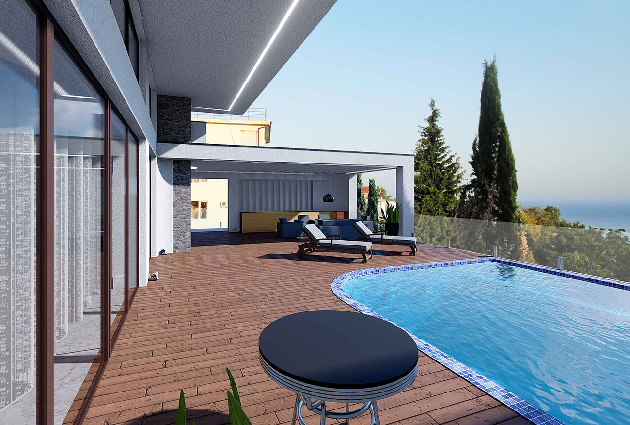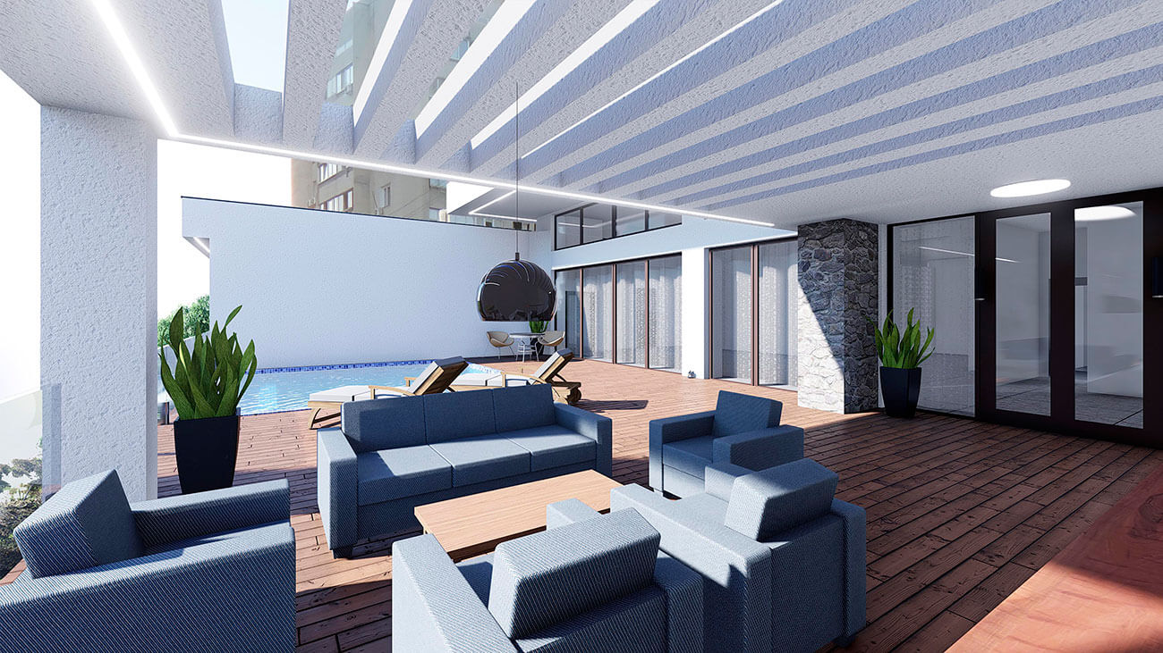 Концепция пространства построена на том, что вся активная жизнь семьи должна протекать на обширной террасе перед домом. Тут расположен переливной бассейн, беседка с зоной барбекю. С торцов террас жильцы защищены спальней и жалюзи из дерева. Также есть и задний дворик, который можно использовать в жаркое время суток или когда несколько компаний решили уединиться друг от друга.