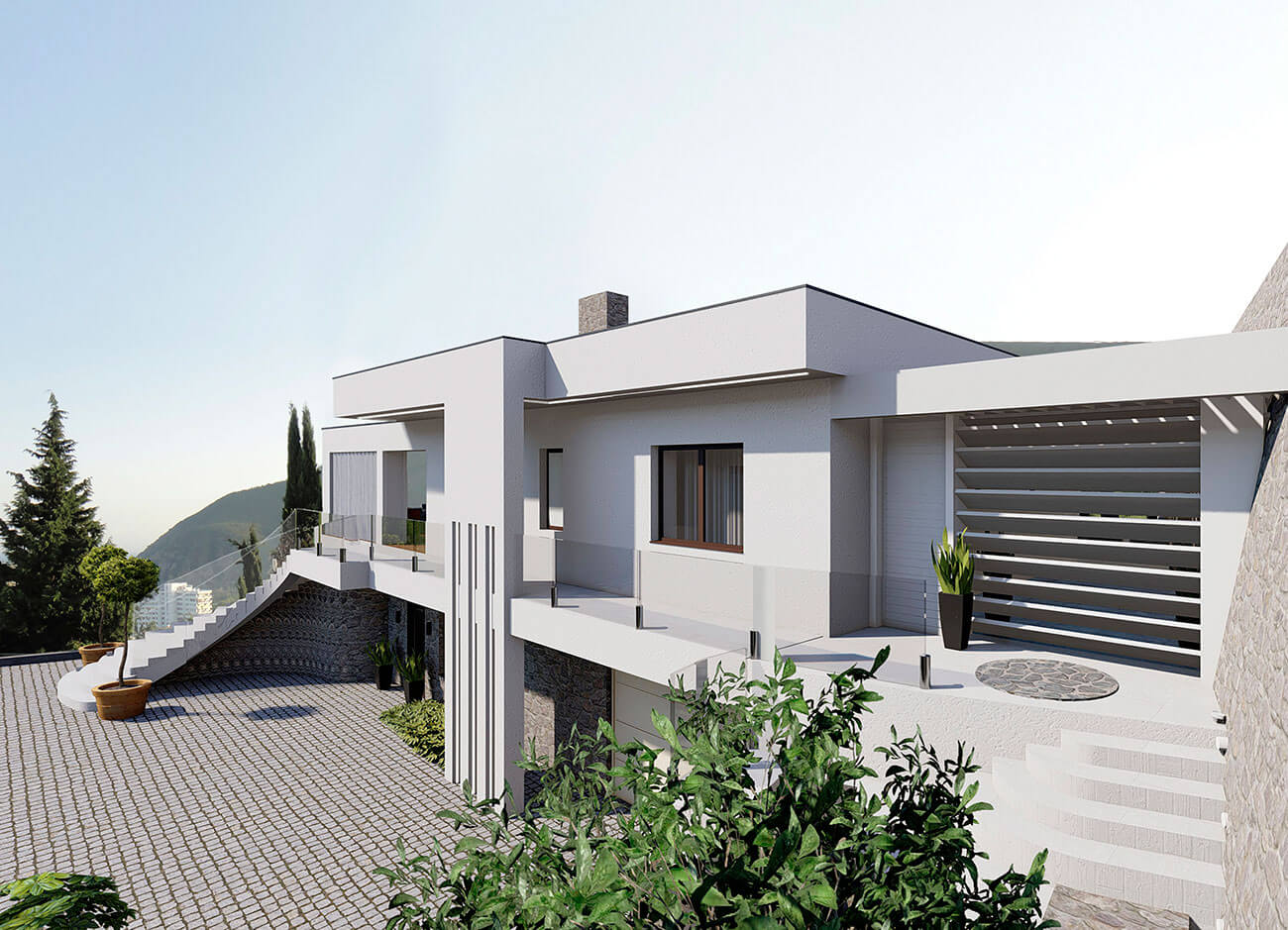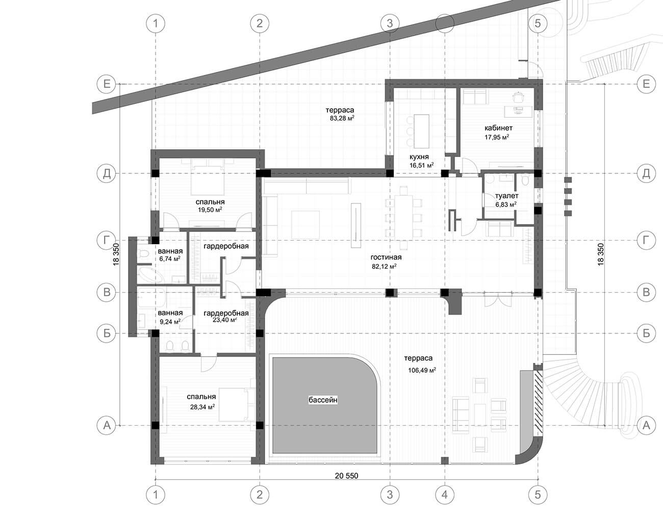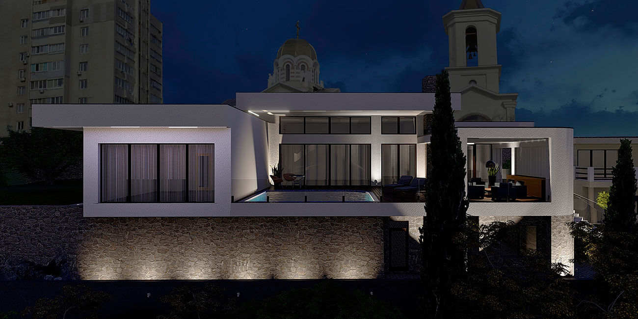Концепция пространства построена на том, что вся активная жизнь семьи должна протекать на обширной террасе перед домом. Тут расположен переливной бассейн, беседка с зоной барбекю. С торцов террас жильцы защищены спальней и жалюзи из дерева. Также есть и задний дворик, который можно использовать в жаркое время суток или когда несколько компаний решили уединиться друг от друга.