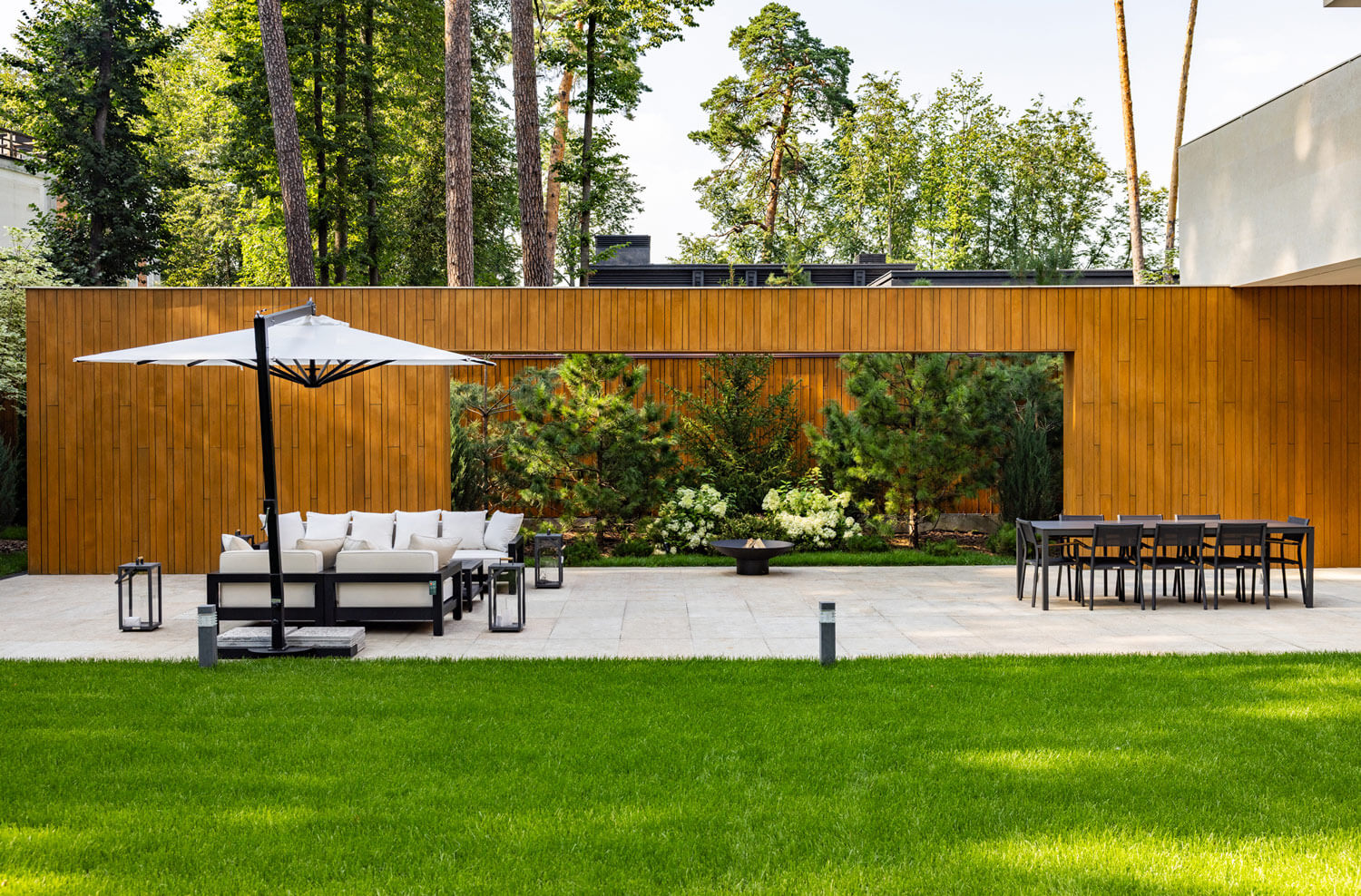 Ландшафт с видом на вековые сосны, газоном и дизайнерским садом с малыми архитектурными формами.