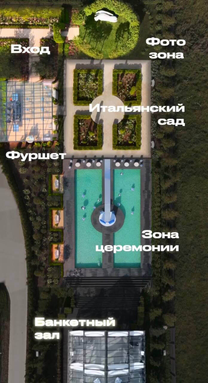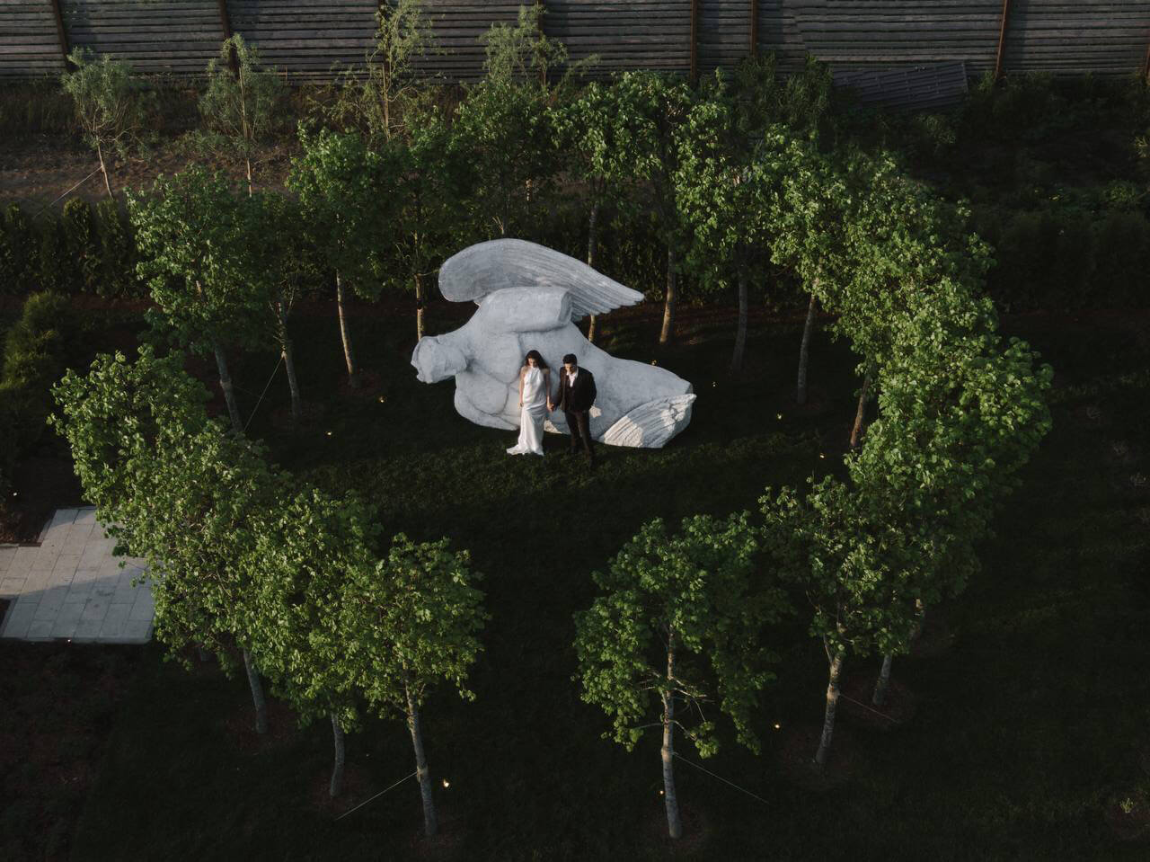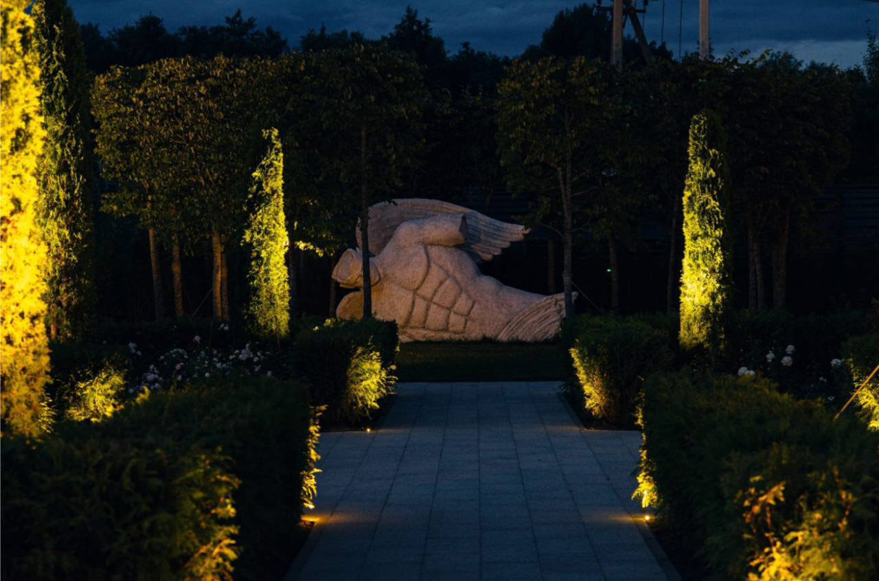 Особое место в композиции занимает центральная аллея для выездной регистрации, она выстроена как символический путь, ведущий к новому этапу жизни. Завершение этого маршрута усиливается скульптурным акцентом — статуей лежащего ангела любви, вдохновлённой образом из итальянской скульптурной традиции, связанной с темой Амура. Образ восходит к античной мифологии и отсылает к символике божественного покровительства любви. Лежащий ангел в спокойной пластике выражает не динамику, а состояние гармонии и умиротворения. Его присутствие в саду воспринимается как благословение пространства и союза двух людей, как напоминание о духовной составляющей брака. Скульптура становится эмоциональным центром территории, местом притяжения, фотозоной и одновременно философским символом проекта.