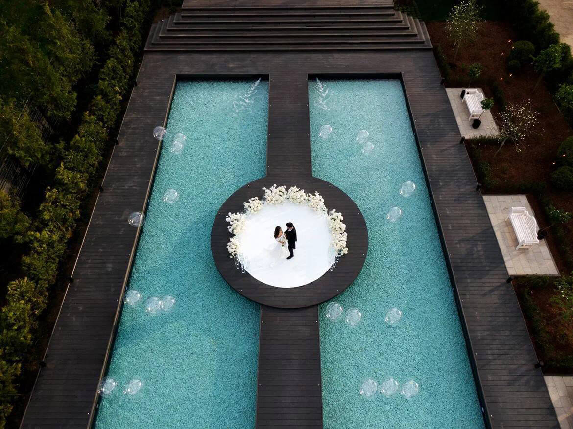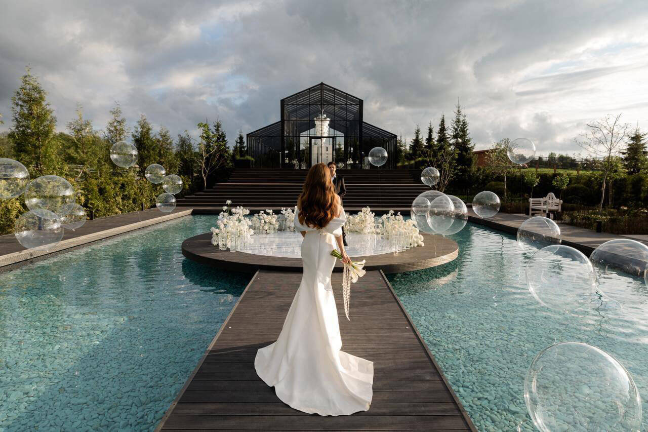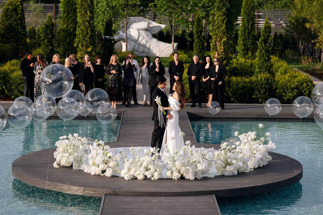 Особое место в композиции занимает центральная аллея для выездной регистрации, она выстроена как символический путь, ведущий к новому этапу жизни. Завершение этого маршрута усиливается скульптурным акцентом — статуей лежащего ангела любви, вдохновлённой образом из итальянской скульптурной традиции, связанной с темой Амура. Образ восходит к античной мифологии и отсылает к символике божественного покровительства любви. Лежащий ангел в спокойной пластике выражает не динамику, а состояние гармонии и умиротворения. Его присутствие в саду воспринимается как благословение пространства и союза двух людей, как напоминание о духовной составляющей брака. Скульптура становится эмоциональным центром территории, местом притяжения, фотозоной и одновременно философским символом проекта.