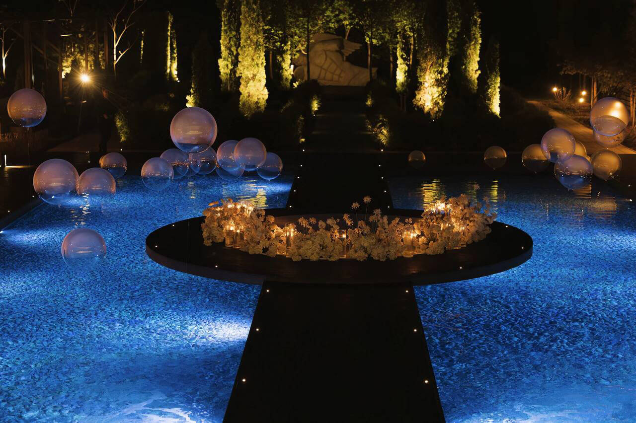 Ландшафтная организация территории строится на принципе кругового движения. Пространство не имеет жёстких границ — гости постепенно погружаются в среду через центральную аллею, которая становится осью композиции и сценарием события. От неё расходятся деревянные, каменные и водные дорожки, формируя плавные маршруты и открывая новые визуальные перспективы. Вечером подсветка подчёркивает геометрию рельефа и создаёт эффект парящего пространства.