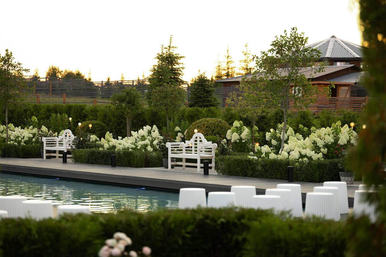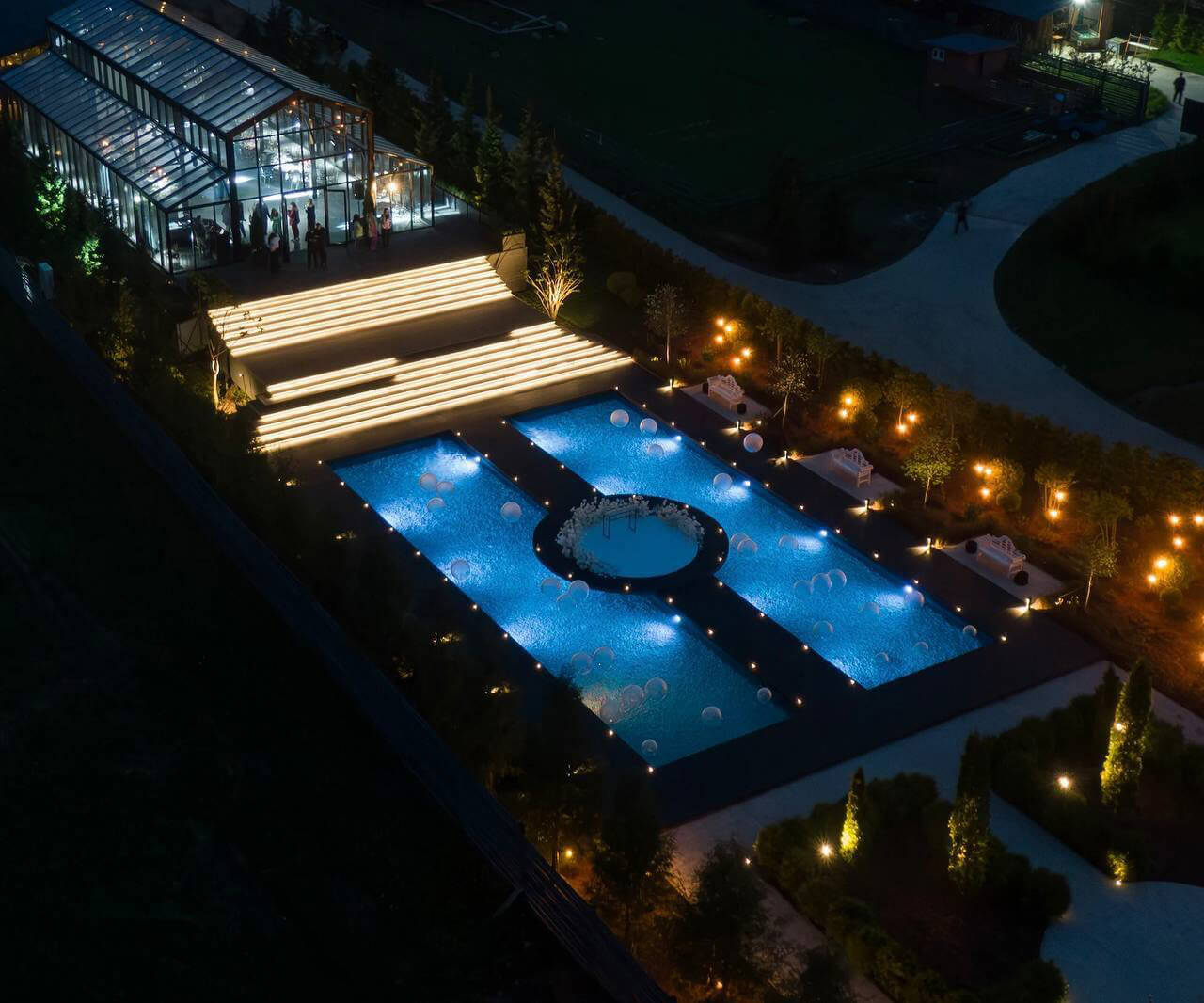 Ландшафт VINITY AMORE построен по принципу «сценографии под открытым небом». Здесь каждый элемент — от изгиба дорожки до высоты посадок работает на создание визуального кадра. Пространство меняется в зависимости от времени суток: днём оно наполнено светом и отражениями воды, вечером — мягким свечением подсветки, подчёркивающей текстуры камня, дерева и листвы. Благодаря лаунж-зонам, зоне вечернего костра и природному окружению формируется многоуровневая среда, где событие разворачивается естественно и свободно.