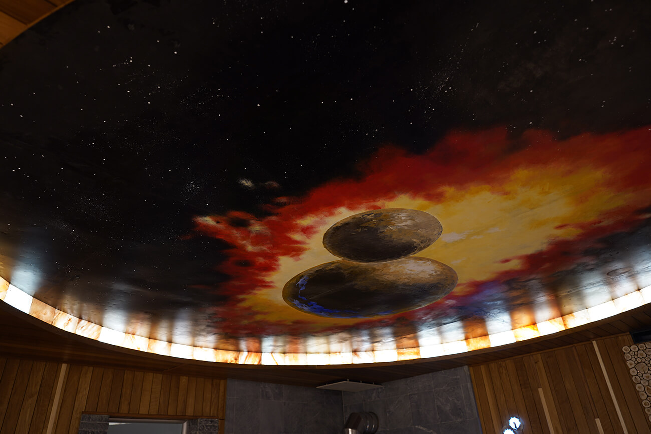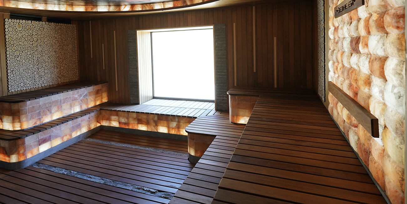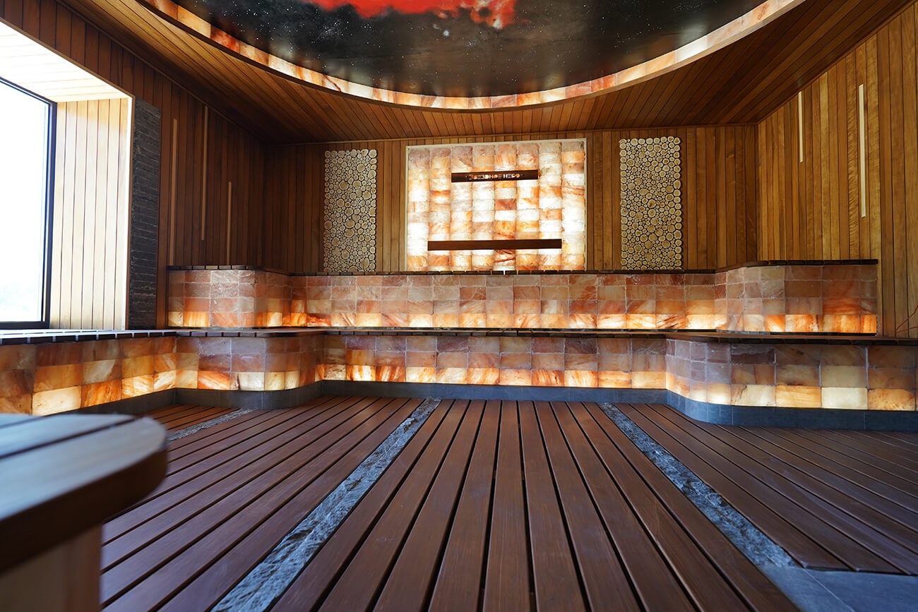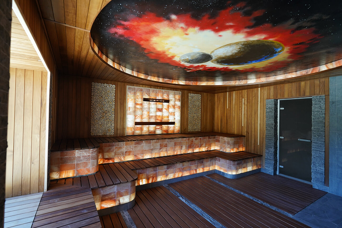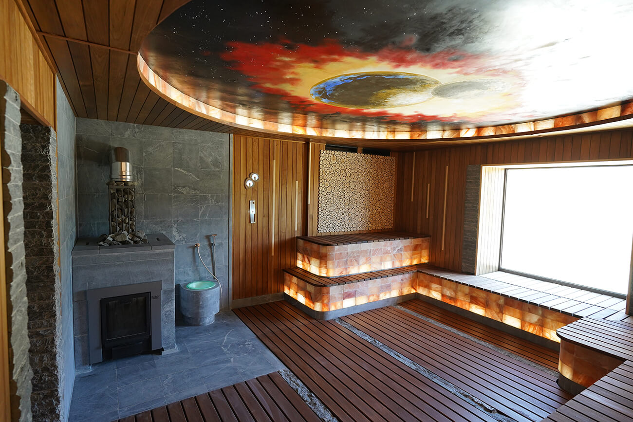 Панорамное окно с видом на горный пейзаж, сочетание розовой гималайской соли и древесины темного оттенка с можжевеловыми панно, печь, облицованная талькомагнезитом, эксклюзивный потолок с 3D-эффектом звездного неба не просто поддерживают общую концепцию спа-центра, а делают ВИП-сауну его сердцем.