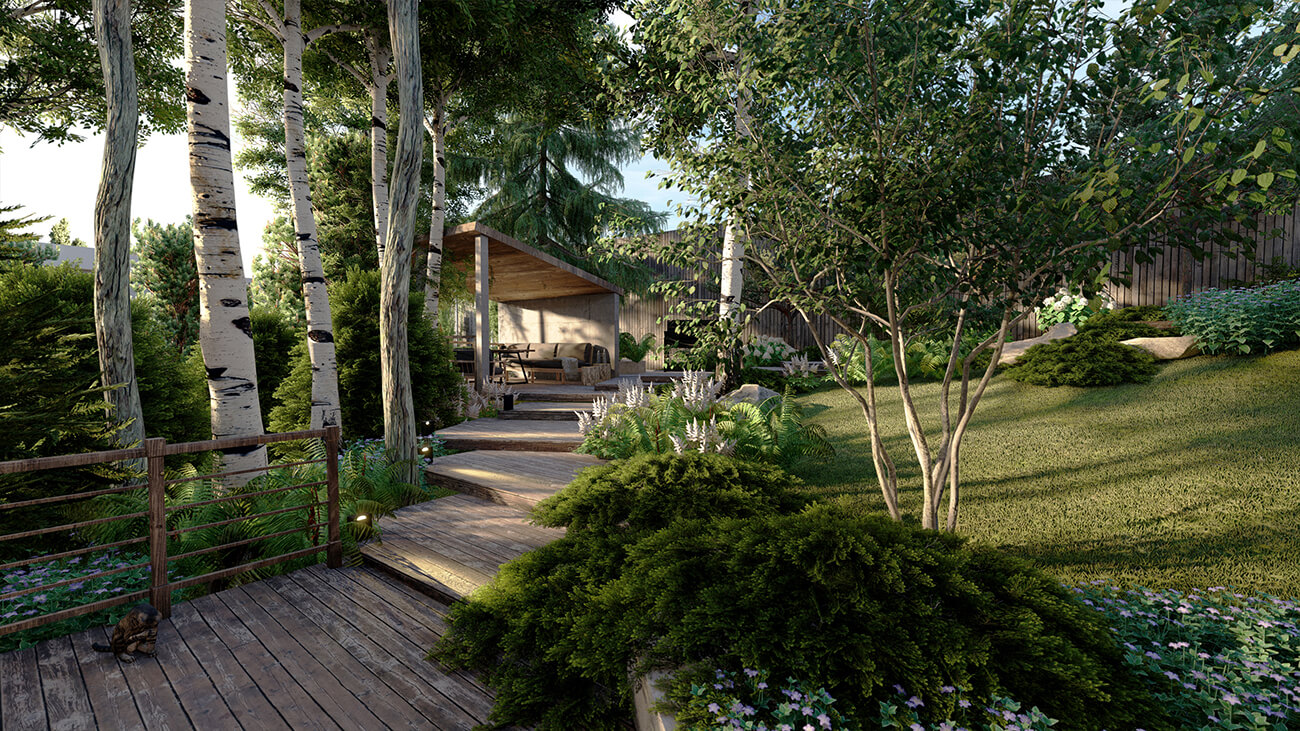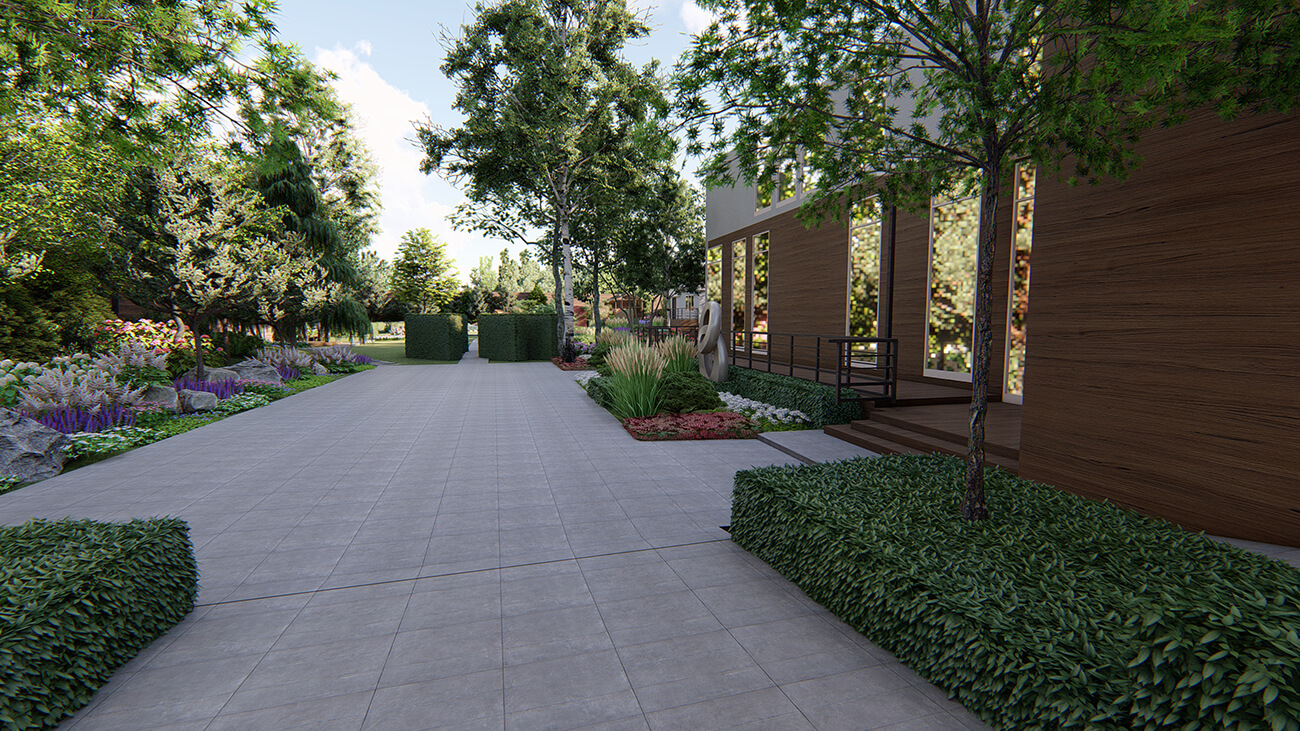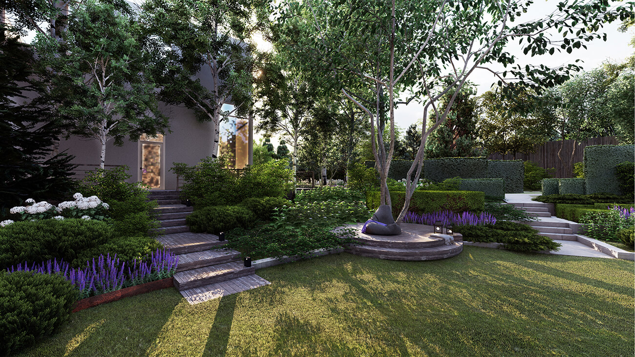 Создать ландшафт, соответствующий архитектуре дома, построенного в стиле хай-тек. Сделать грамотное зонирование территории, визуально отделив зоны друг от друга.