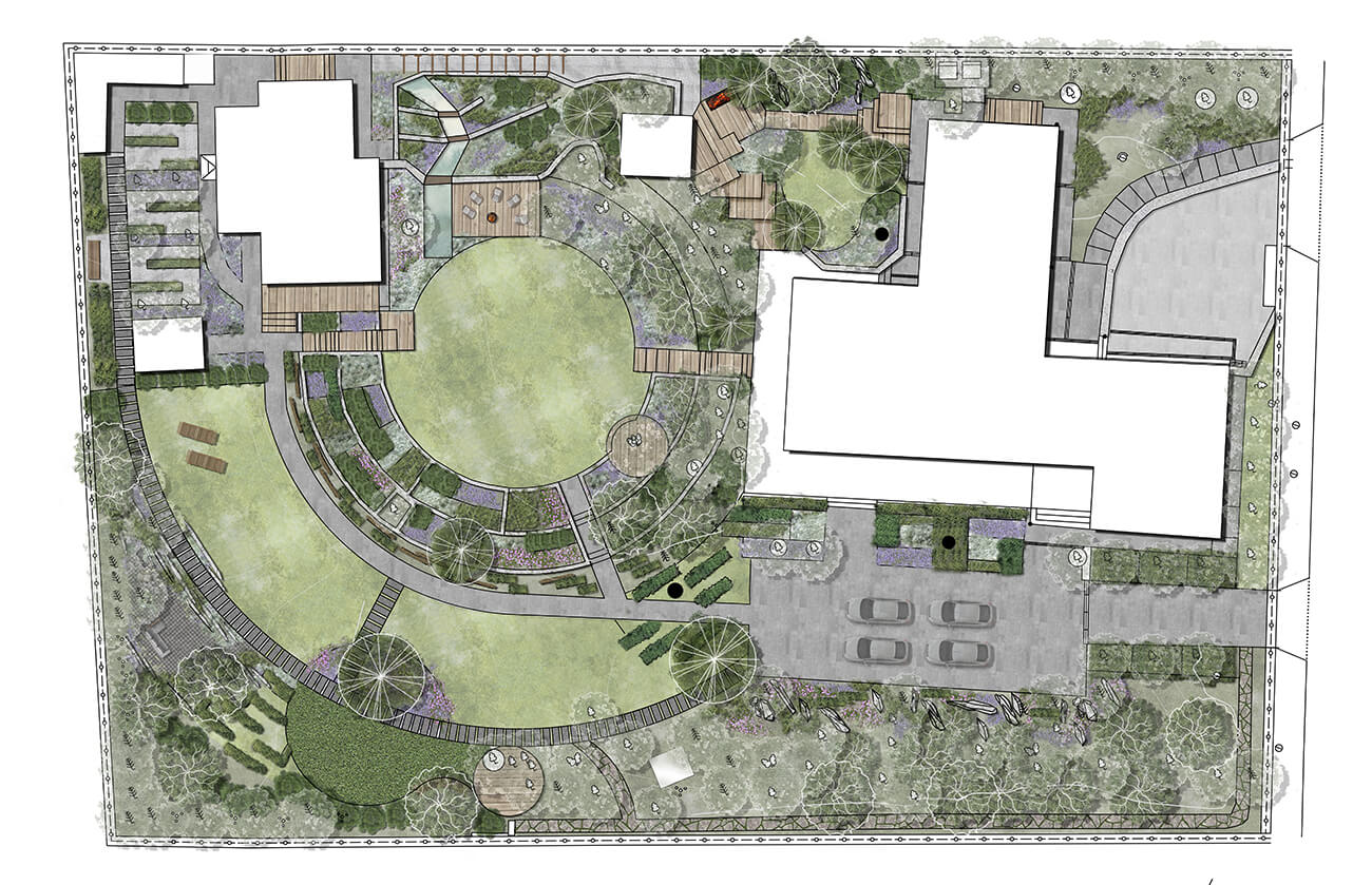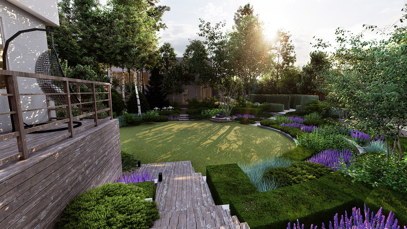 В проекте предусмотрены зоны для разных сценариев времяпрепровождения всех членов семьи и их гостей: небольшой декоративный огород с изящной теплицей, детская площадка и газон для детских игр, домик на дереве, терраса с очагом и декоративным водоемом, зона отдыха, лабиринт, беседка, зона барбекю.