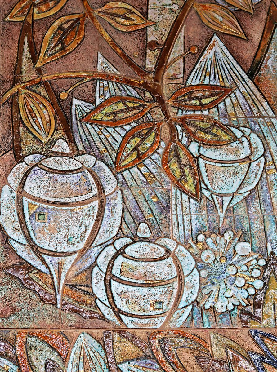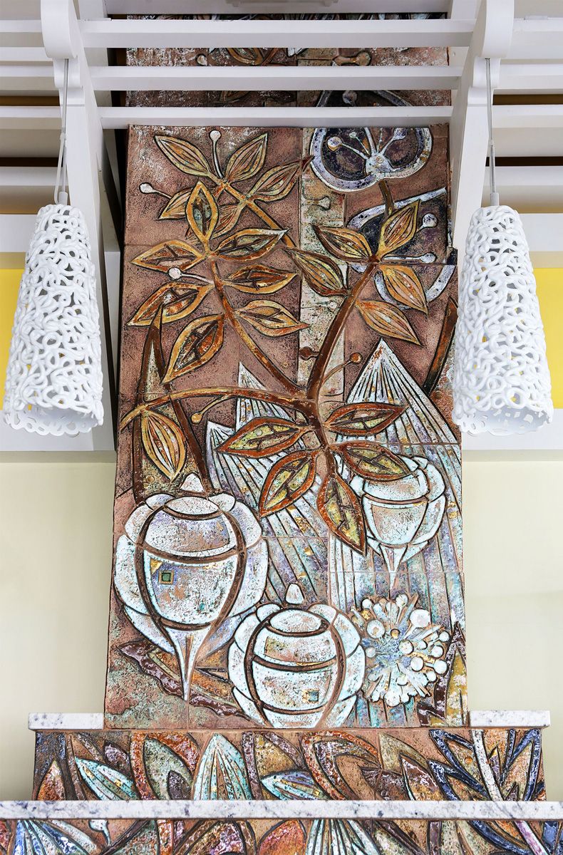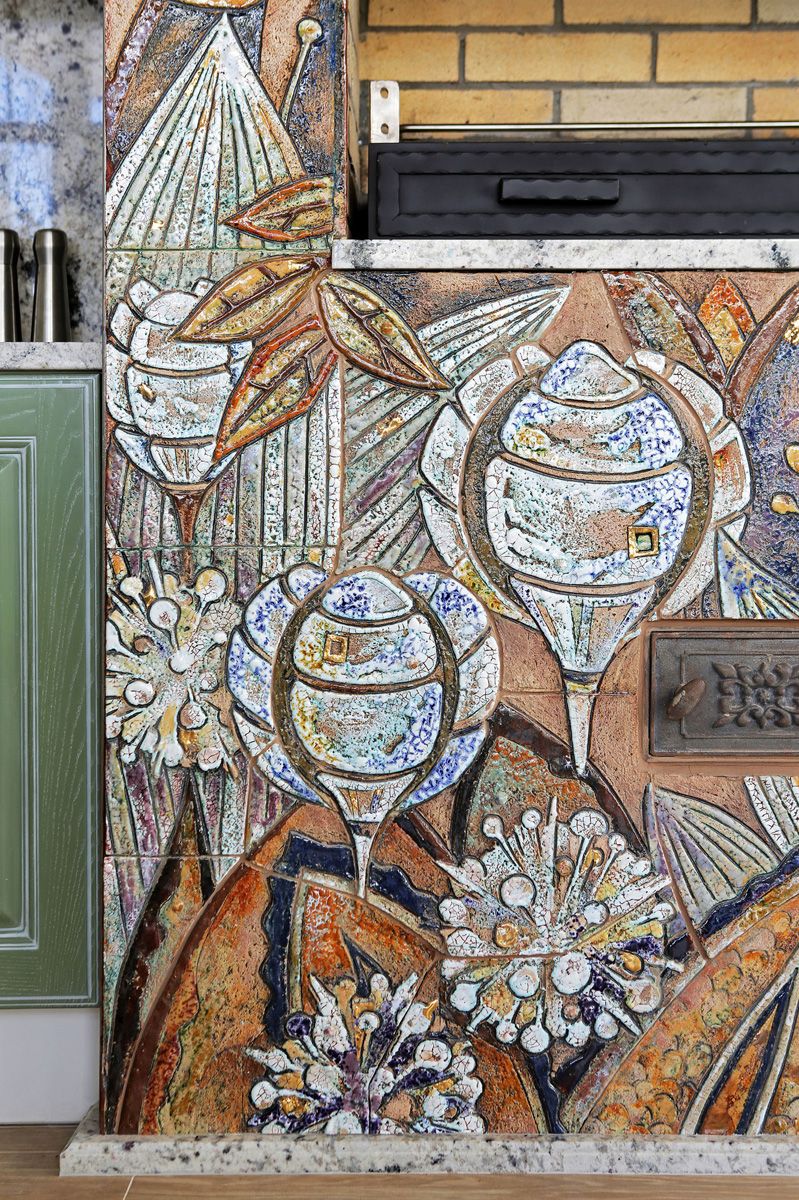 На центральной части творения расположились рисунки фантазийных цветов. Несмотря на то, что изделие выполнено из керамики, баланс света и тени придает объем керамической картине: будто настоящие цветы выросли из паркета и расползлись по кухне.