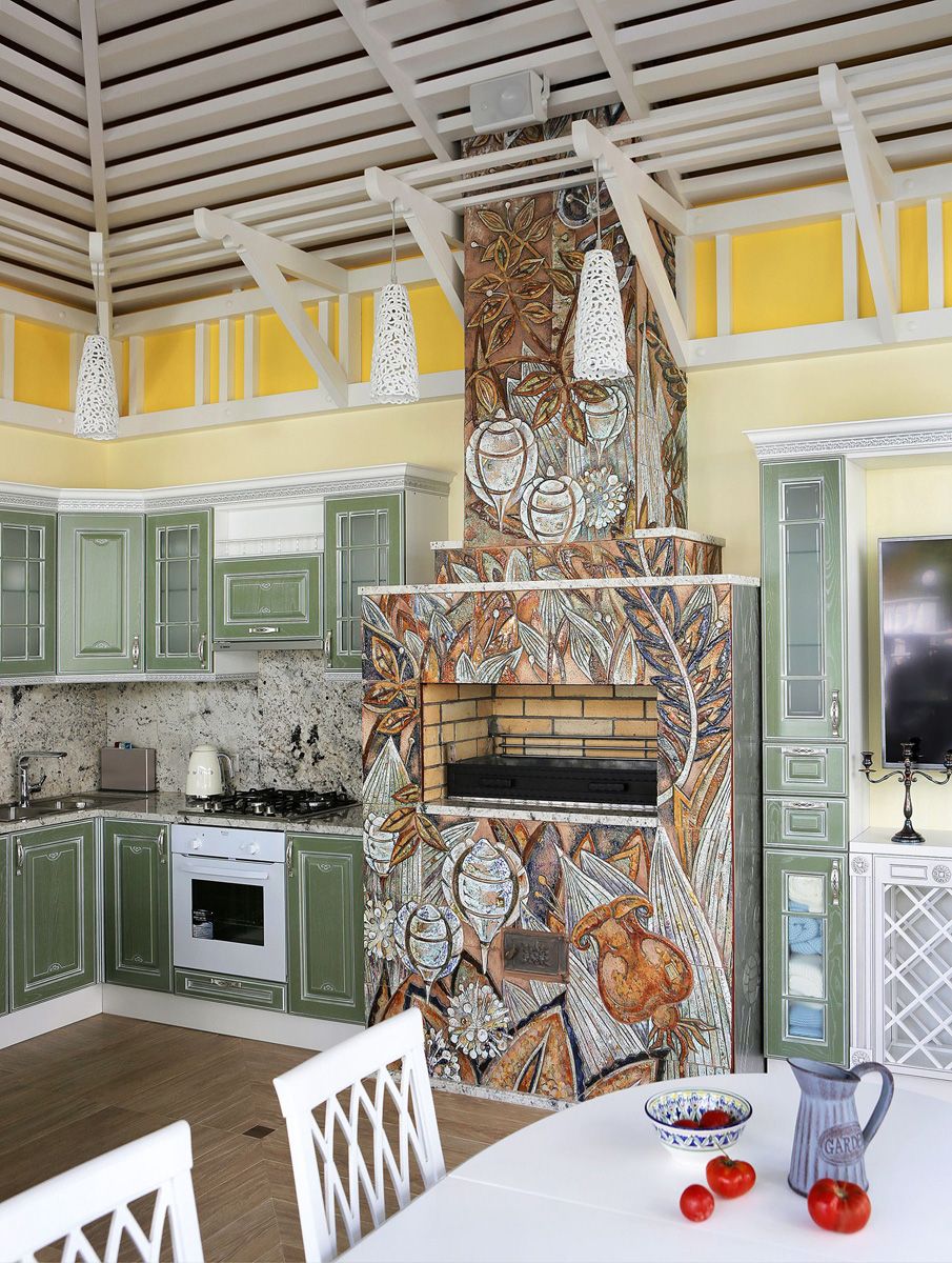 Редким гостем на кухне является барбекю. Однако в этом случае оно органично вписывается в окружающую обстановку и становится главным украшением помещения.