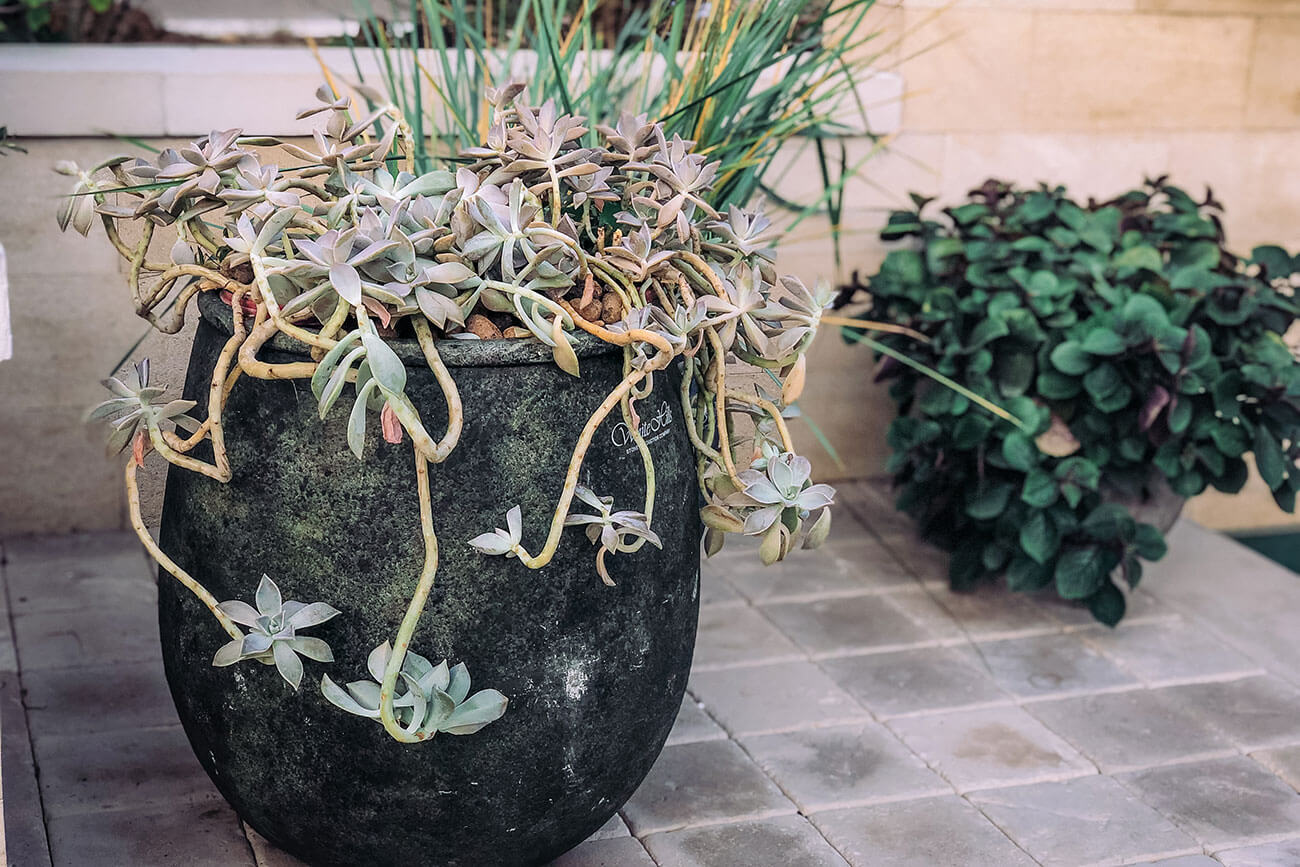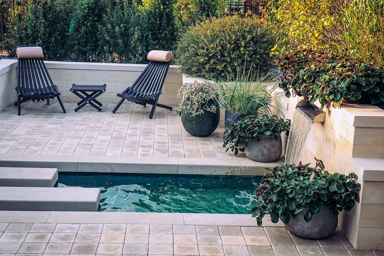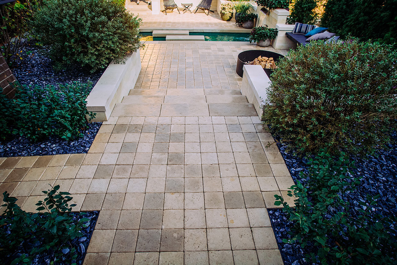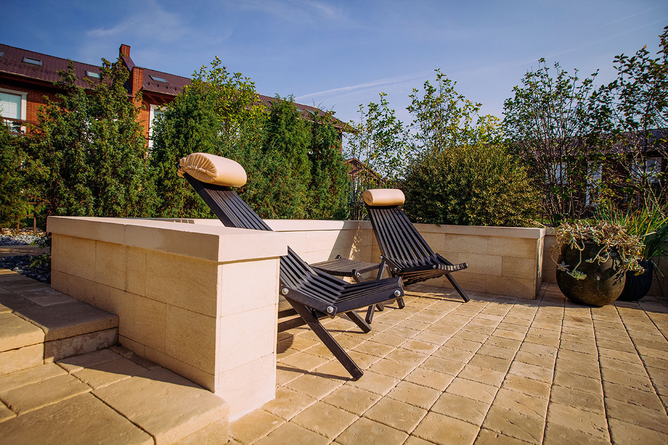 В саду использовано три вида покрытий: мощение из бетонной плитки «под травертин», блицовка стен натуральным камнем и выполненные из искусственного камня на заказ по нашим чертежам накрывные элементы для стен и краев бассейна.