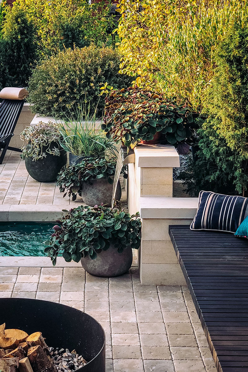 Задачей было создать малоуходный сад, удовлетворяющий потребности молодой семьи в летнем отдыхе на территории небольшого земельного участка, прилегающего к таунхаусу. Этот маленький сад вмещает достаточно большое количество гостей, а в центре имеет очаг для вечерних посиделок у огня. Журчание водопада, вода цвета моря и светлые оттенки камня создают атмосферу расслабленного Средиземноморья, а запах можжевельника и садовые кресла со столиком для бокалов вина довершают идиллию.
