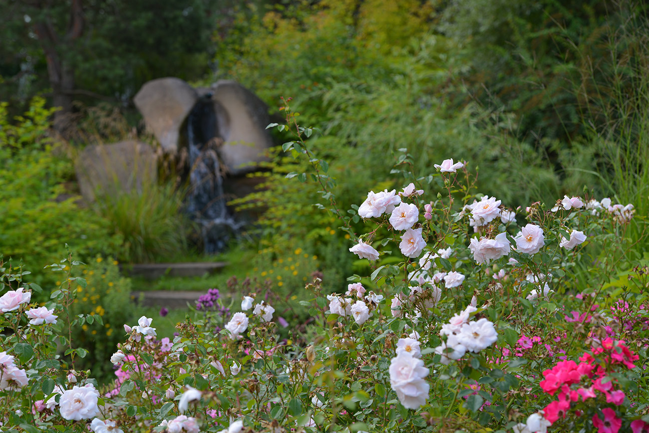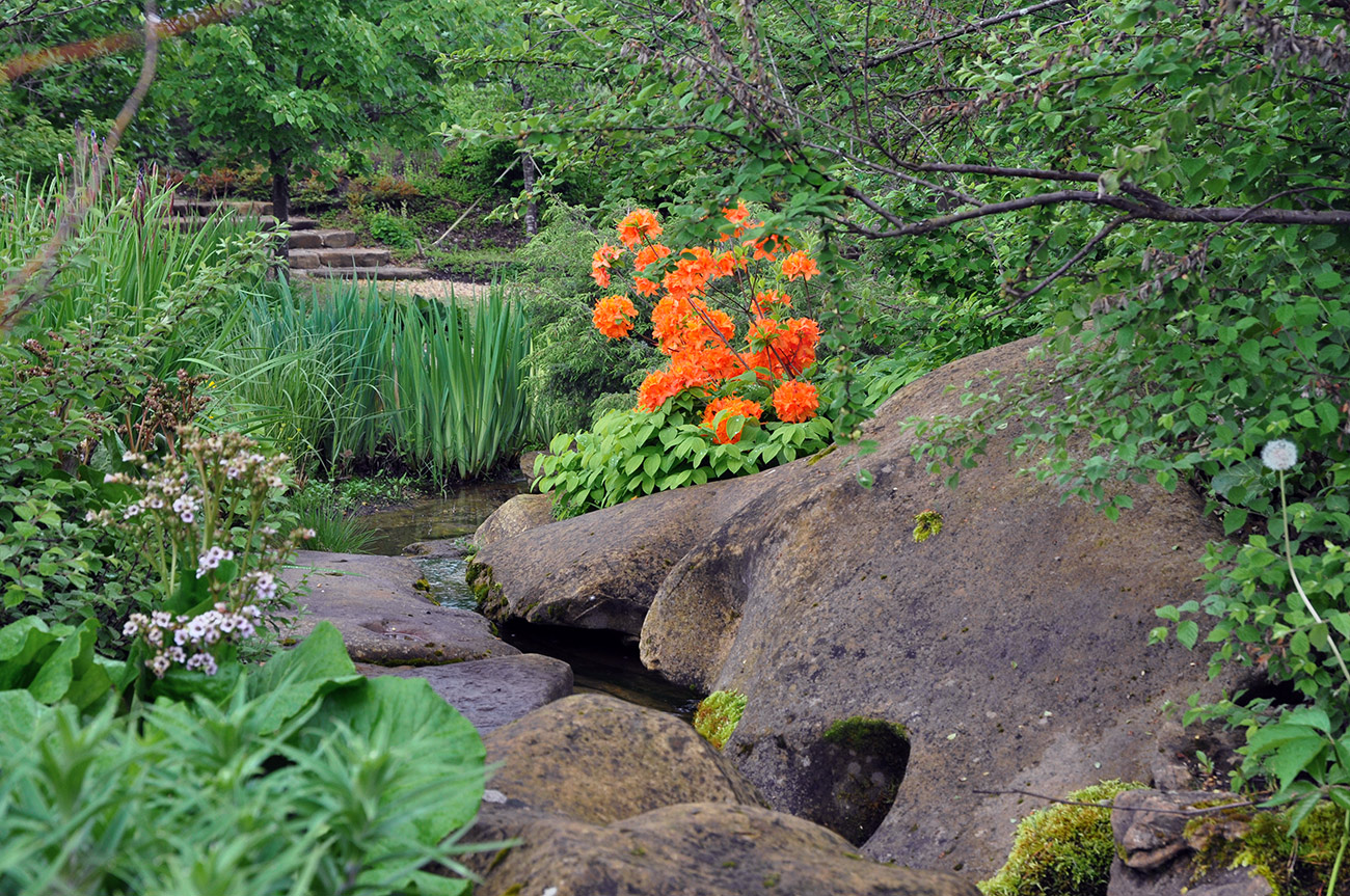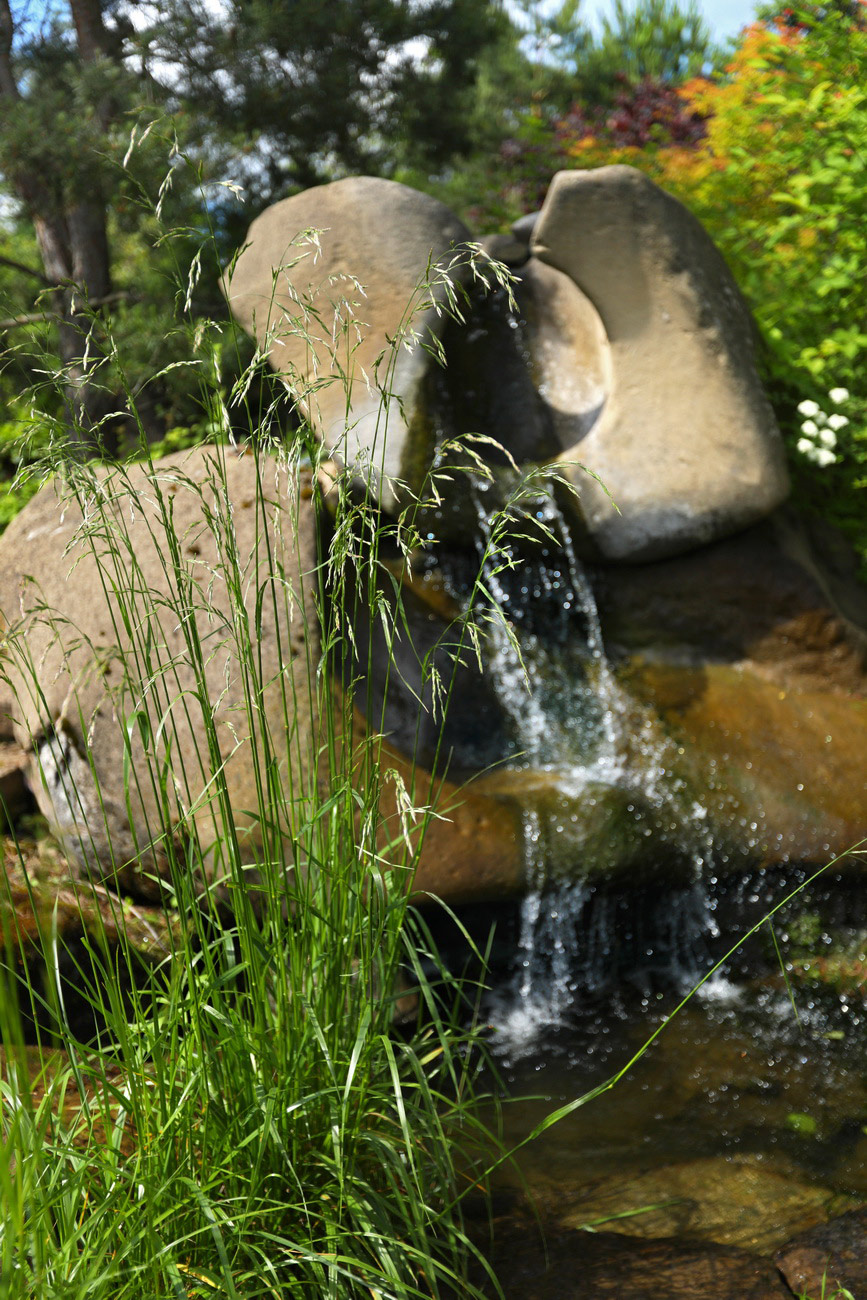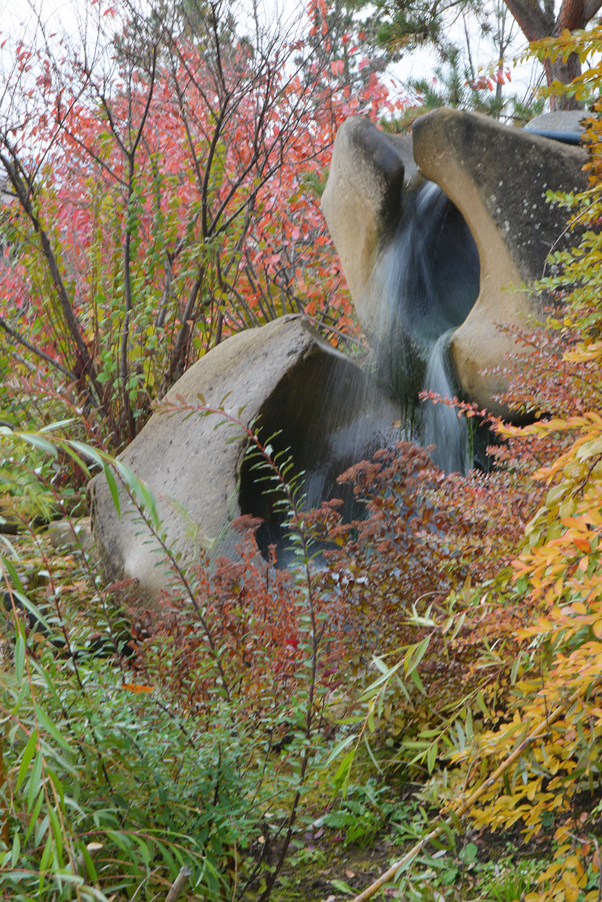 Водопад немного прикрыт опушкой леса. Его окружают сосны; цветущие весной ирга, войлочная вишня; краснеющие осенью манчжурские клены, заросли стефанандры танаки, спиреи, ивы. С центральной лужайки к водопаду ведут широкие каменные ступени.