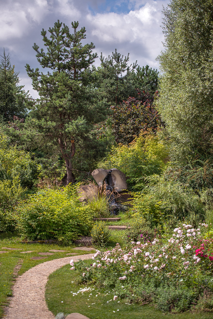 Водопад и водоем разделены искусственным, заросшим лесом и серпообразным холмом, чтобы сделать невозможным одновременное восприятие этих двух объектов, так как они построены из разных пород камней — песчаника и ракушечника.