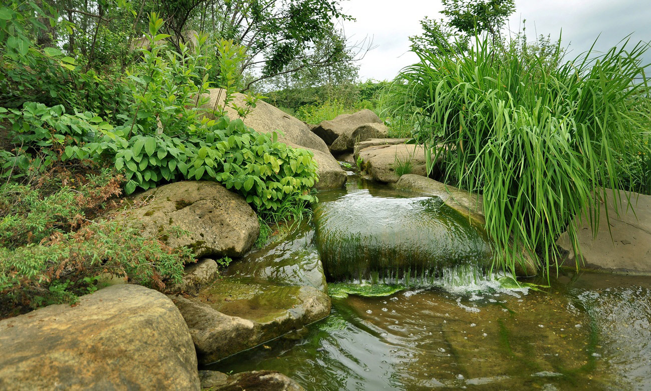 Русло ручья вылеплено вручную. По пути он преодолевает еще два небольших водопада и впадает в водоем, откуда вода снова подается в водопад.