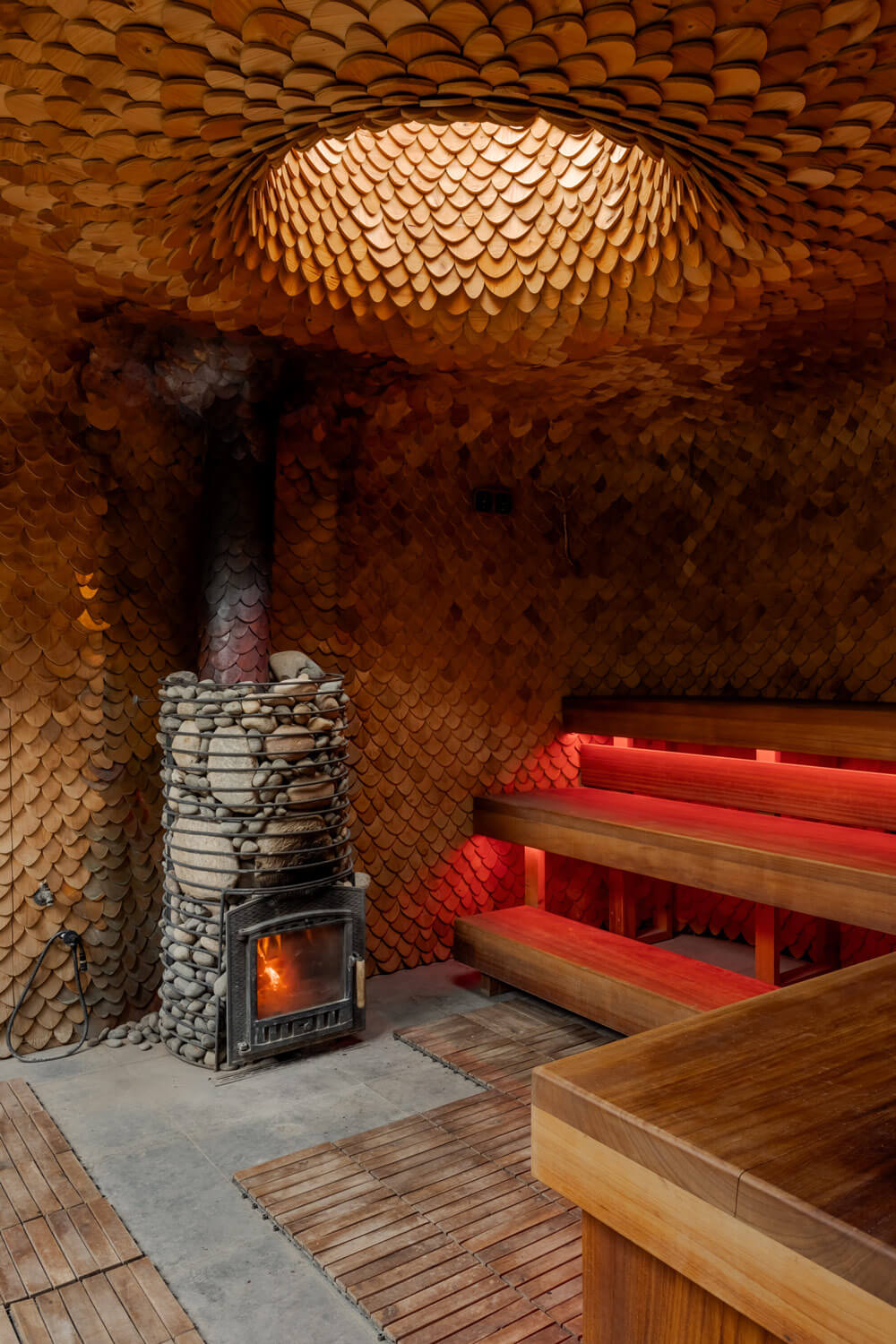 Дровяная печь-каменка в сауне — собственная разработка архитектурного бюро. Большой объем камней, размещенных в металлической сетке, обеспечивает приятный мелкодисперсный пар и комфортный микроклимат в парной.