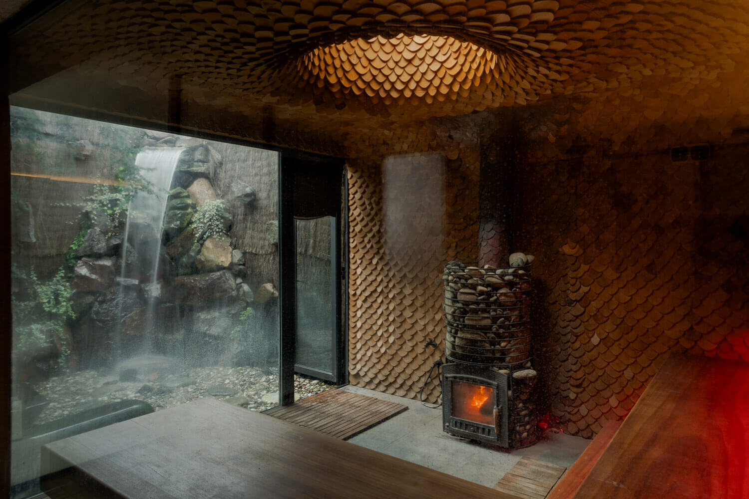 Интерьер и экстрерьер банного комплекса неотделим от природного окружения, комплекс становится продолжением пейзажа. Гранитные глыбы, ставшие органичной частью пространства бань, выглядят так, будто веками находятся на этом месте.