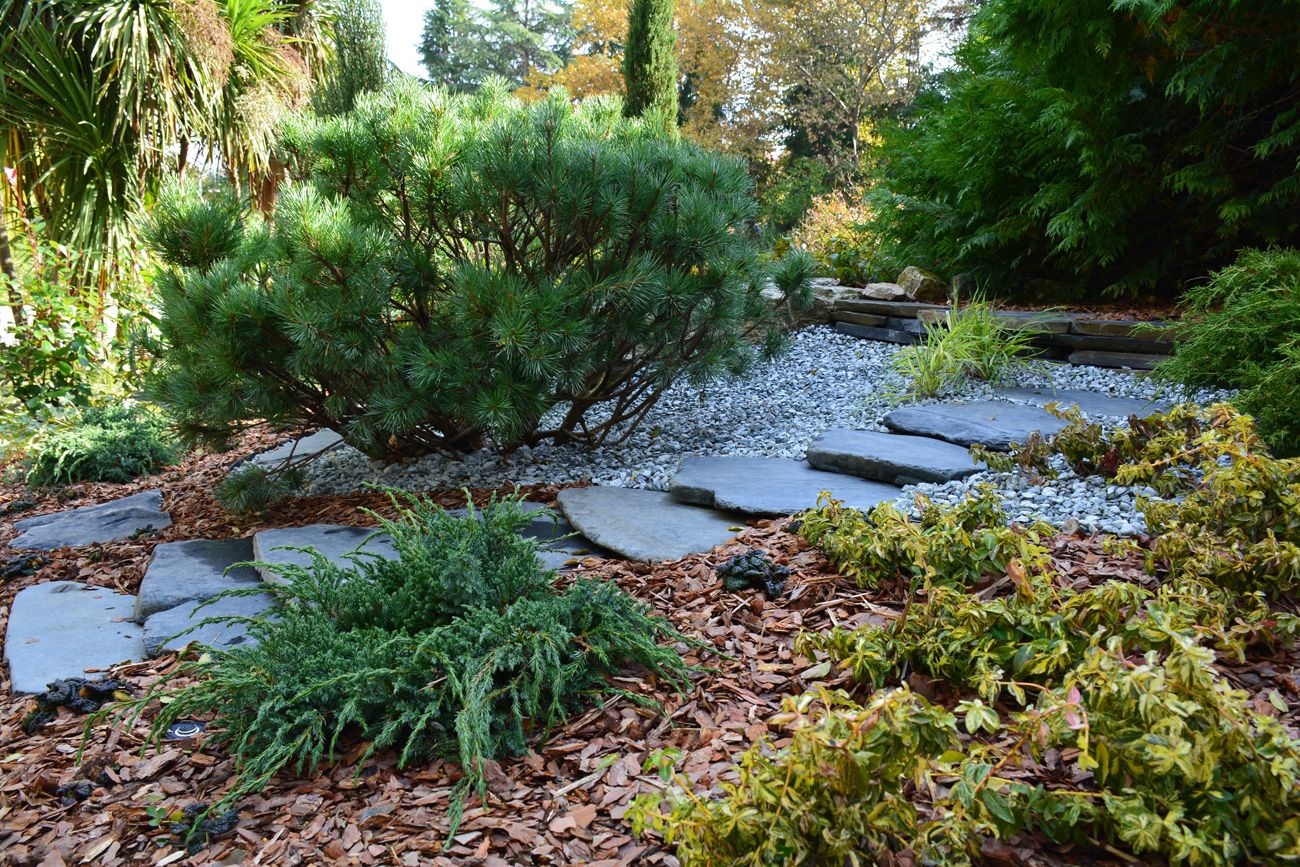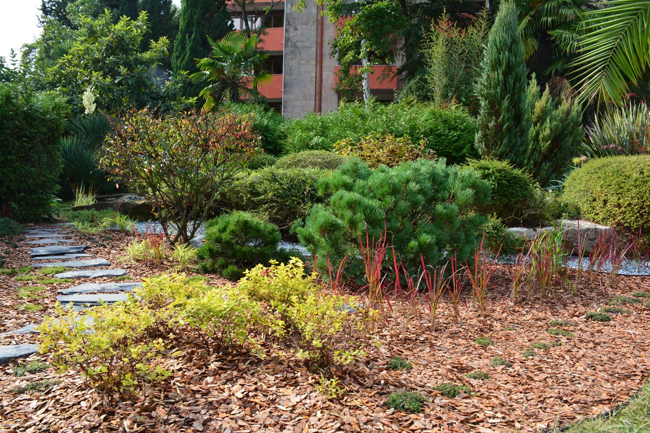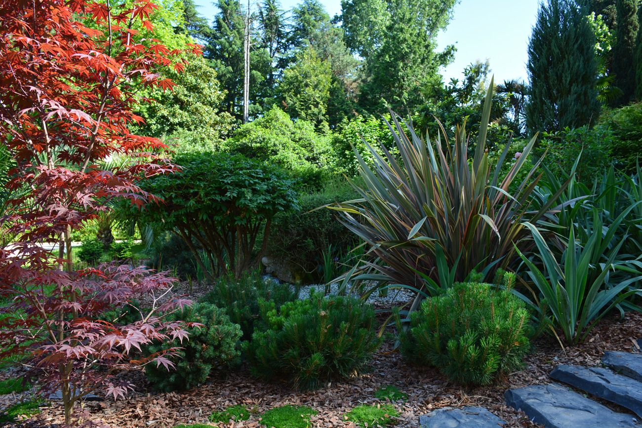 Акцентными растениями стали клены пальмолистные «Atropurpurea», «Fireglow», «Dissectum Garnet». Хорошо дополнили композицию крупные крылатые бересклеты, сосны «Watereri», «Ophir», «Mops», можжевельники с различными оттенками хвои, карликовые пихты, а также форзиция «Arnold Dwarf» и фотиния «Red Robin».