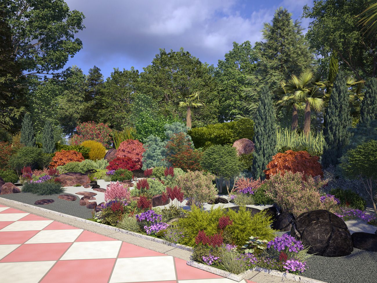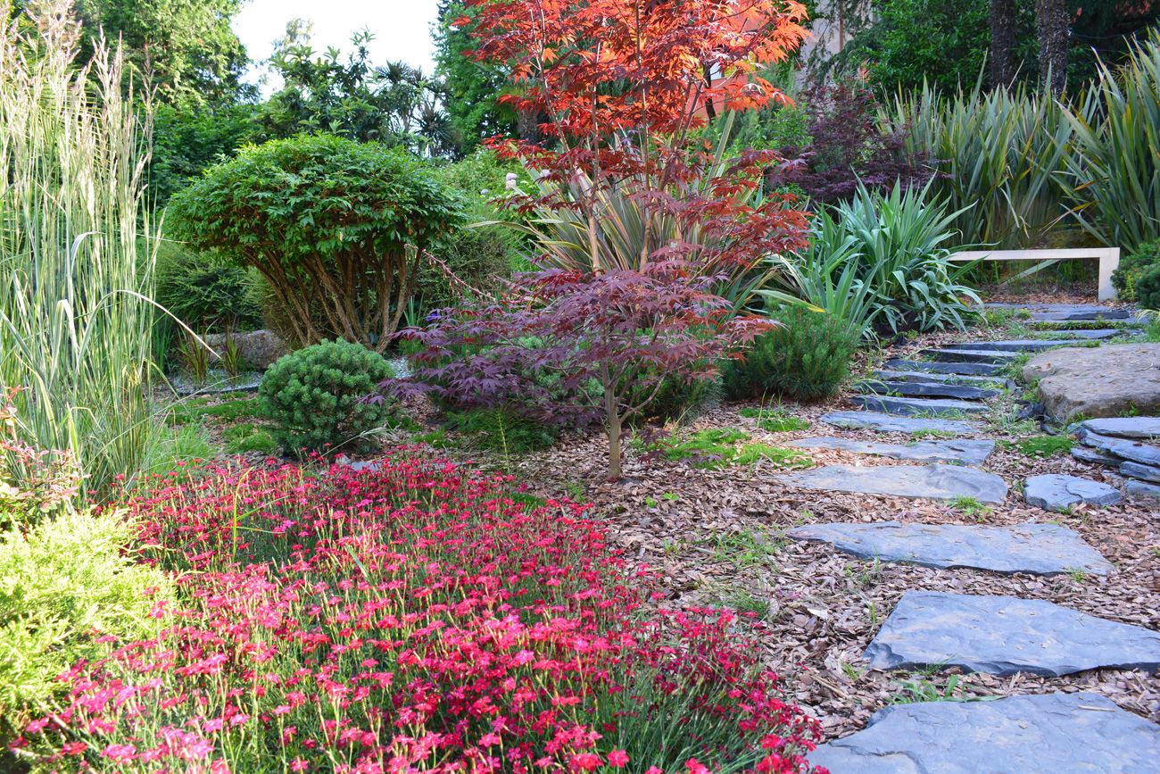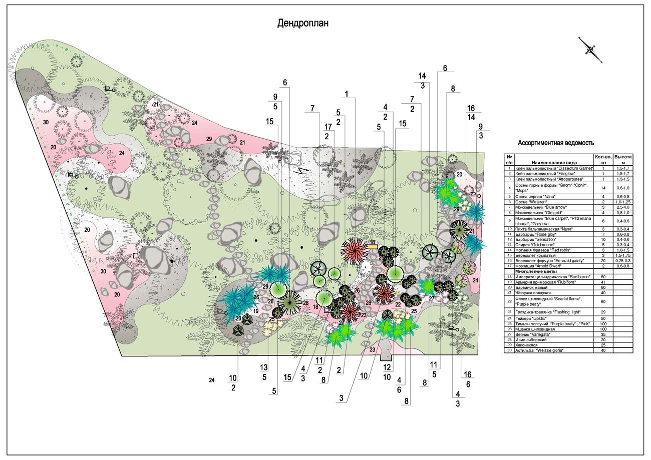 Акцентными растениями стали клены пальмолистные «Atropurpurea», «Fireglow», «Dissectum Garnet». Хорошо дополнили композицию крупные крылатые бересклеты, сосны «Watereri», «Ophir», «Mops», можжевельники с различными оттенками хвои, карликовые пихты, а также форзиция «Arnold Dwarf» и фотиния «Red Robin».
