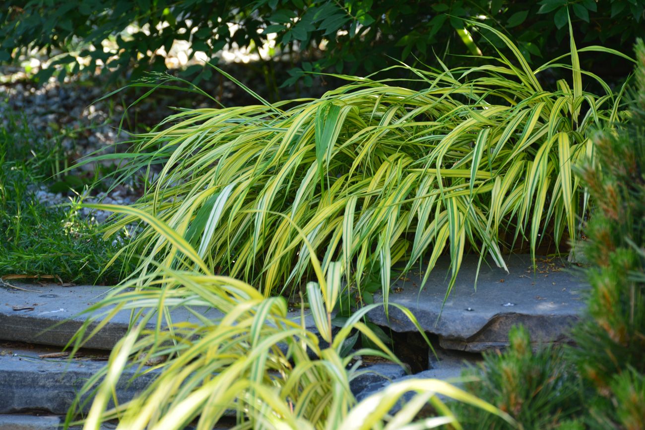 Многолетники также радуют разнообразием и красотой. В основном это почвопокровные виды: тимьяны разных сортов, мшанка шиловидная, гвоздика травянка, армерия приморская, флоксы шиловидные разных сортов. Они высаживались большими группами вокруг камней и вдоль ступеней. Со временем эти почвопокровники разрастутся, сомкнутся и будут цвести островками в разное время, начиная с апреля по октябрь. Очень привлекают и украшают сад злаковые виды многолетников: императа цилиндрическая «Red Baron», вейник «Variegata», хаконехлоя. В теневые места высажены астильба «Weisse Gloria», барвинок малый, живучка ползучая, гейхера «Lipstic». Завершающим этапом стала отсыпка всех посадок мелкой крошкой из змеевика и сосновой коры.
