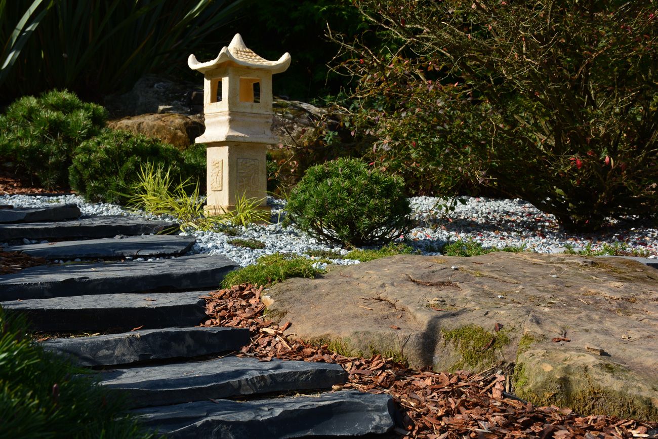 Центром композиции была изящная лавочка из шлифованного светлого гранита. К ней шла извилистая дорожка со ступенями из крупных шунгитных плит. Прекрасным дополнением стали два японских фонарика, которые внесли настроение гармонии и умиротворенности от нахождения в данном месте.