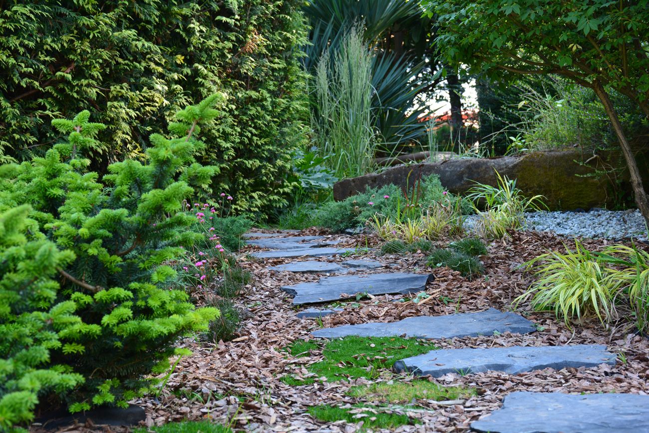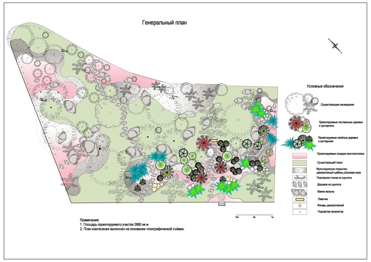 Учитывая, что на участке уже росли крупные хвойные растения и лежали большие камни, заросшие мхом, было предложено спроектировать небольшой тематический сад в восточном стиле. Проектное решение помогло преобразить участок, внести яркие краски с помощью растений и подарить посетителям совершенно новое восприятие этого места.