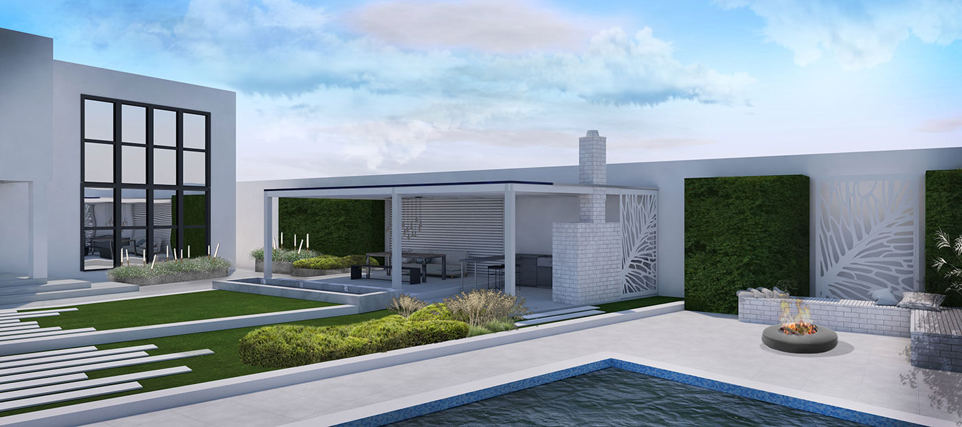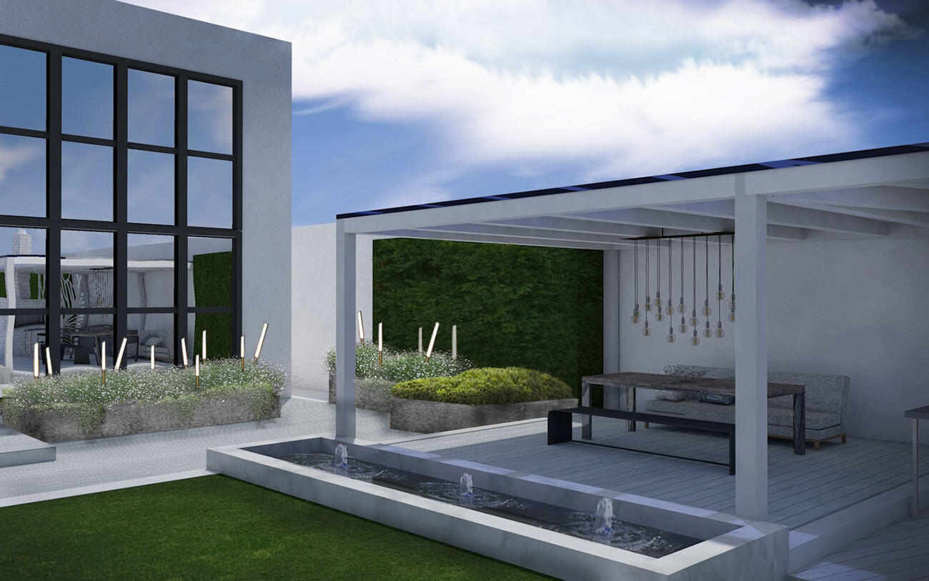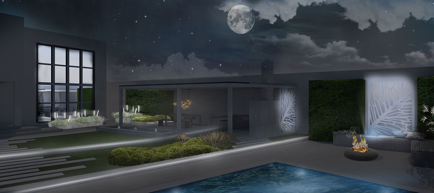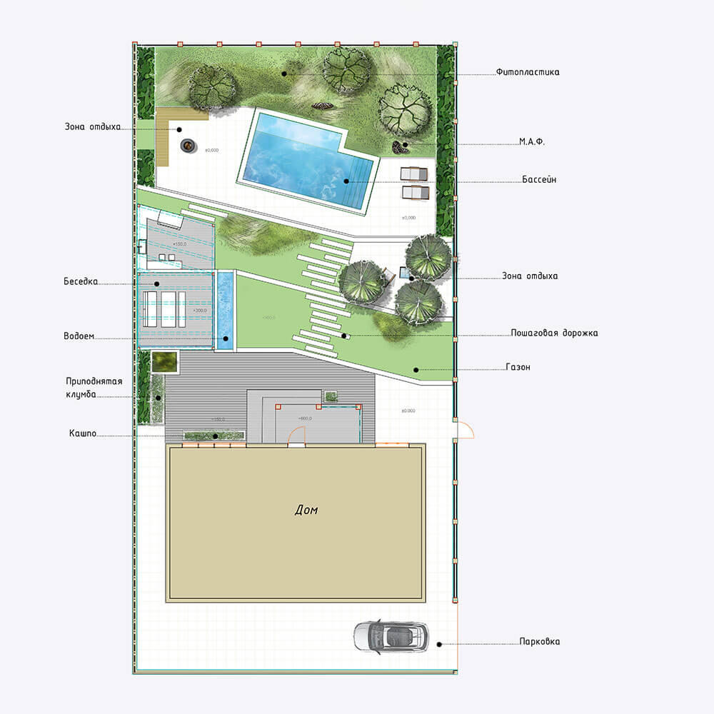 В планировке сложные линии одновременно зрительно расширяют и зонируют сад. Белый камень наполняет его светом. В озеленении применены приемы фитопластики, в сочетании со злаковыми посадками они сглаживают геометричность сада. Практически все растения максимально приближены к своим природным, естественным формам. Этот тандем «человеческой руки» и природы позволяет добиться от сада эффекта лаконичности и легкости.