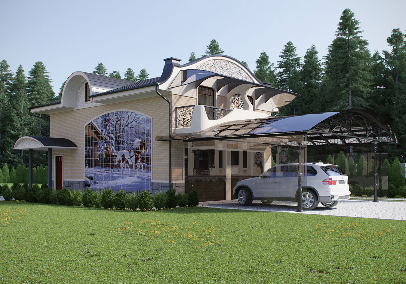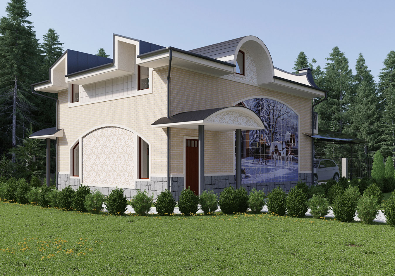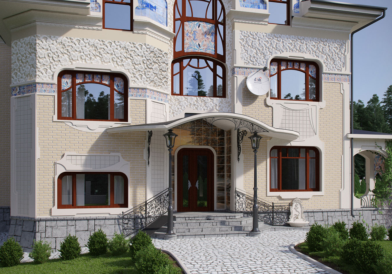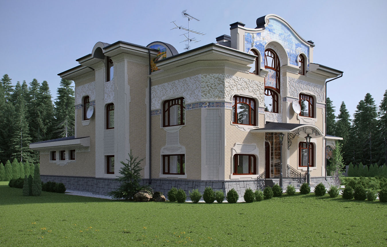 Материалы отделки фасадов: облицовочный бежево-желтый кирпич, белая декоративная (в т.ч. рельефная) штукатурка, серый камень «скала», светлая керамическая плитка декора и серый керамический гранит, а также керамическая плитка с художественной росписью, украшающая фронтоны. Именно она придает дому индивидуальность. Сюжеты изображений «времена года» на фронтонах соответствуют сторонам света. Покрытие основной кровли — металлочерепица, козырьков и других элементов — фальцевое листовое. Ограждения лестниц и балконов — кованые стального оттенка. Окна и двери — стеклопакеты (двух- или трехкамерные) в деревянных (или пластик «под дерево») окладах коричневого оттенка (орех).