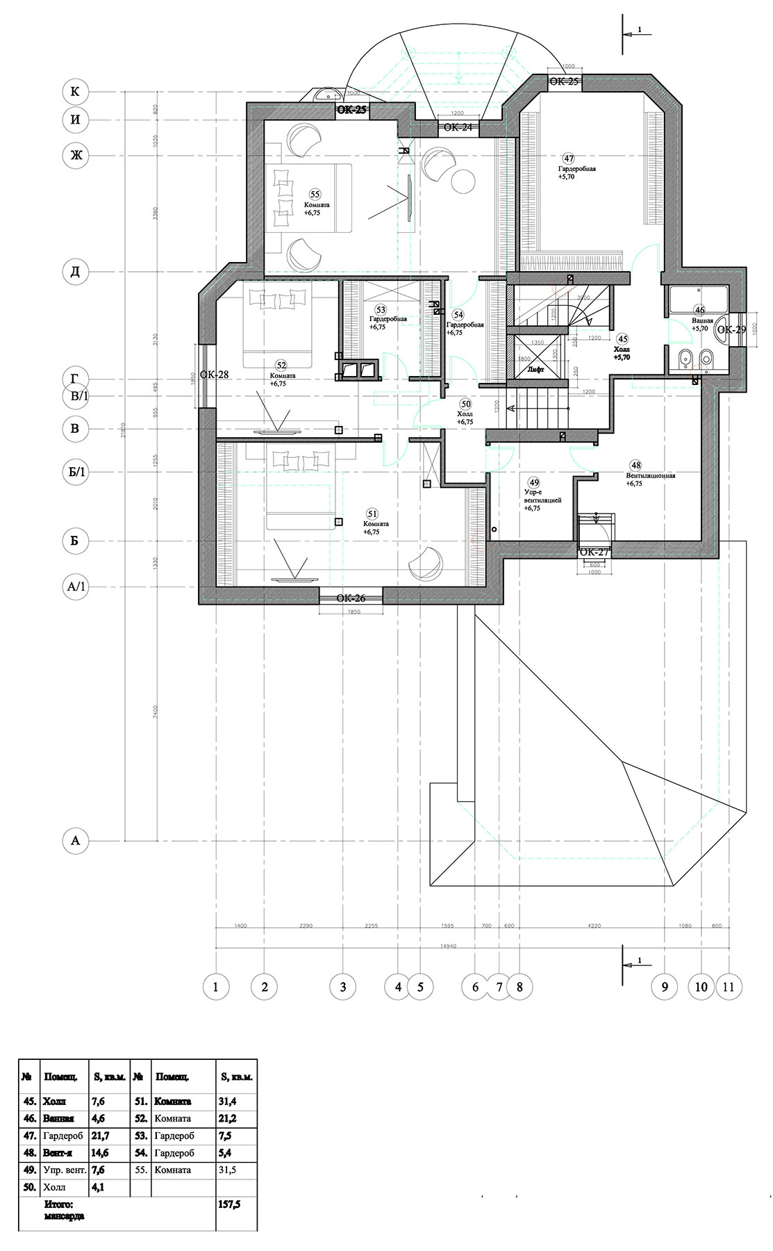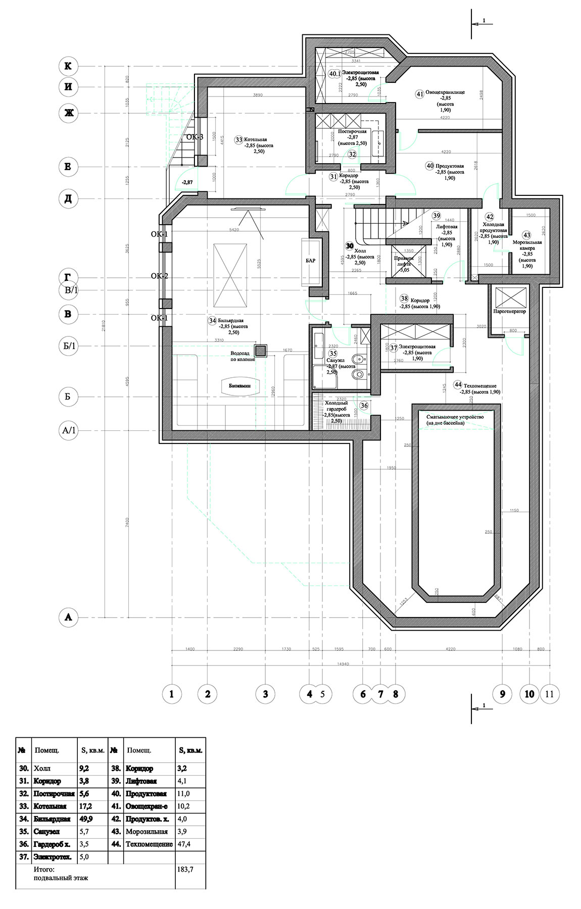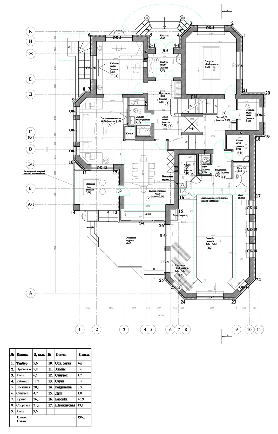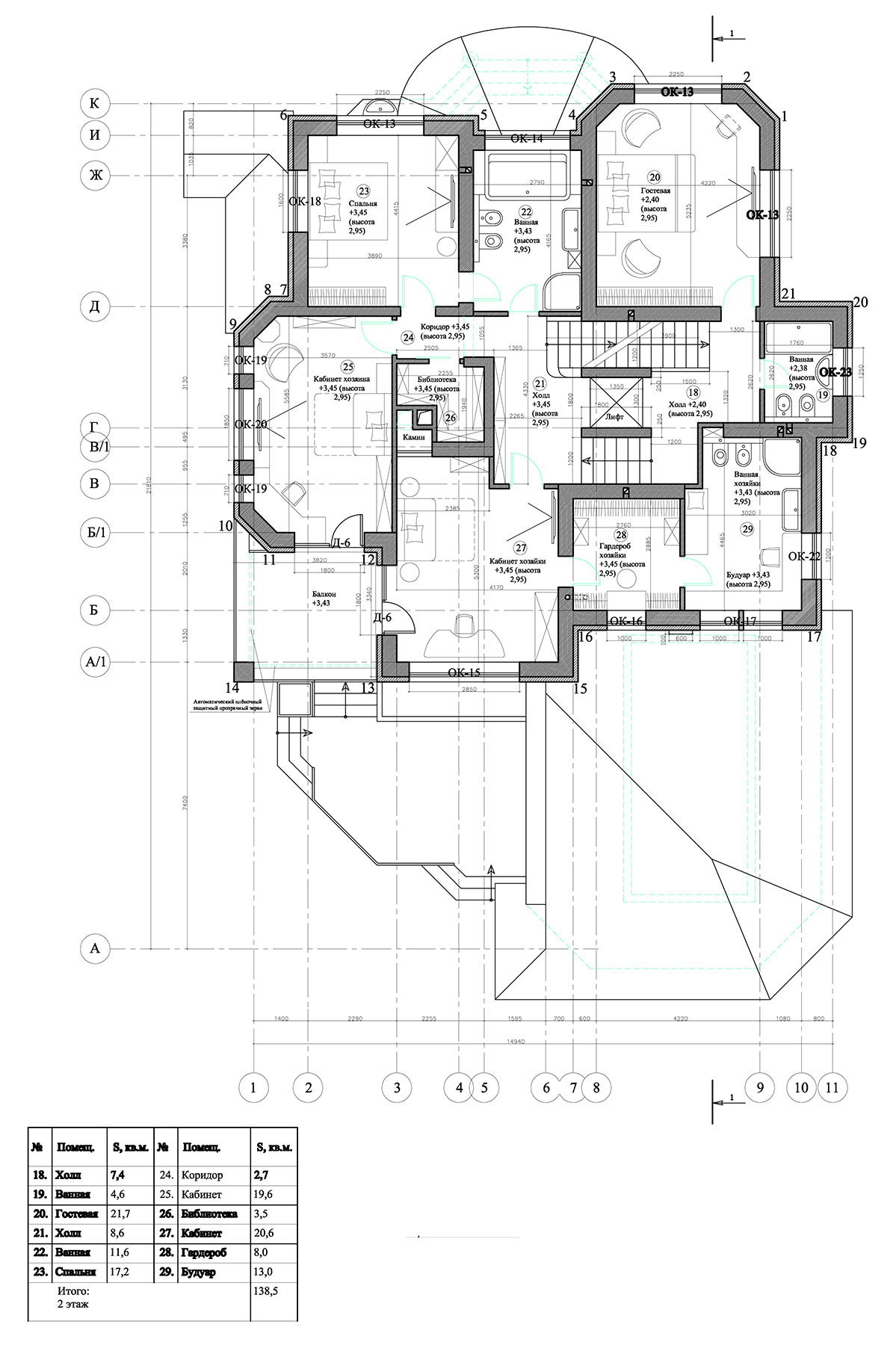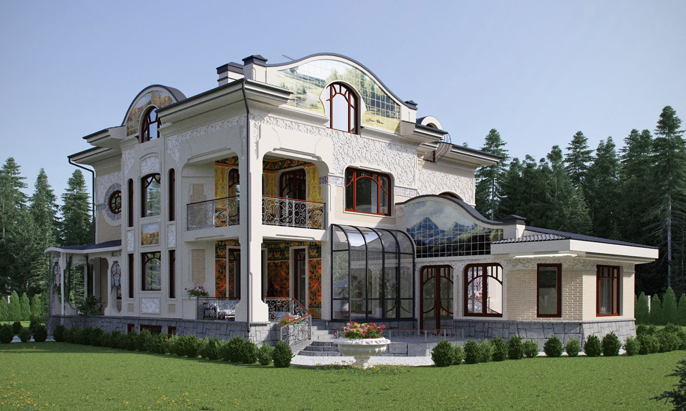 Основной дом располагается вдоль восточной стороны относительно плоского ровного участка, вытянутого с запада на восток. Парадное крыльцо входной группы с навесом размещено с северной стороны дома. Основные жилые помещения дома (гостиная, кухня-столовая, кабинеты, хозяйская спальня, будуар хозяйки, бассейн и т.д.) а также балкон второго этажа и терраса, соединяющая балкон первого этажа с бассейном, выходят на южную и западную стороны и развернуты к середине участка. На цокольном этаже обустроены технические и хозяйственные помещения, а также помещения для отдыха. Первый этаж дома занимают основные помещения общего пользования, бассейн с баней, сауной и спорткомплексом. Второй этаж — приватные апартаменты хозяев, а также спальня и санузел для гостей. Часть помещений первого и второго этажей разнесены в уровнях на 0,6 м. На чердаке находятся технические помещения универсального назначения. Дом оснащен трехмаршевой лестницей, соединяющей все этажи, и лифтом, связывающим три нижних уровня (кроме мансарды). Фасады дома выдержаны в стиле московского модерна.