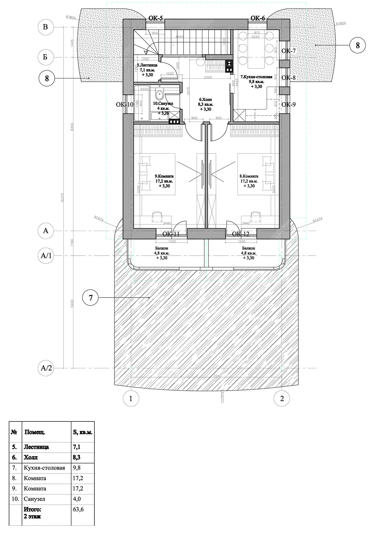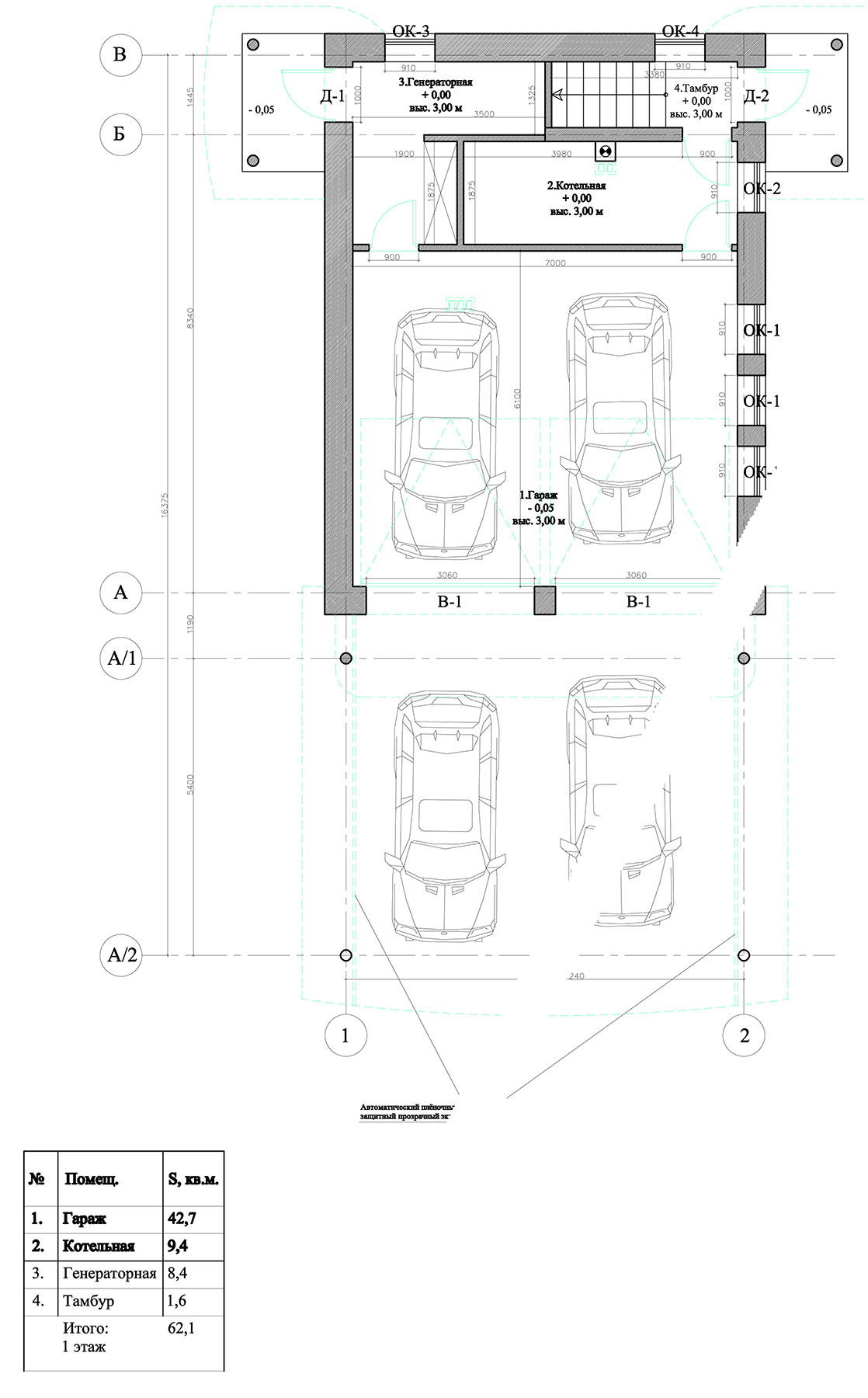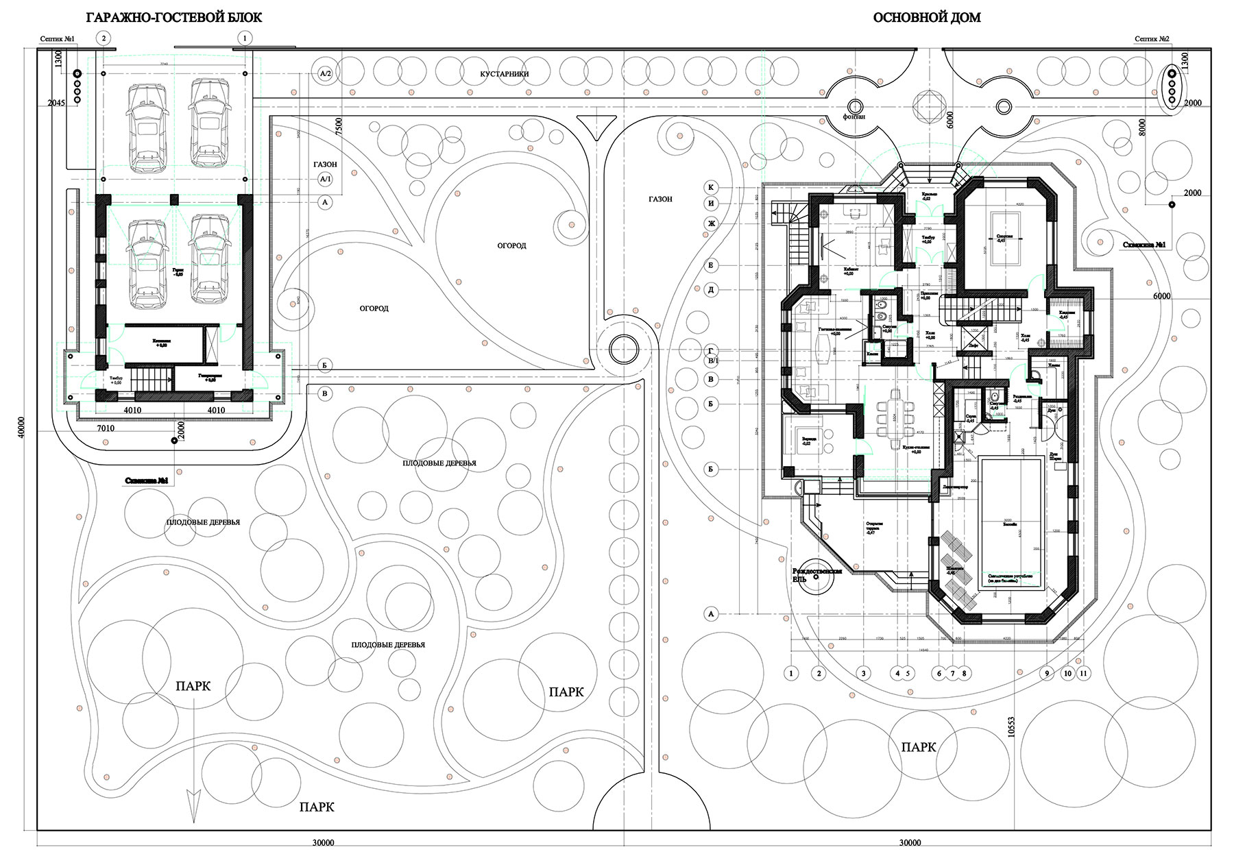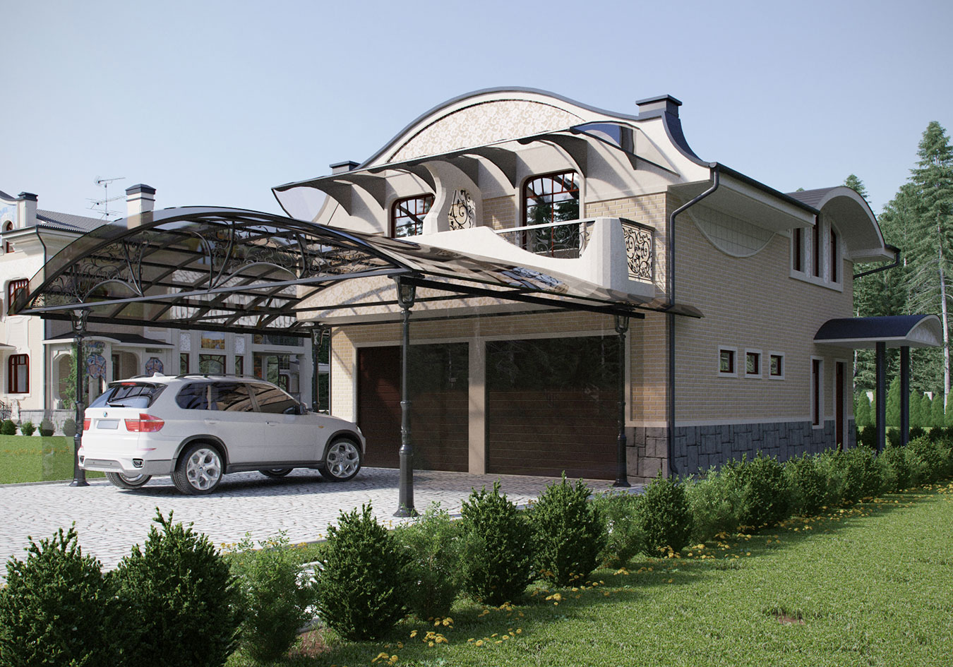 Гаражно-гостевой блок располагается вдоль западной стороны относительно плоского ровного участка, вытянутого с запада на восток. Фасады гаражно-гостевого блока также выдержаны в стиле московского модерна, как и основной дом.
