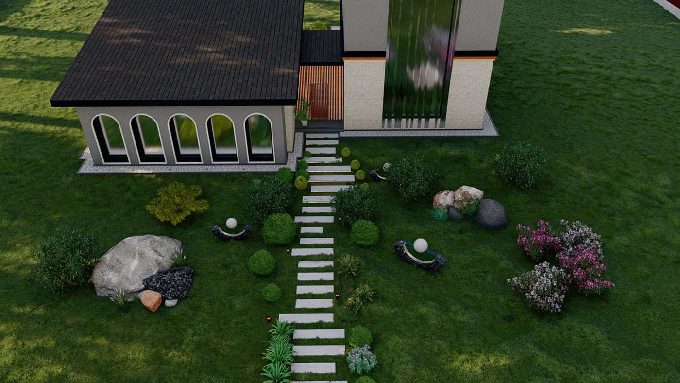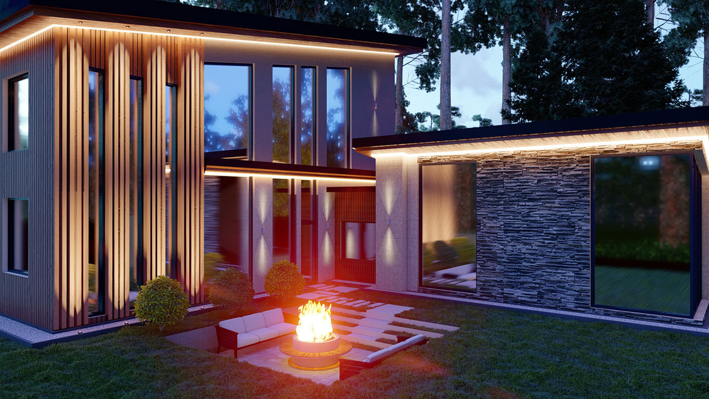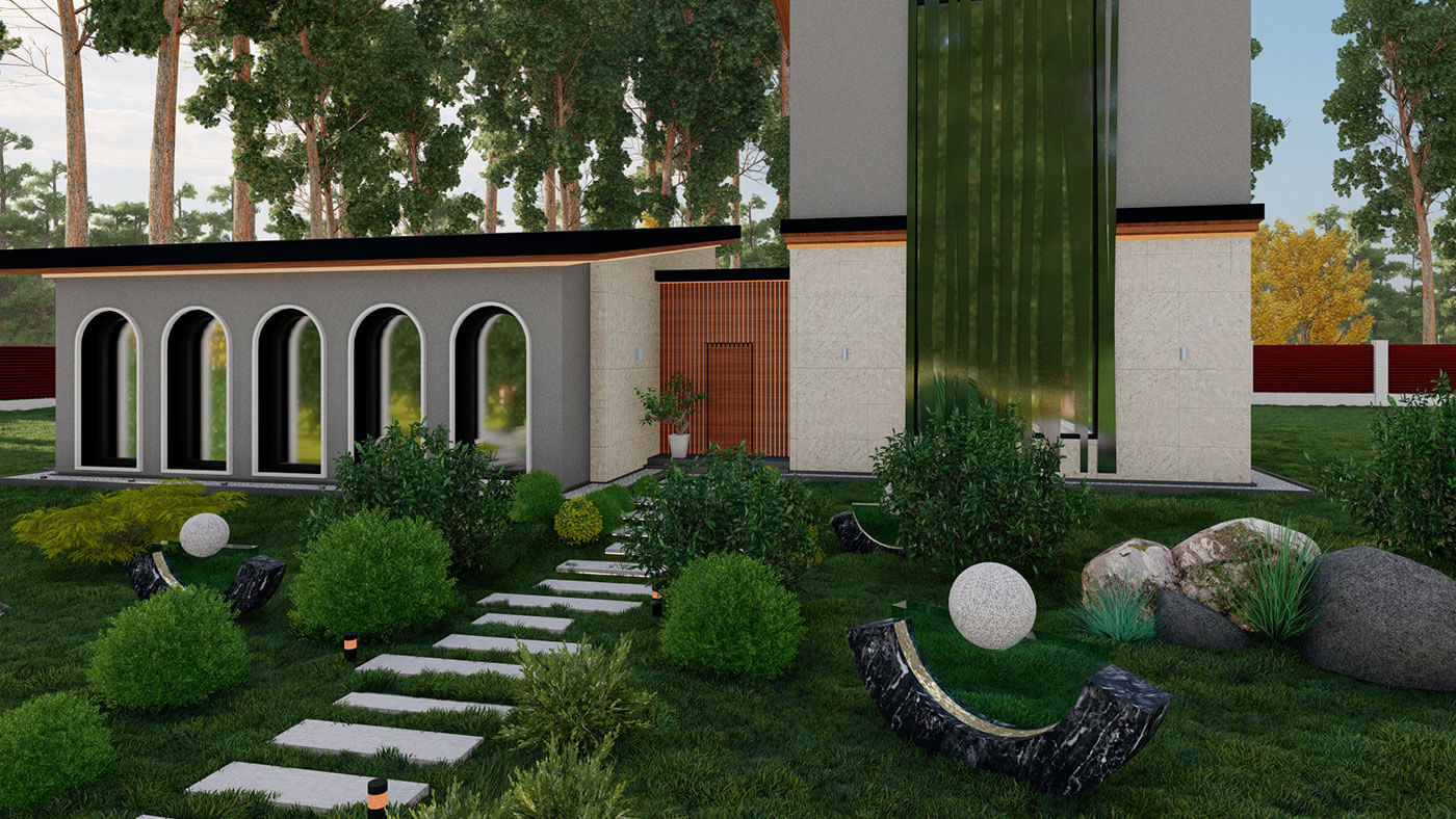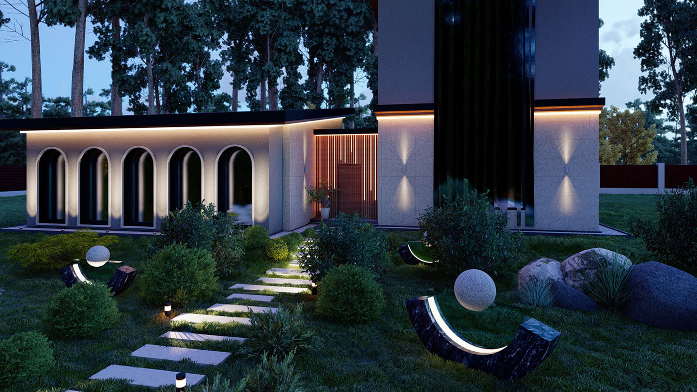 - ландшафт украшают точечные и минималистичные полукруглые дизайнерские светильники.