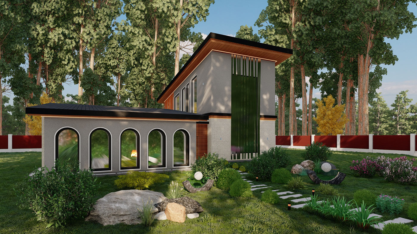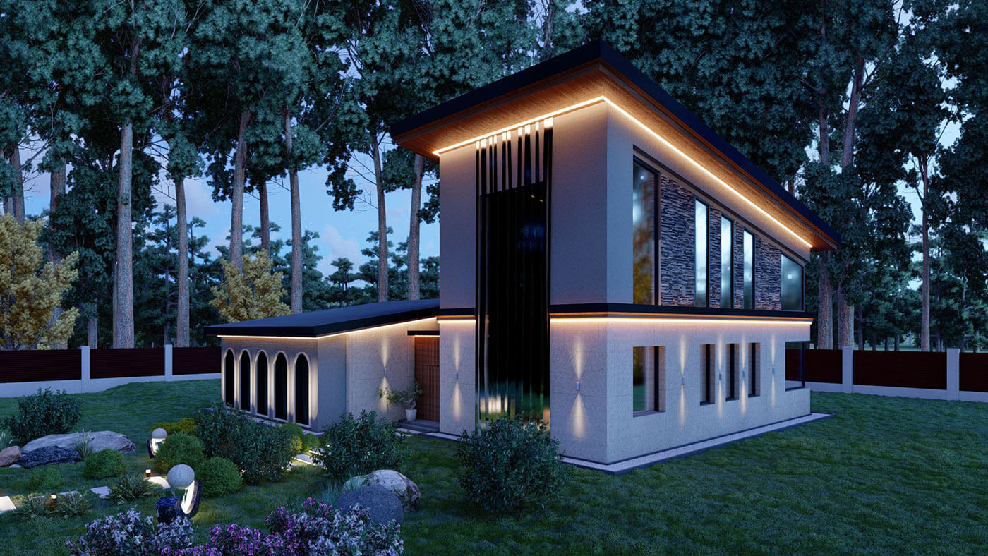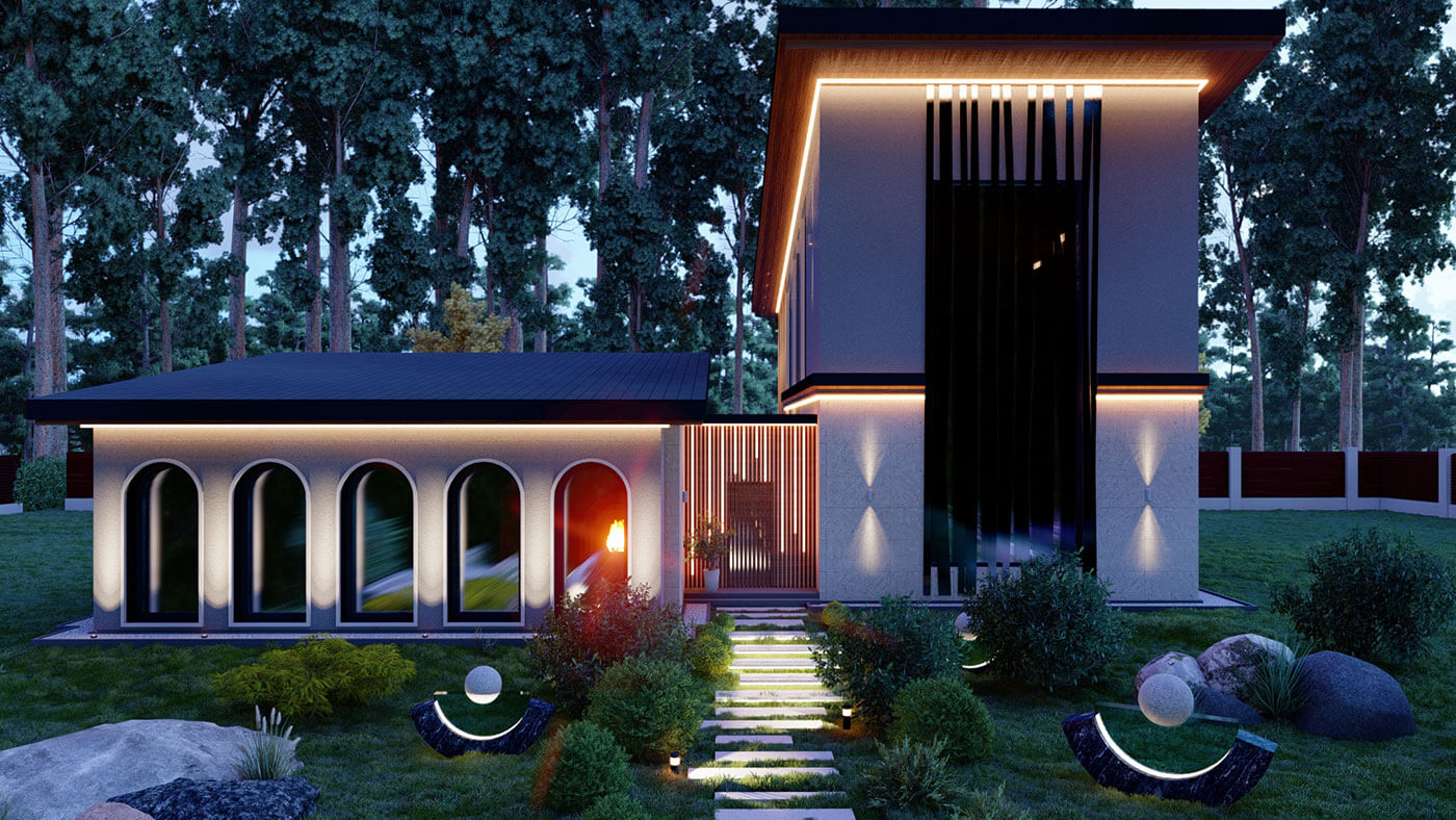 Одноэтажное здание с арками, в котором расположилась гостиная, и двухэтажное здание с 4мя спальнями и одним окном на 2 этажа с металлической инсталляцией образуют между собой в глубине фасада парадный вход, который украшен снаружи спускающейся ленточной подсветкой.