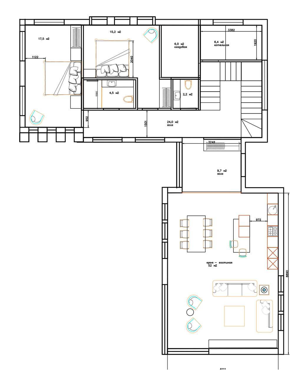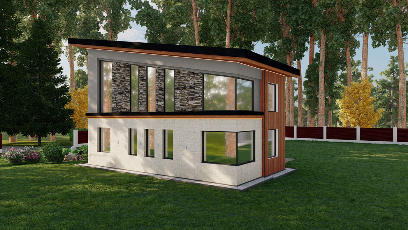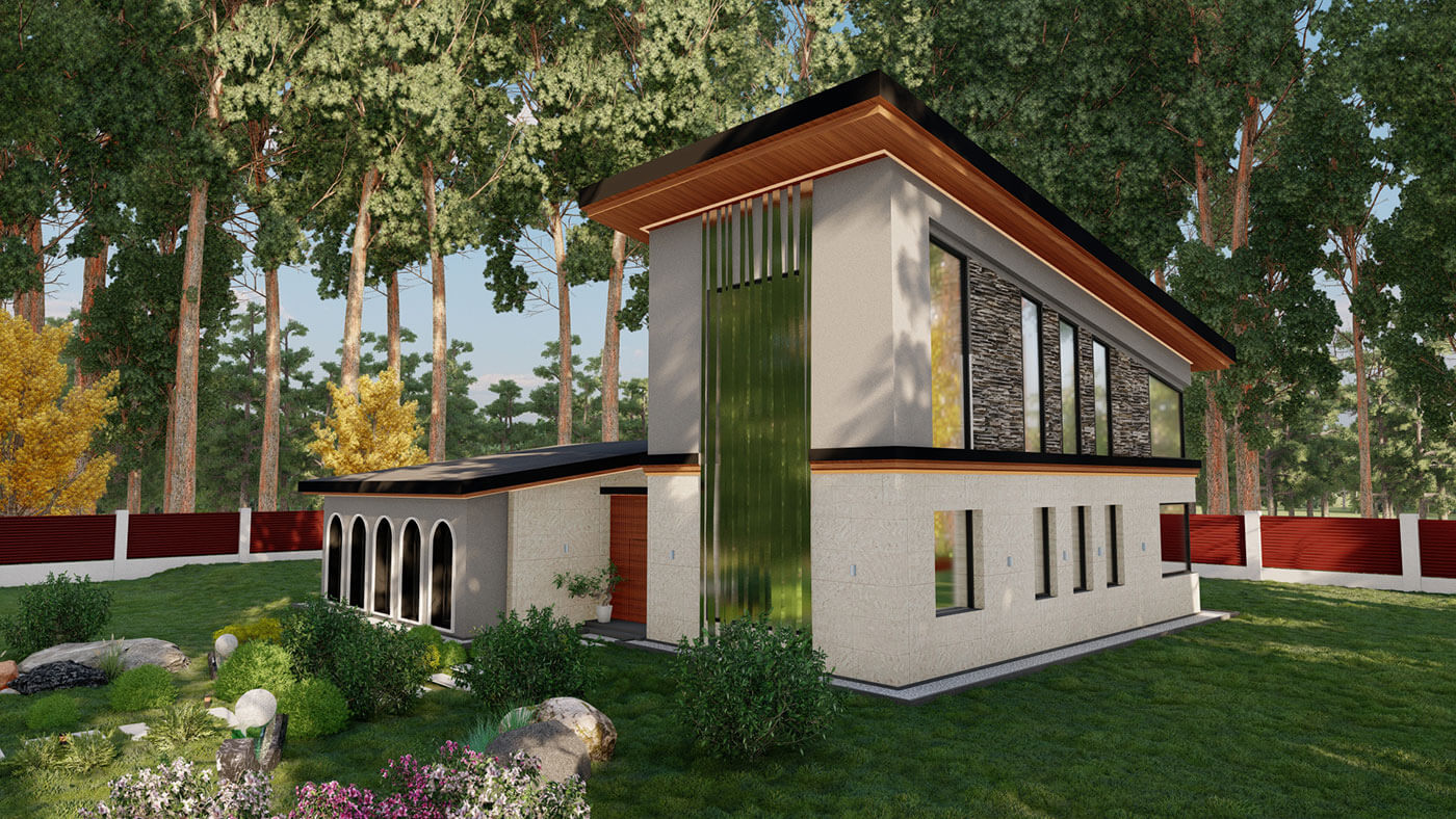 Заказчики дома – пара, которая захотела позволить себе жить на пенсии в нетривиальном неповторимом современном доме, отделанном натуральными материалами. Так как московская погода предполагает заснеженные зимы, то кровля по их техническому заданию обязательно должна быть скатной. Обычно дома со такими кровлями выглядят совсем непримечательно и несовременно. Здесь же, 2 будто самостоятельных дома образуют с определенного угла зрения общую скатную кровлю, хотя каждое здание имеет только один уклон, который внутри дома позволяет играться с интерьером: в гостиной огромное угловое окно расширяет и увеличивает объем гостиной, а в зоне спальных комнат скос кровли создает неправильную геометрию комнат для нестандартного дизайна.