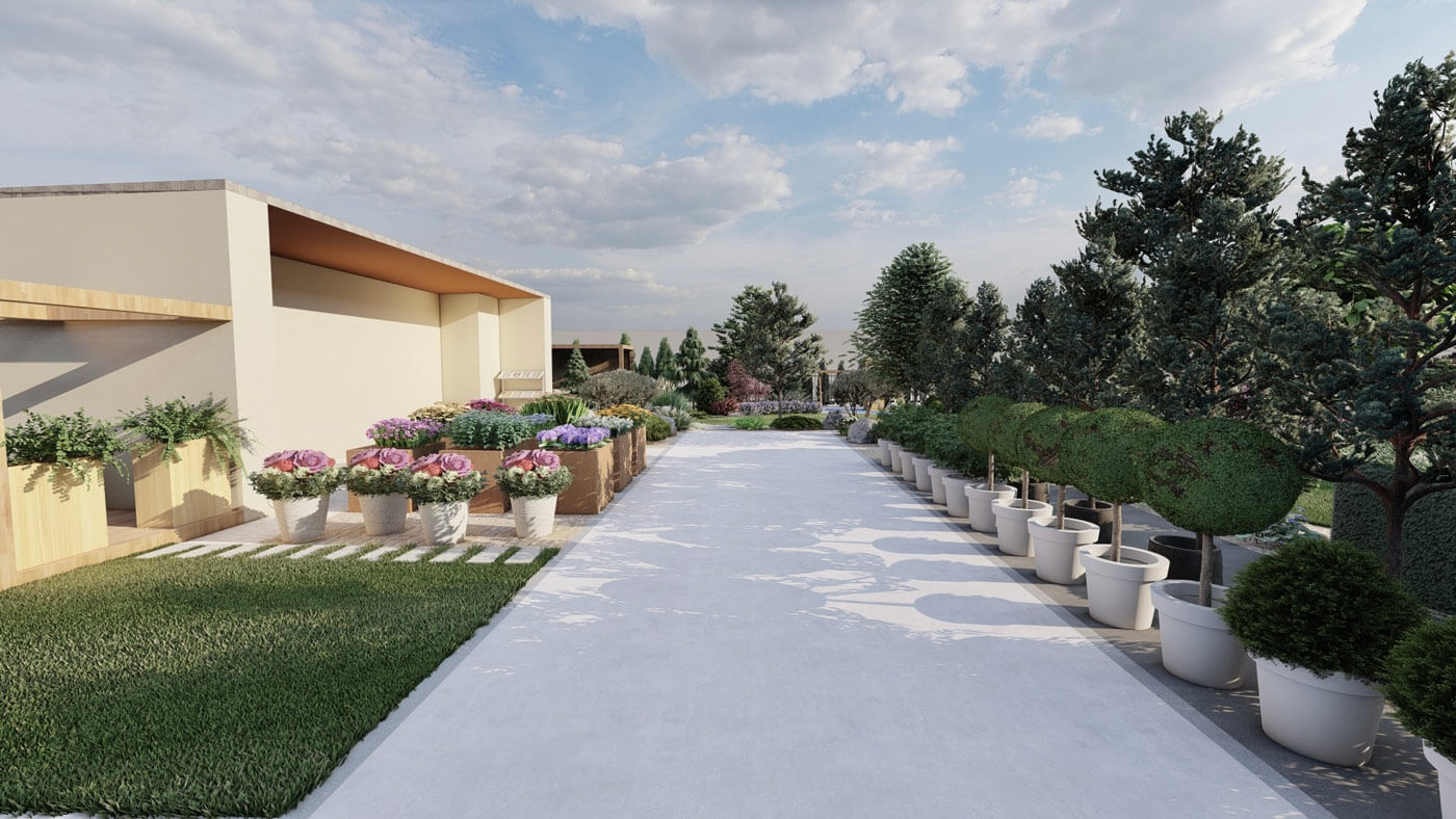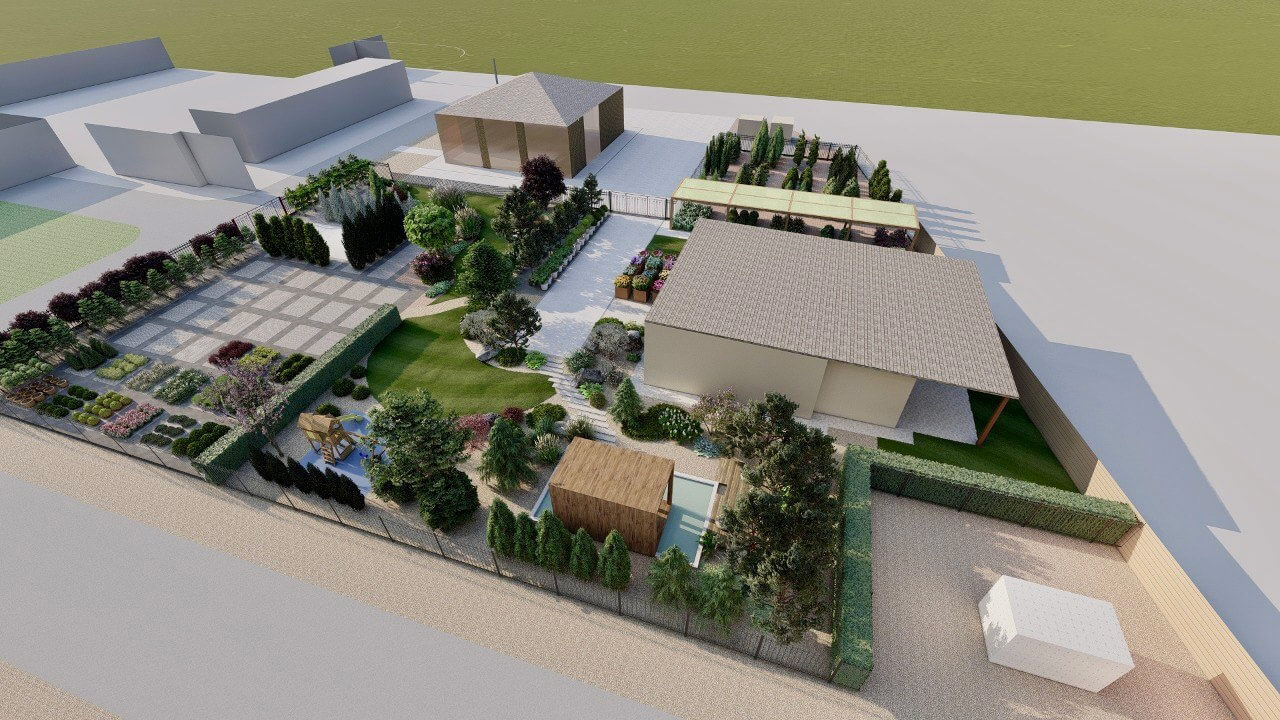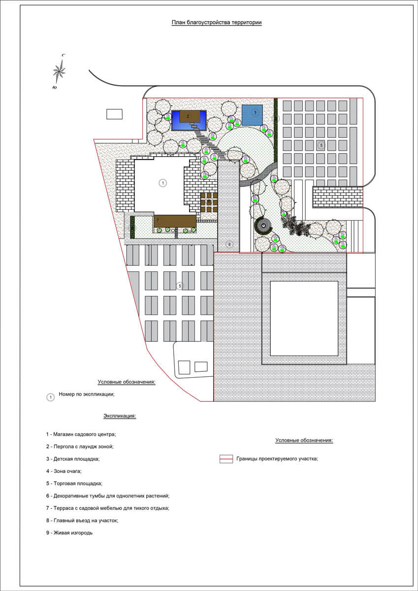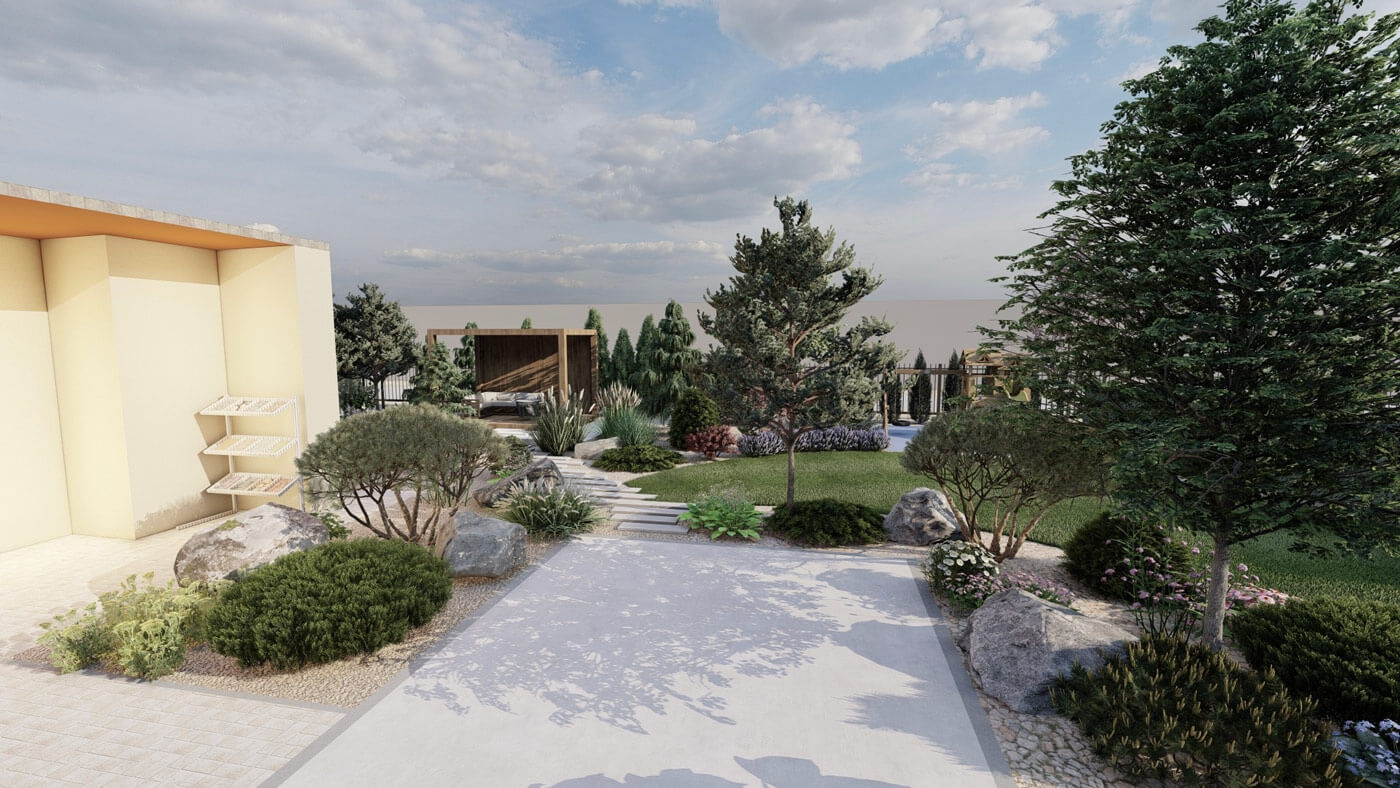 Выставочный сад при садовом центре будет располагаться в закрытом загородном поселке «Ясная Поляна», который будет иметь несколько сценариев организации пространства: торговая площадка, лаундж-зона в виде современных пергол с декоративным водоемом, детские площадки, зона очага, образцы садовой мебели. Сад предназначен для жителей поселка, как дополнительная зона отдыха, посетителей торговой зоны, гостей поселка. На территории также можно проводить event-мероприятия и мастер-классы. Отдельно хотелось бы обратить внимание на материалы, которые будут использованы при реализации проекта. Детские площадки будут выполнены из Robinia – экологичный, износостойкий и противоаллергенный материал. Перголы будут выполнены из массива дерева – это дополнительно погрузит посетителей в стиль джапанди и атмосферу умиротворения. На территории нет больший и массивных построек, вся концепция выстроена с максимальным приближением к природному стилю, также нет кричащих оттенков в отделке. Торговая зона: есть открытые зоны с навесом и без, и выставочная площадка, которую можно использовать круглый год. На выставочной зоне представлен ассортимент из садового инвентаря, декоративные кашпо, малогабаритная садовая мебель, сделанная вручную, декоративные бонсаи, а также выставочные образцы арт-объектов для ландшафтного дизайна. Прогулочная зона выделена декоративной отсыпкой, рулонным газоном и мощеными дорожками. Освещение: точечная подсветка определенных зон и растений, а также уличные светящиеся шары. Арт-объекты на территории будут представлены в виде каменных шаров для сада.