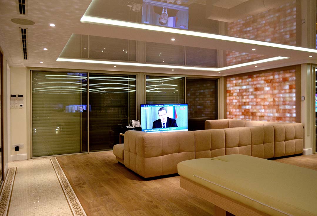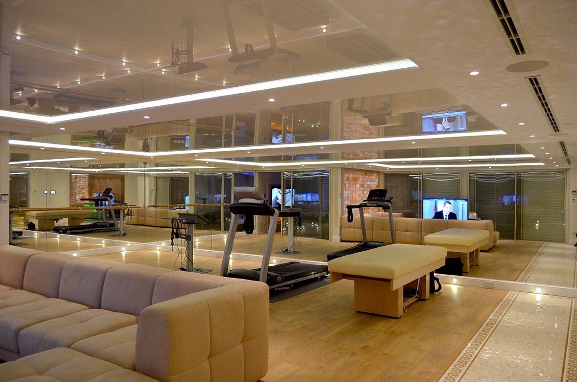 Спортивный зал отделан зеркалами с устройством балетного станка. Лаковый натяжной потолок — декоративный прием, примененный для визуального увеличения ограниченной высоты помещения. В качестве подсветки по периметру потолка использован специальный торцевой профиль, исключающий отражение ленточной подсветки на лаковых поверхностях. Солевые кирпичи с подсветкой, использованные в сауне, служат еще и в качестве одной из стен спортзала для стилевого объединения помещений и усиления оздоровительного эффекта.