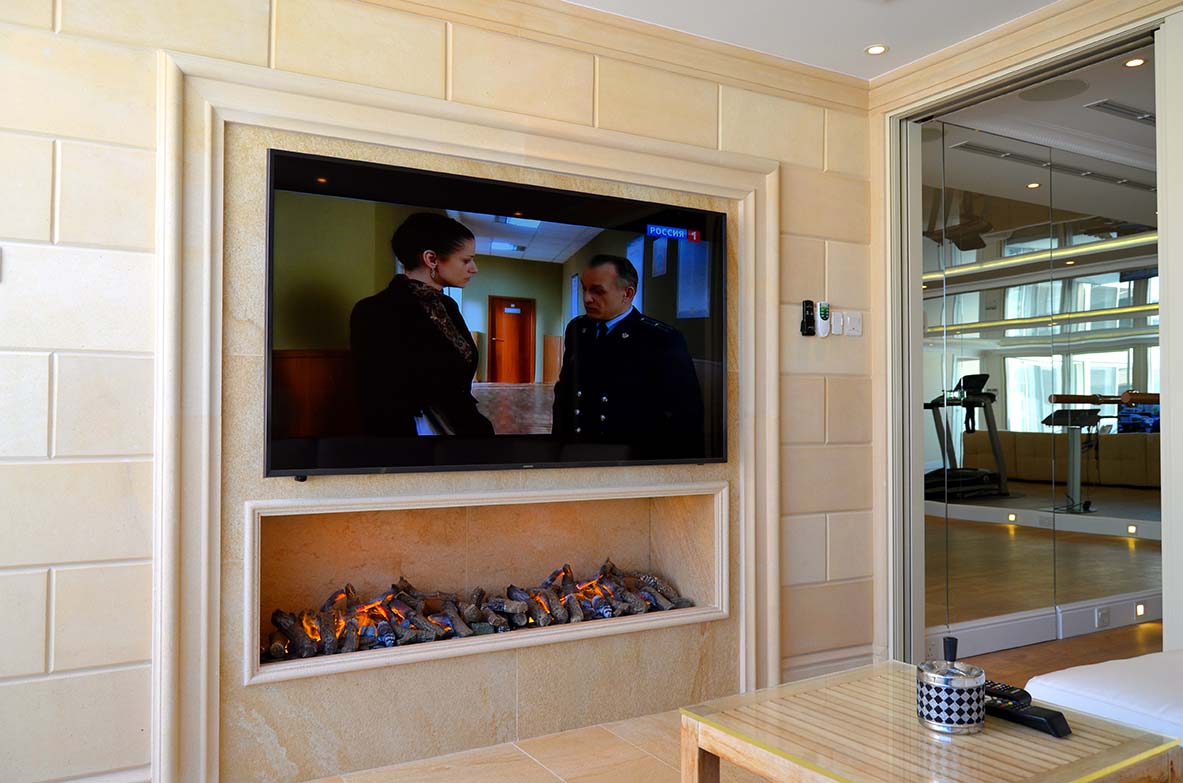 Зона отдыха оборудована паровым камином с трехмерным эффектом живого пламени, который из-за климатических особенностей и расположения на крыше не выполняет функцию обогрева дома, но создает атмосферу уюта и тепла.