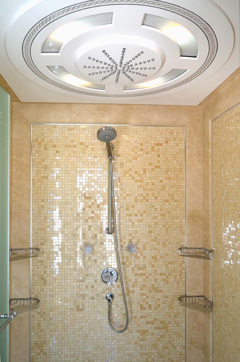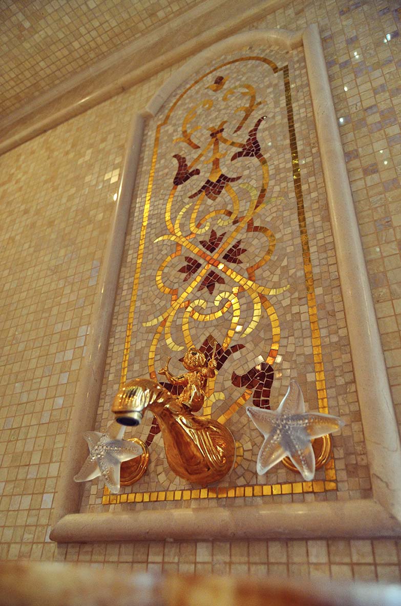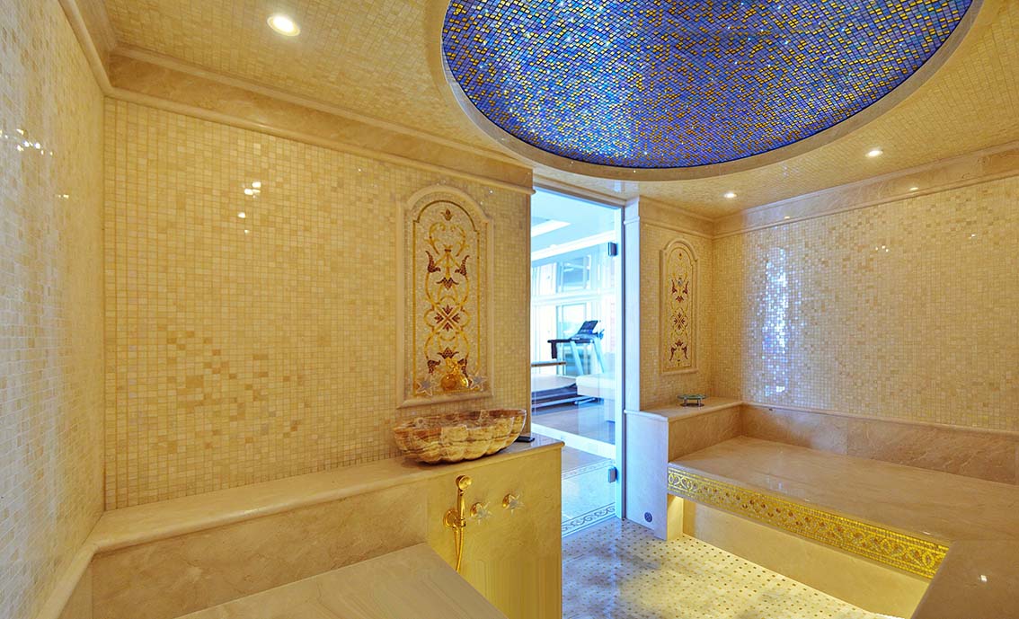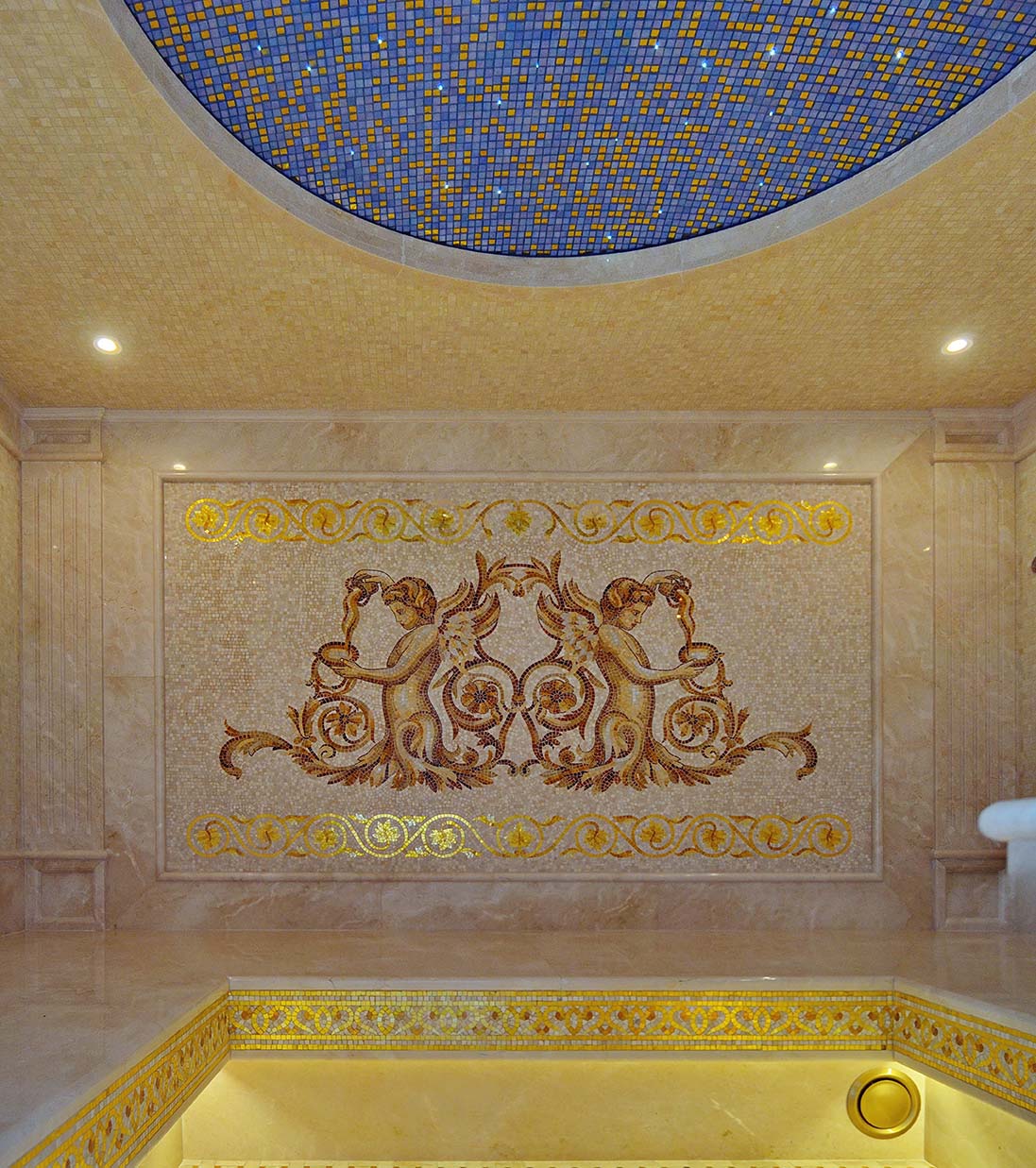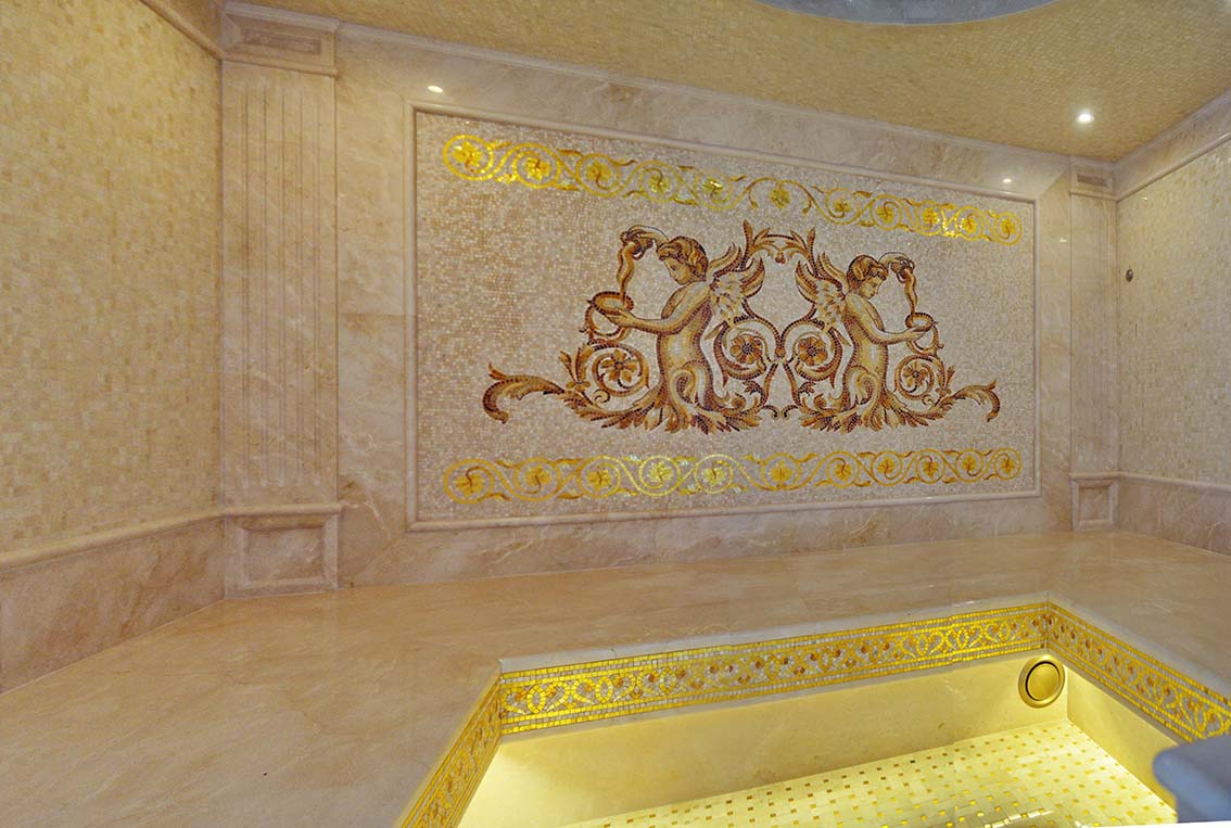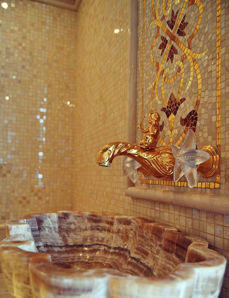 Паровая комната выполнена из мрамора Crema Marfil, скомбинированного с керамической мозаикой от компании «Марацци» и мраморными мозаиками фирмы Friul. Выбранный для паровой классический стиль поддерживают позолоченные смесители в стиле барокко и раковина из цельного куска янтарного оникса.