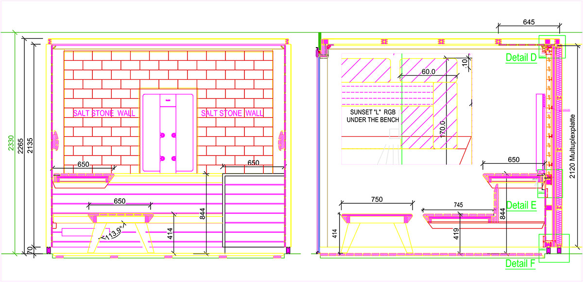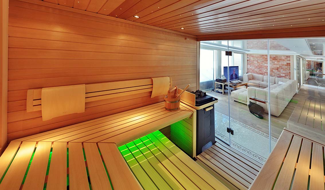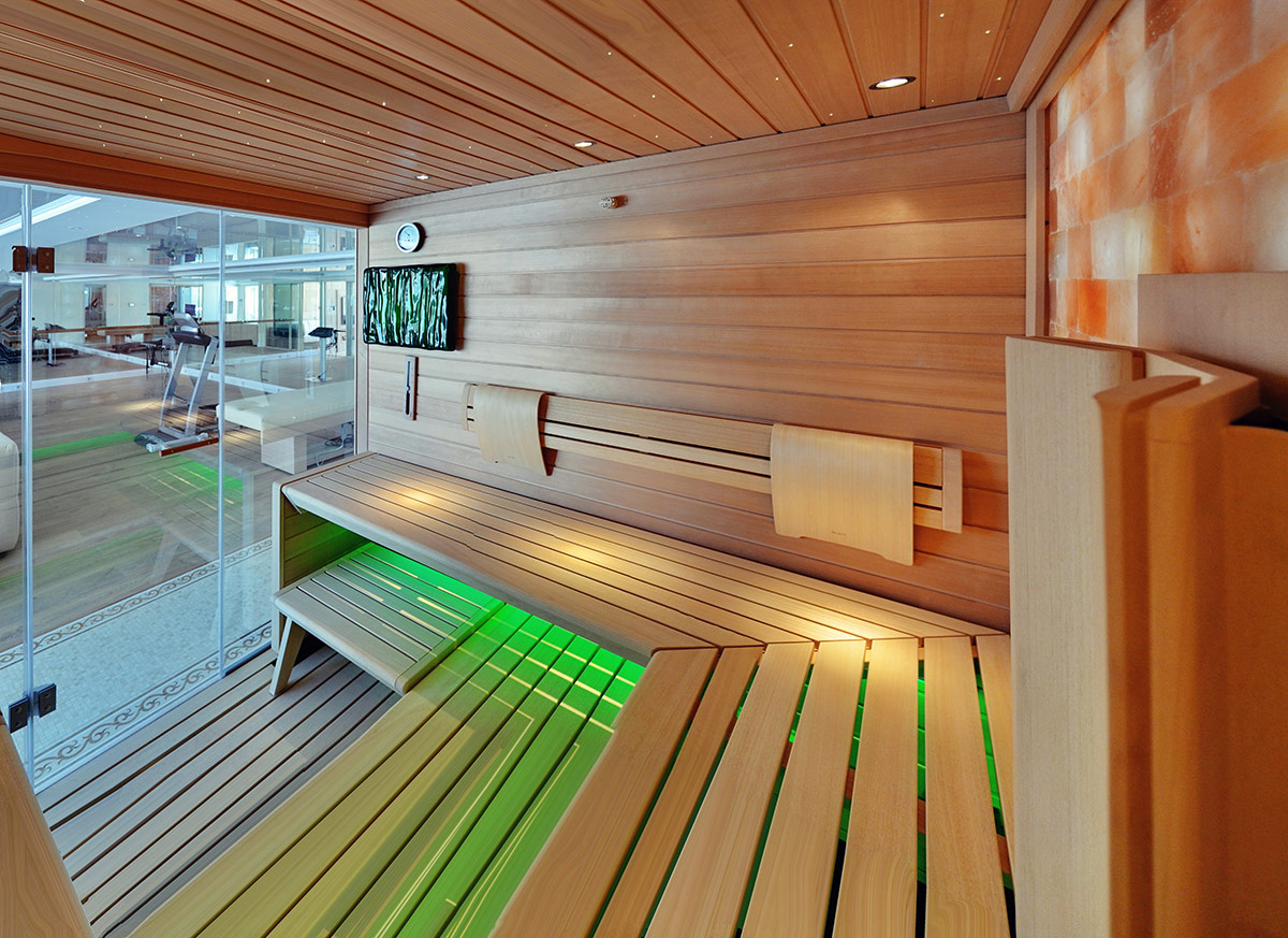 Сауна выполнена на заказ по эскизам дизайнера компанией KLAFS. Проект выделяют эргономичные нижние сиденья-скамьи и инфракрасная панель, вмонтированная в стену с солевыми кирпичами. «Звездное небо», цветозвуковое устройство AQUAVIVA, вмонтированная под сиденья LED-подсветка и солевые кирпичи — все располагает к отдыху и релаксации.